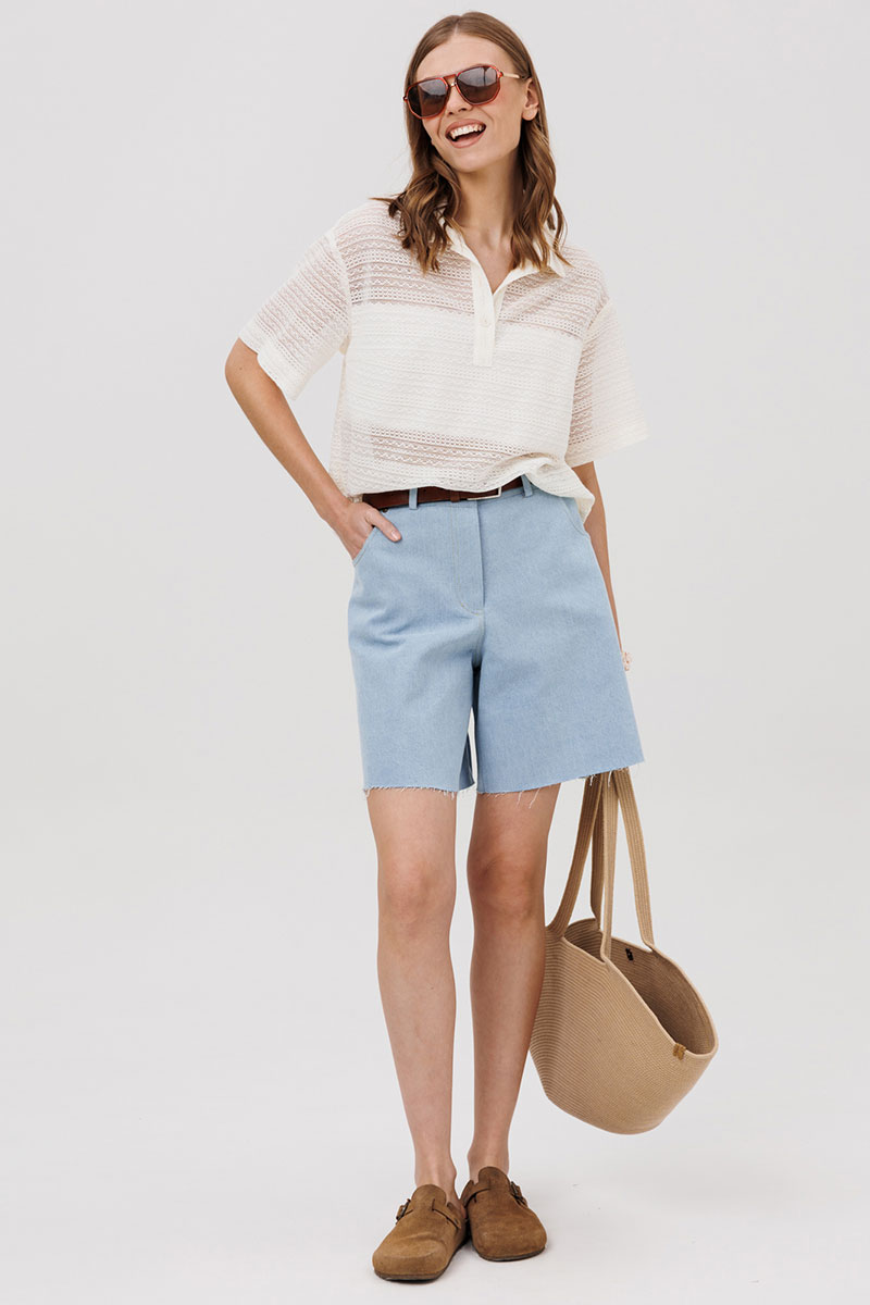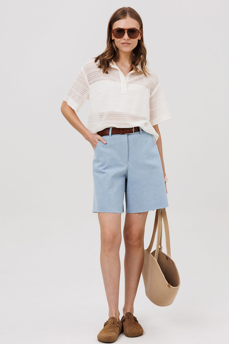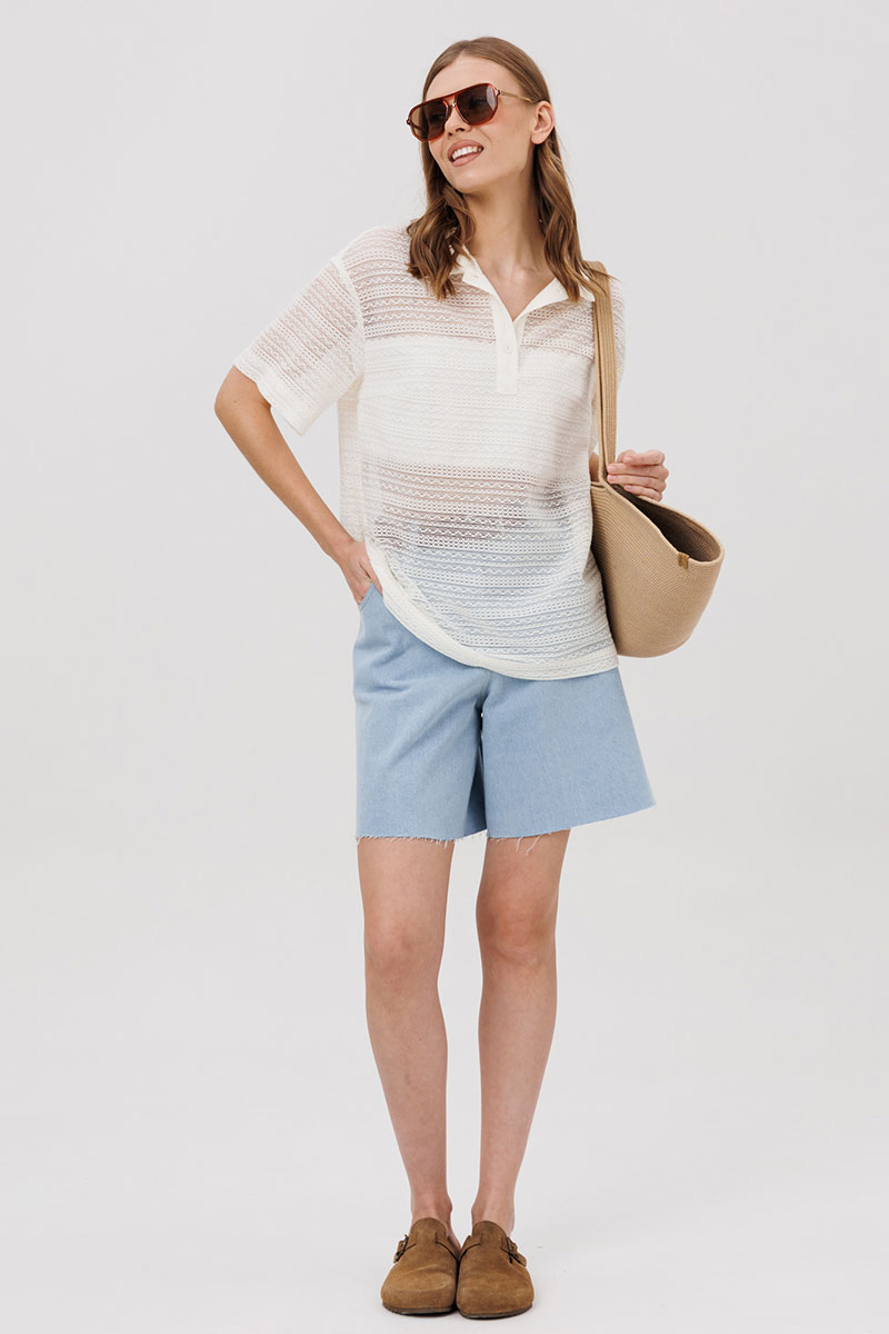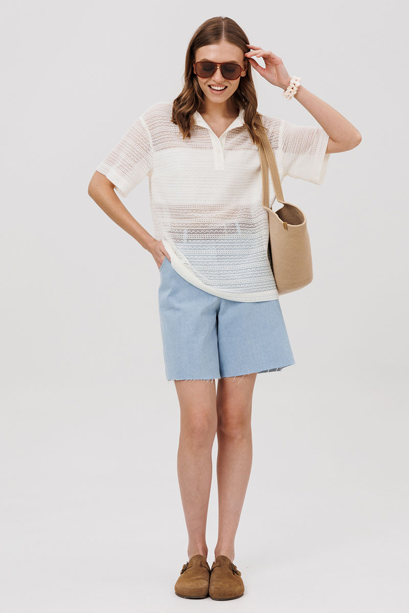 Комплект женский, состоящий из джинсовых шорт и майки поло, выполненной из ажурной сетки.