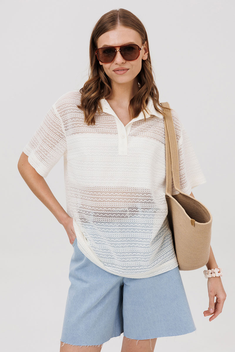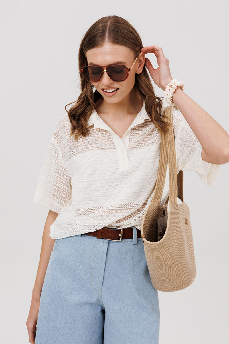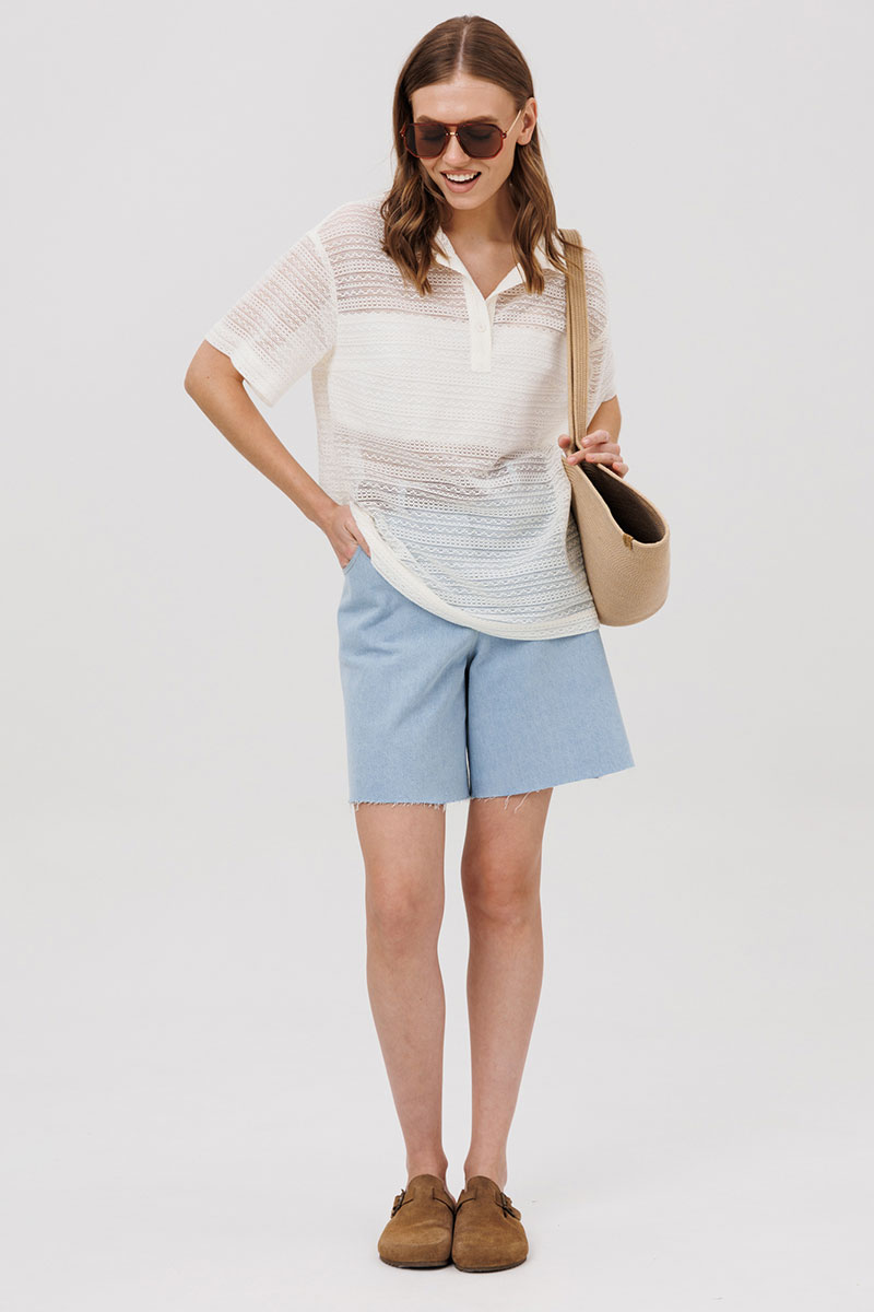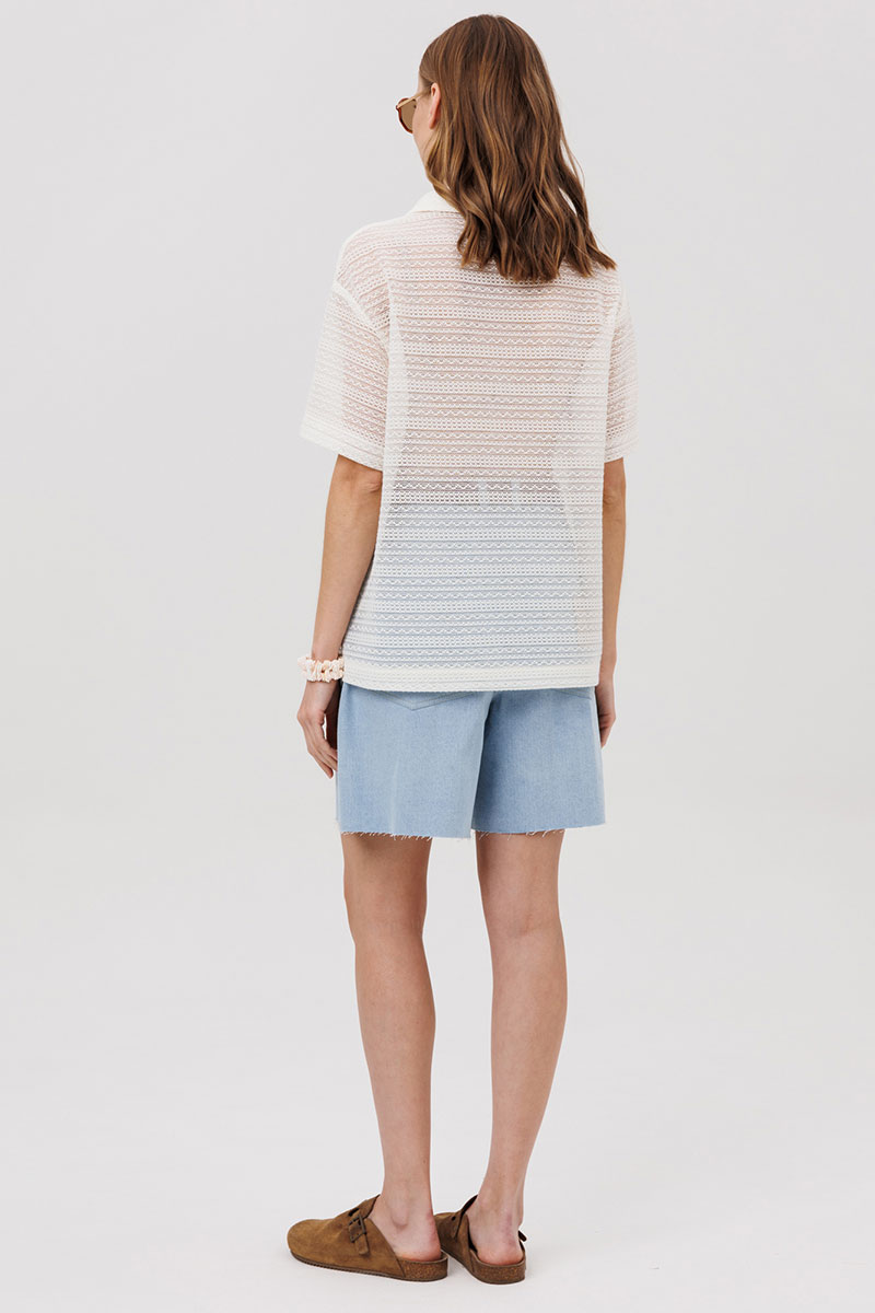 Комплект женский, состоящий из джинсовых шорт и майки поло, выполненной из ажурной сетки.