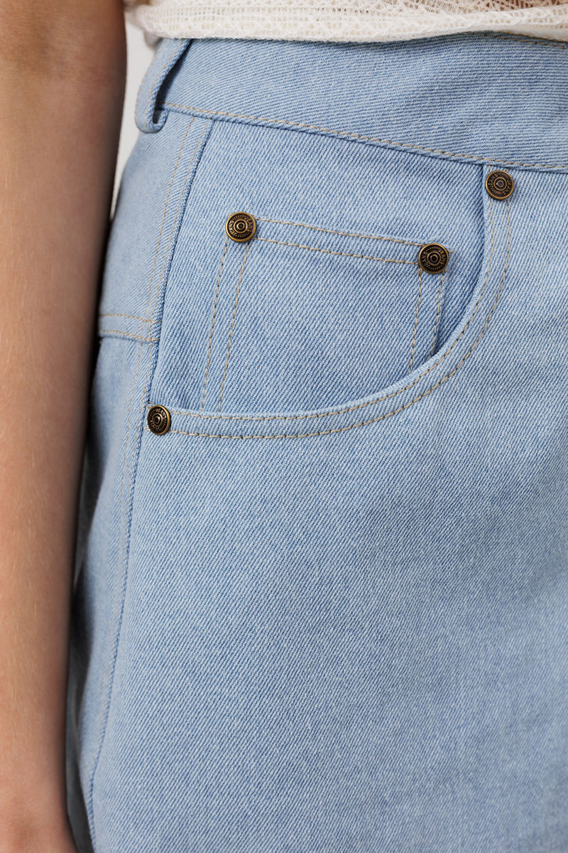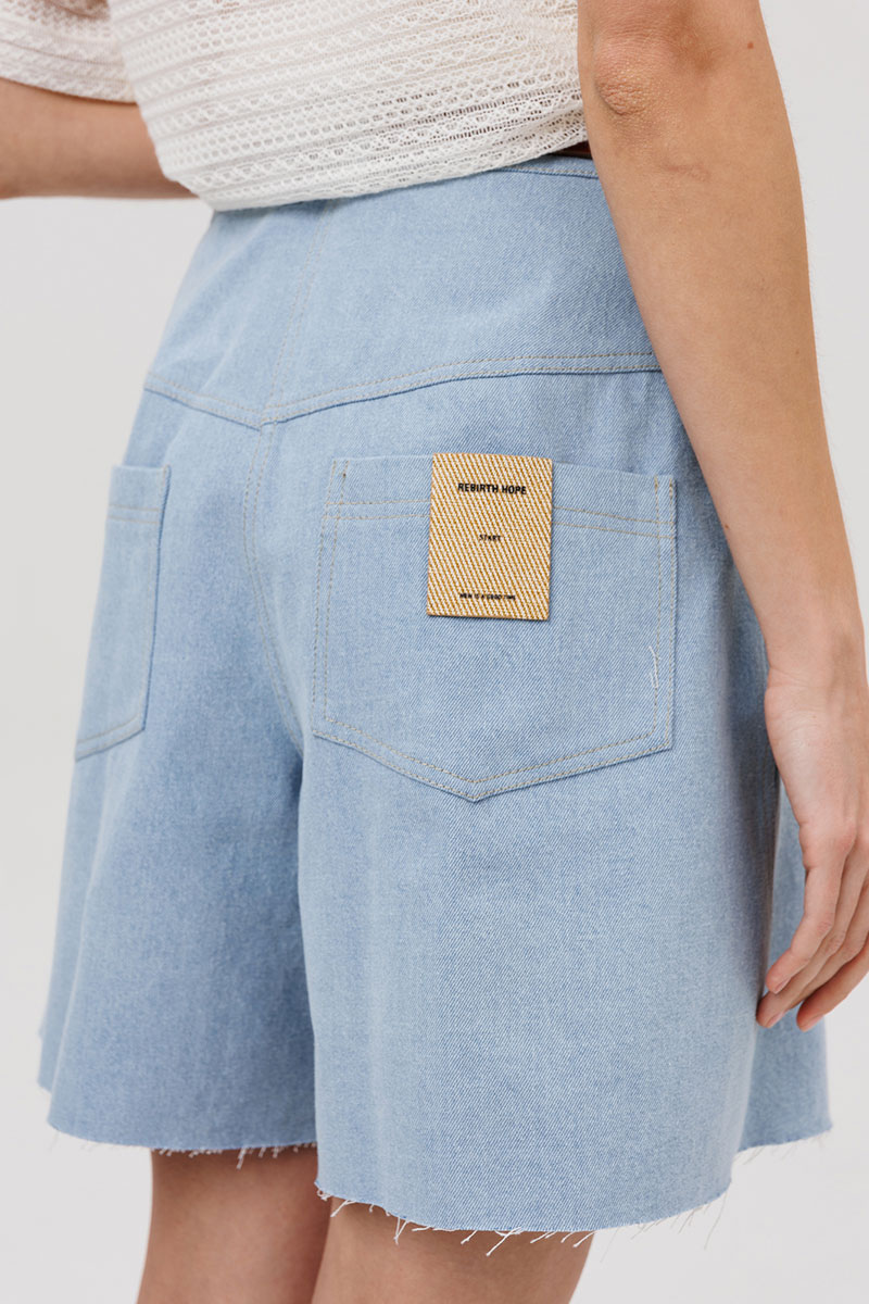 Шорты расширенные книзу, с застежкой на тесьму молнию с гульфиком и откоском, с притачным поясом, со шлевками. Передние половинки шорт с карманами. По левому боку - с дополнительным накладным мини-кармашком и хольнитенами по бокам накладного кармашка и по фигурному карману у боковых швов и пояса. Задние половинки шорт – с кокетками и накладными карманами.На правом кармане – декоративная нашивка. Шорты по низу - с необработанным краем.