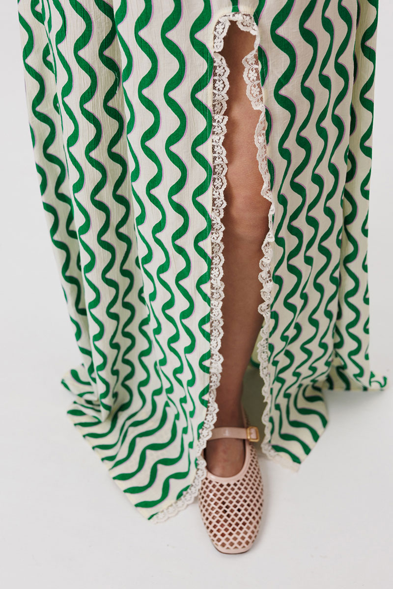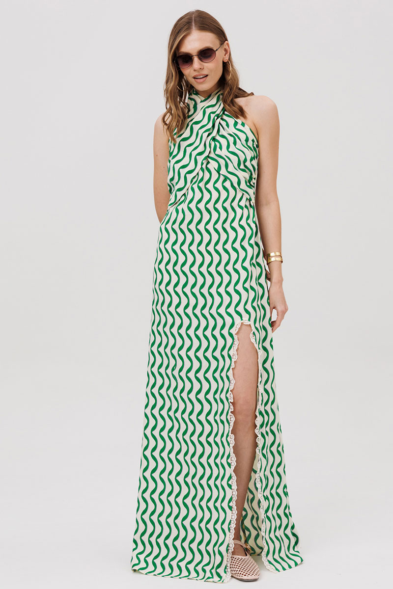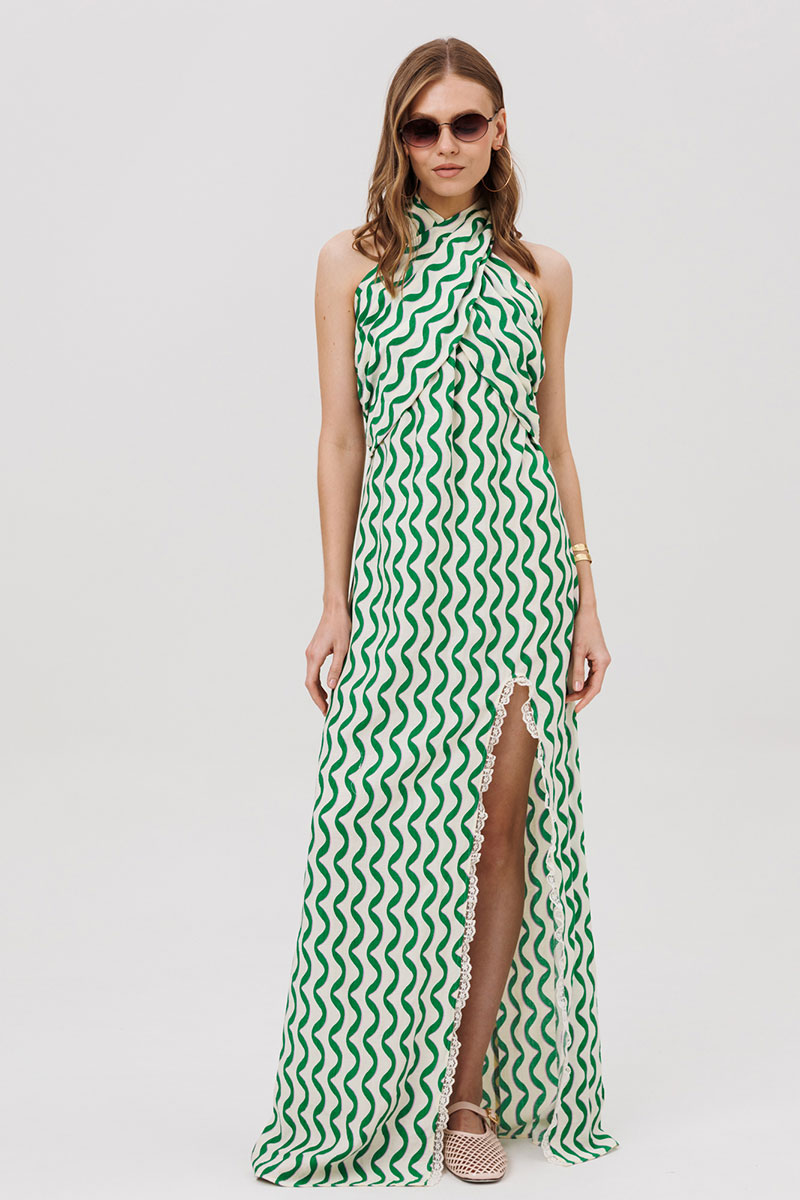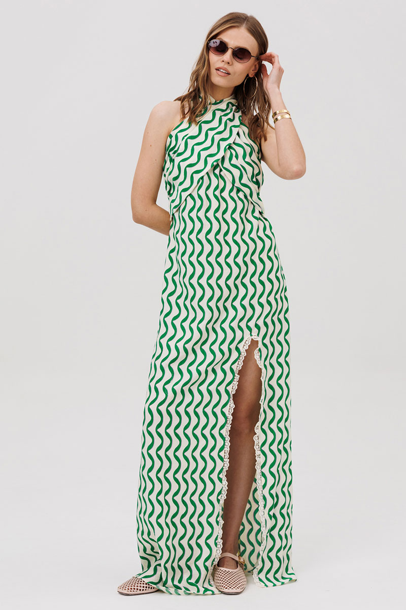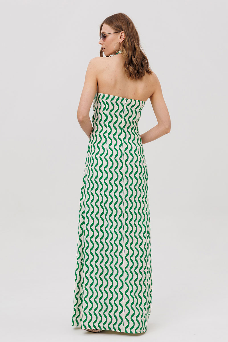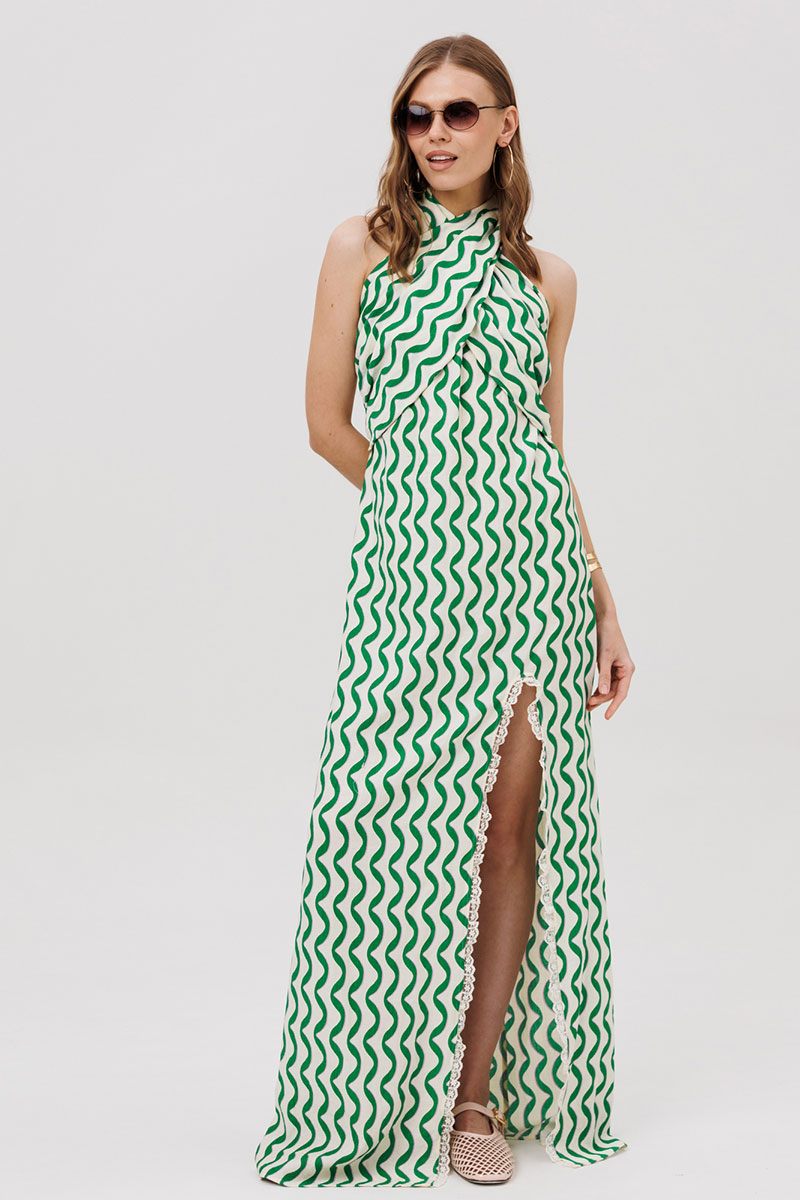 Платье женское, длинное, А-силуэта, с застежкой на потайную тесьму-молнию в среднем шве спинки. Перед - с верхними деталями лифа со сборкой по боку, застегивающиеся на 4 петли и пуговицы на шее сзади, с разрезом по левой ноге. По разрезу притачана рюша. Спинка- со средним швом и талиевыми вытачками. По верху лифа настрочена резинка для дополнительного прилегания.