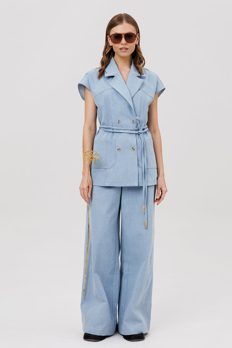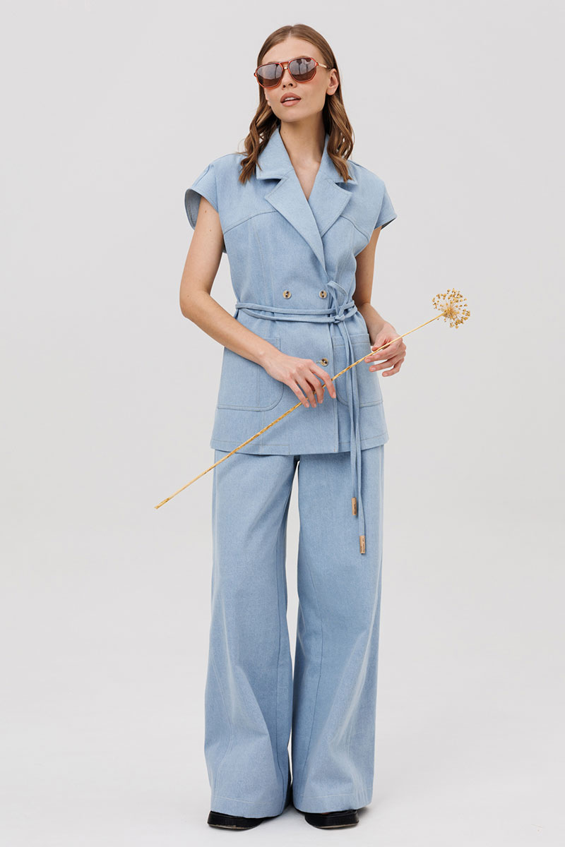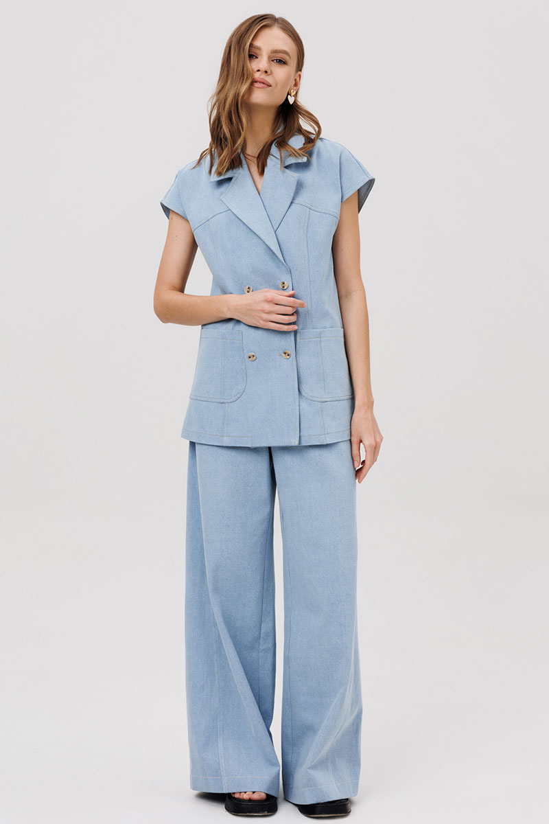Костюм женский, состоящий из брюк и жилета; выполнен из джинсовой ткани.