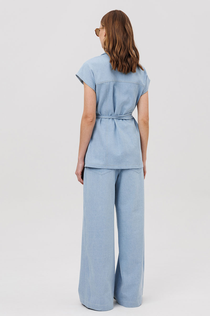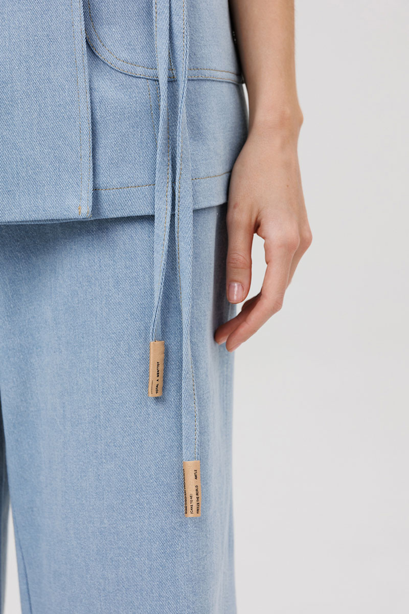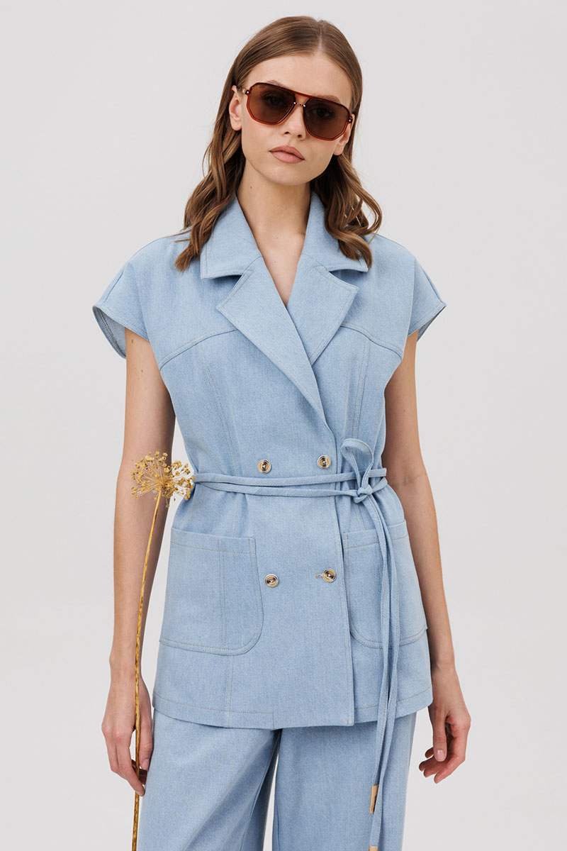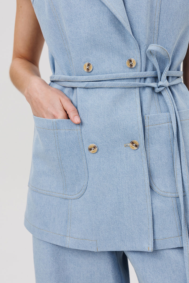 Костюм женский, состоящий из брюк и жилета; выполнен из джинсовой ткани.