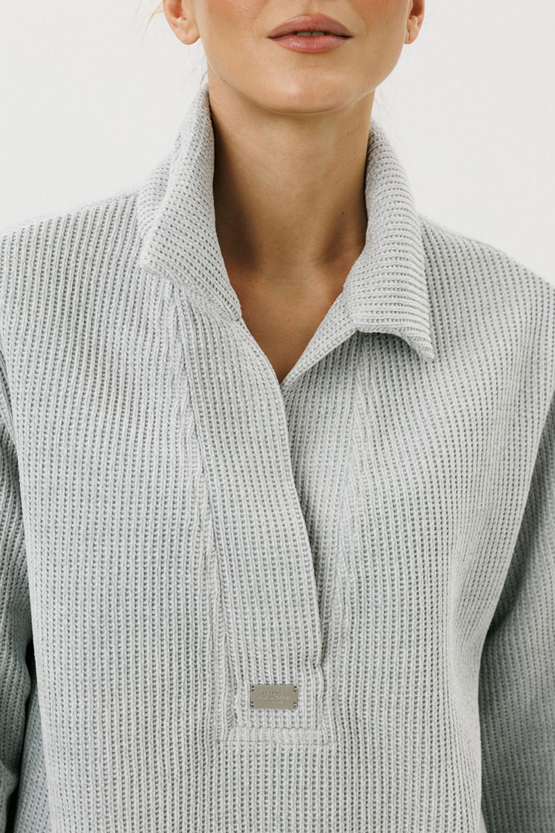 Перед с вырезом по горловине, обработанным широкими планками. Внизу планки расположена декоративная металлическая пластинка. декоративная металлическая пластинка. Спинка без конструктивных элементов. Воротник стояче-отложной. Рукава рубашечного типа одношовные длинные.
