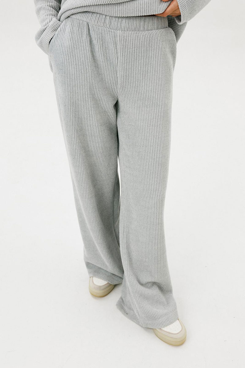 Брюки с притачным поясом на резинке, расширенные книзу. На передних половинках обработаны боковые карманы.