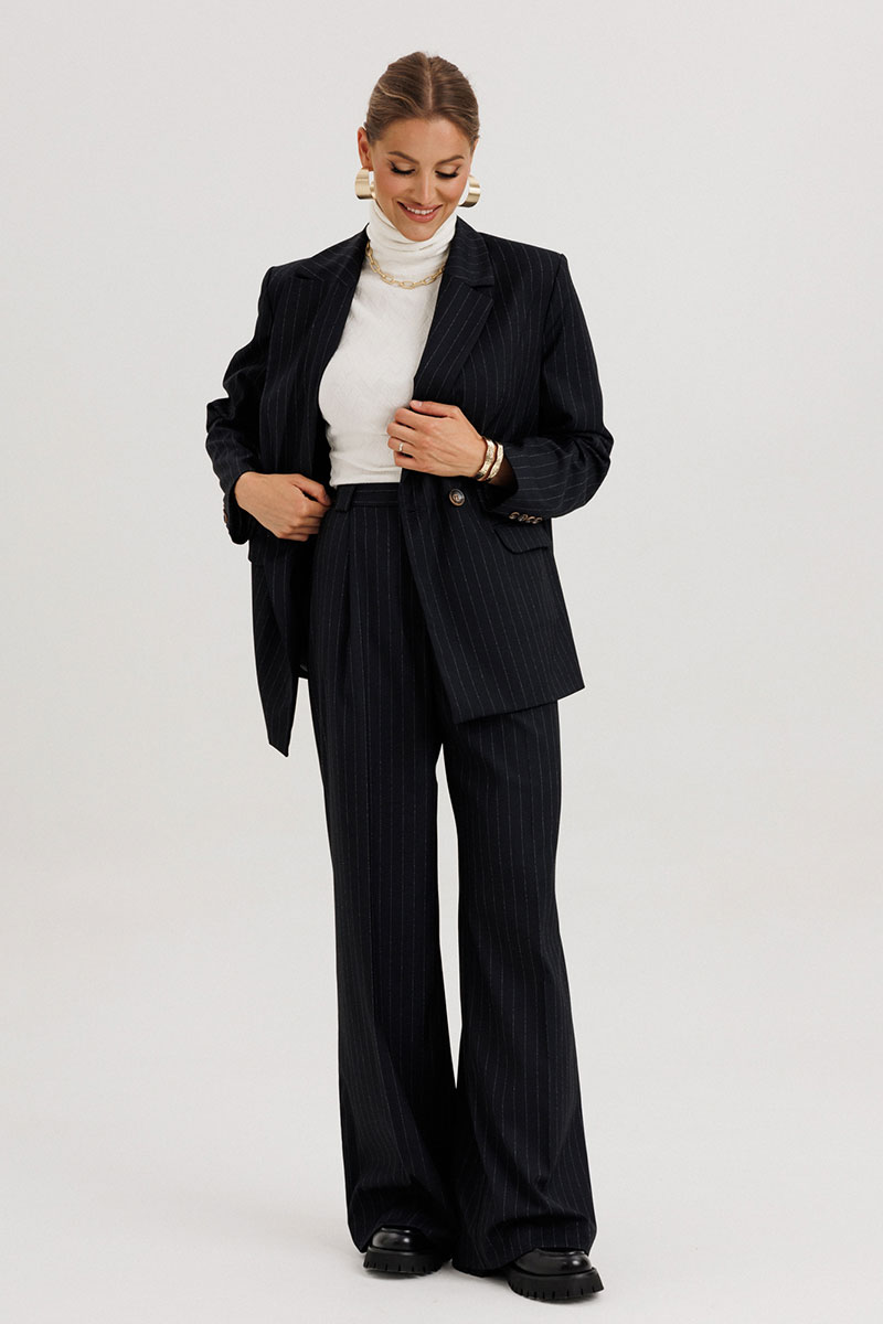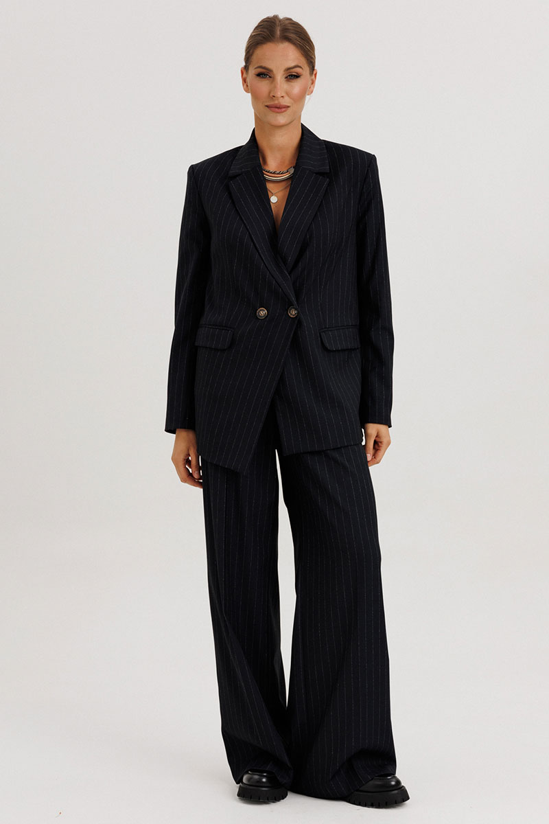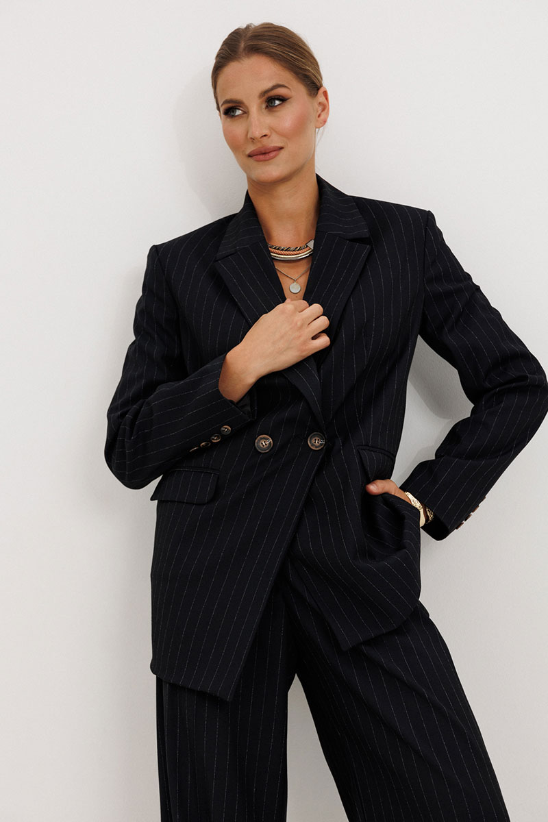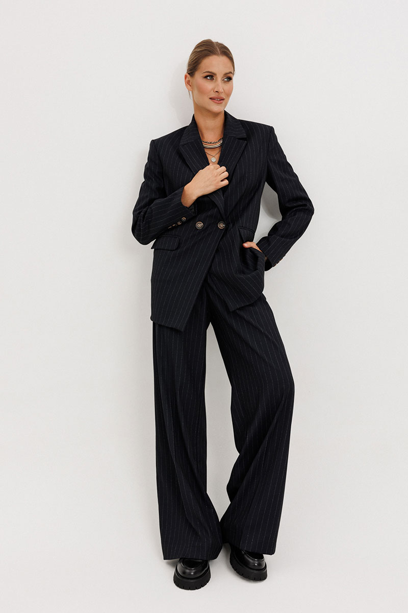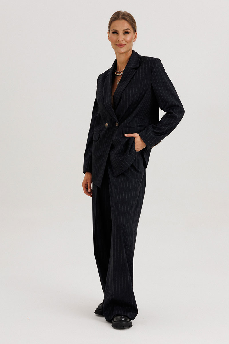 Жакет прямого силуэта с двубортной застежкой на 2 петли и пуговицы. Полочки - с прорезными карманами с клапаном и 2-мя обтачками, с нагрудными вытачками от кармана вверх. Низ переда асимметричный. Правая полочка удлинена к борту. Спинка со средним швом и рельефами от низа до проймы. Воротник пиджачного типа с отложными лацканами. Рукава длинные втачные 2-хшовные, с передним и локтевым швами. В нижней части локтевого шва обработана закрытая шлица с 4-мя пуговицами. Жакет на подкладке и с плечевыми накладками.