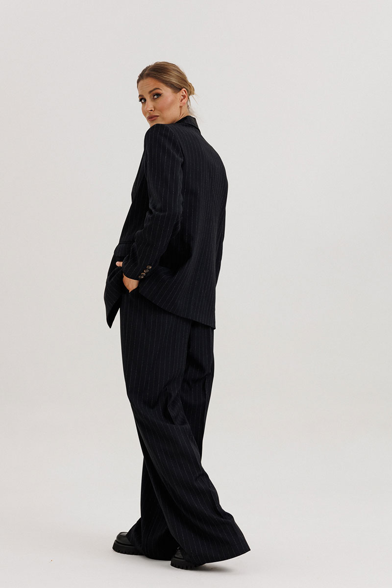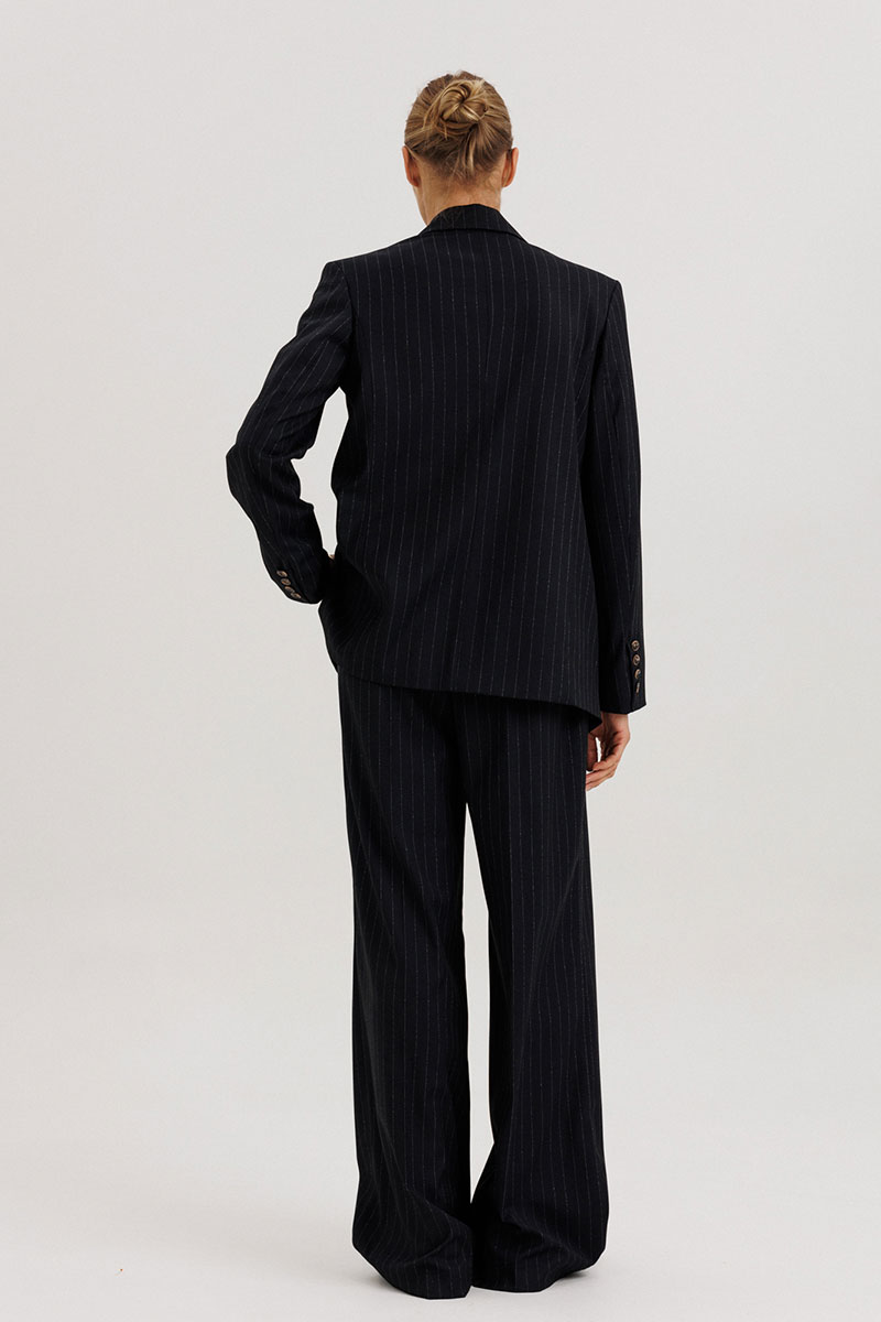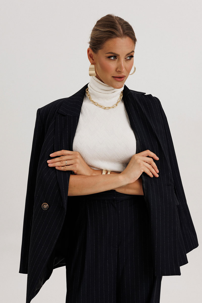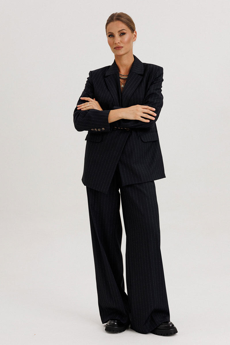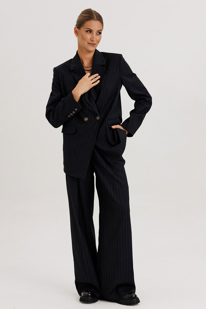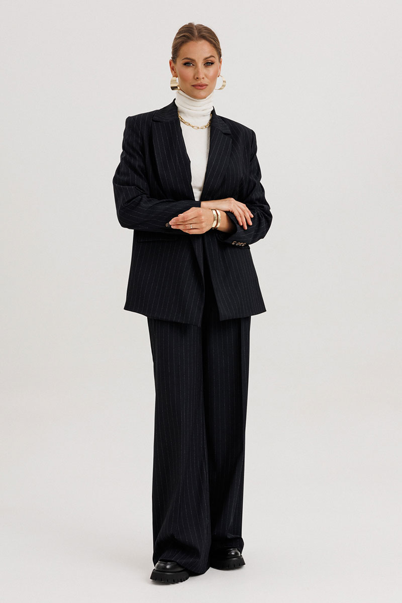 Жакет прямого силуэта с двубортной застежкой на 2 петли и пуговицы. Полочки - с прорезными карманами с клапаном и 2-мя обтачками, с нагрудными вытачками от кармана вверх. Низ переда асимметричный. Правая полочка удлинена к борту. Спинка со средним швом и рельефами от низа до проймы. Воротник пиджачного типа с отложными лацканами. Рукава длинные втачные 2-хшовные, с передним и локтевым швами. В нижней части локтевого шва обработана закрытая шлица с 4-мя пуговицами. Жакет на подкладке и с плечевыми накладками.