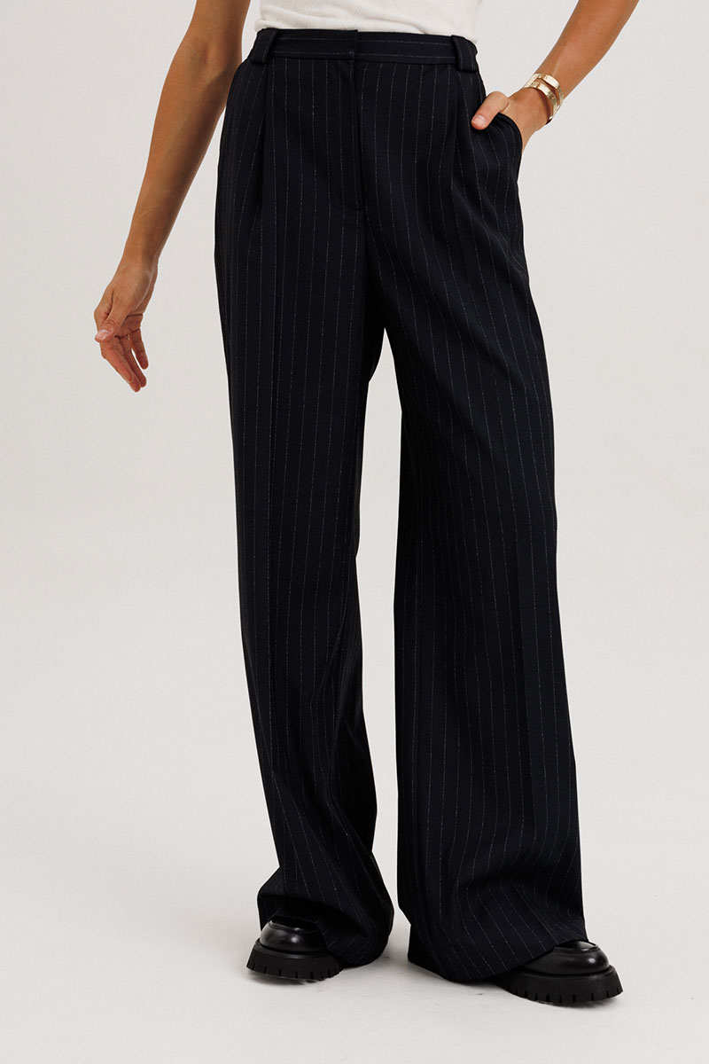 Брюки - палаццо с застежкой с гульфиком и откоском на тесьму-молнию; с притачным поясом с резинкой по спинке. Пояс со шлевками (2 широкие -по переду и 3 узких по спинке). Пояс застегивается на потайной крючок. Передние половинки брюк со складками и боковыми карманами. Задние половинки брюк с талиевыми вытачками.