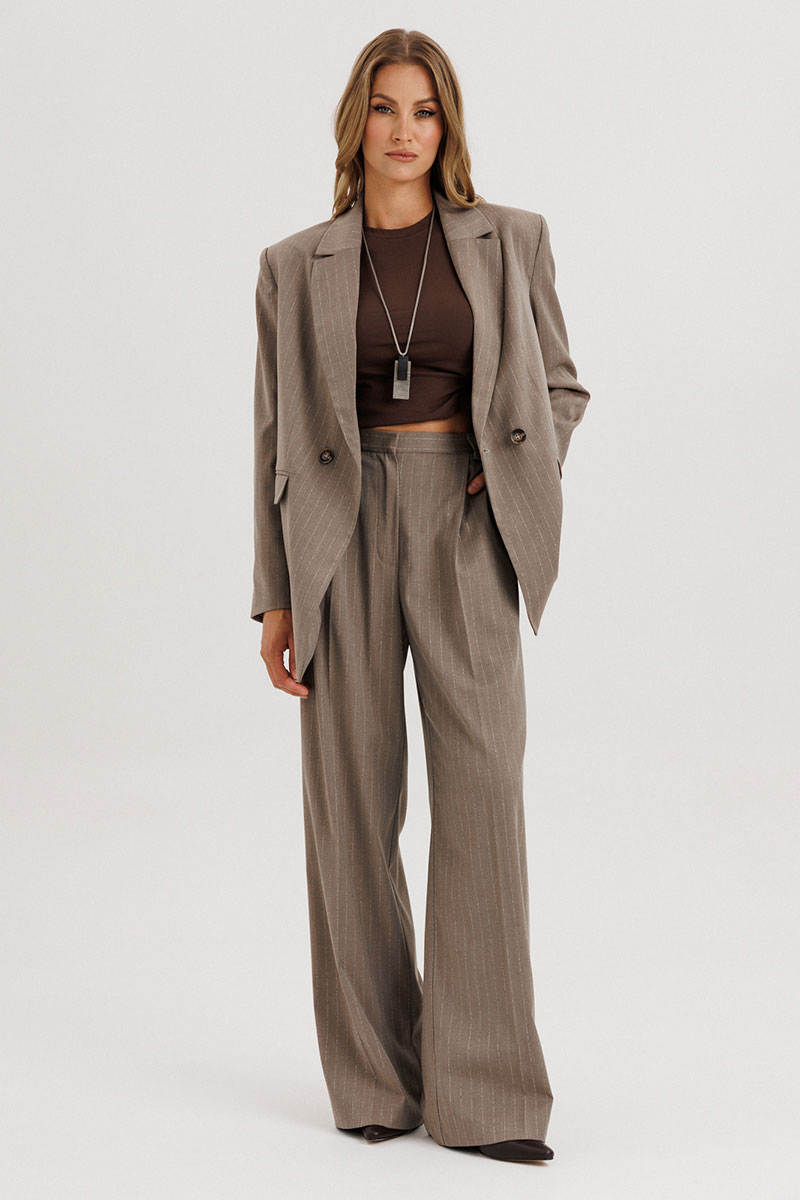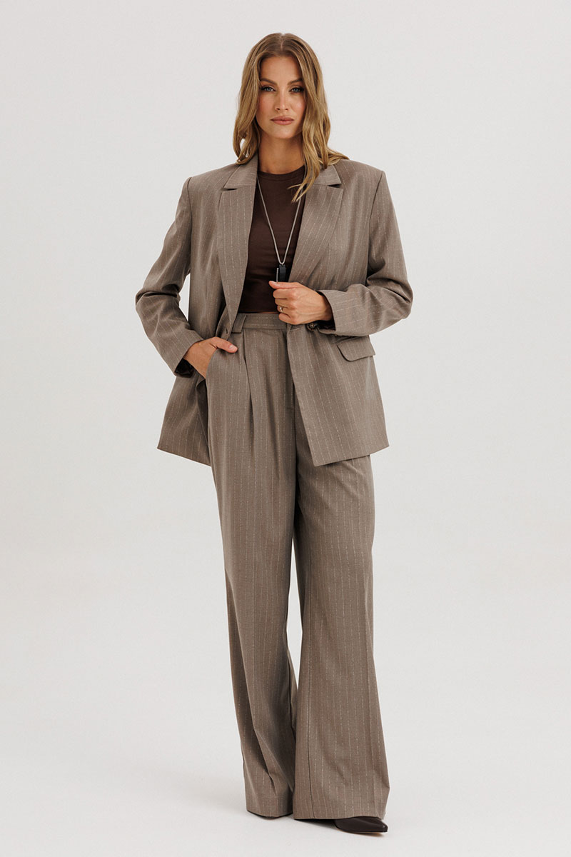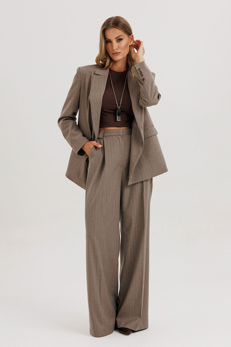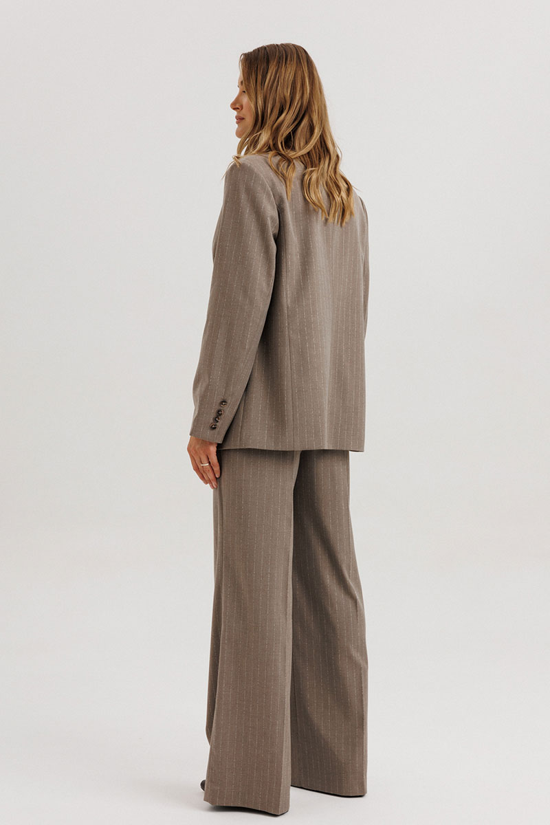 Брюки - палаццо с застежкой с гульфиком и откоском на тесьму-молнию; с притачным поясом с резинкой по спинке. Пояс со шлевками (2 широкие -по переду и 3 узких по спинке). Пояс застегивается на потайной крючок. Передние половинки брюк со складками и боковыми карманами. Задние половинки брюк с талиевыми вытачками.