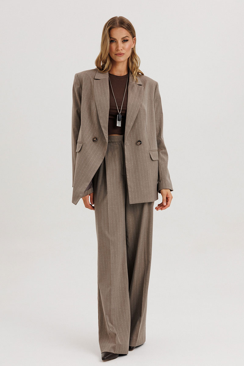 Жакет прямого силуэта с двубортной застежкой на 2 петли и пуговицы. Полочки - с прорезными карманами с клапаном и 2-мя обтачками, с нагрудными вытачками от кармана вверх. Низ переда асимметричный. Правая полочка удлинена к борту. Спинка со средним швом и рельефами от низа до проймы. Воротник пиджачного типа с отложными лацканами. Рукава длинные втачные 2-хшовные, с передним и локтевым швами. В нижней части локтевого шва обработана закрытая шлица с 4-мя пуговицами. Жакет на подкладке и с плечевыми накладками.