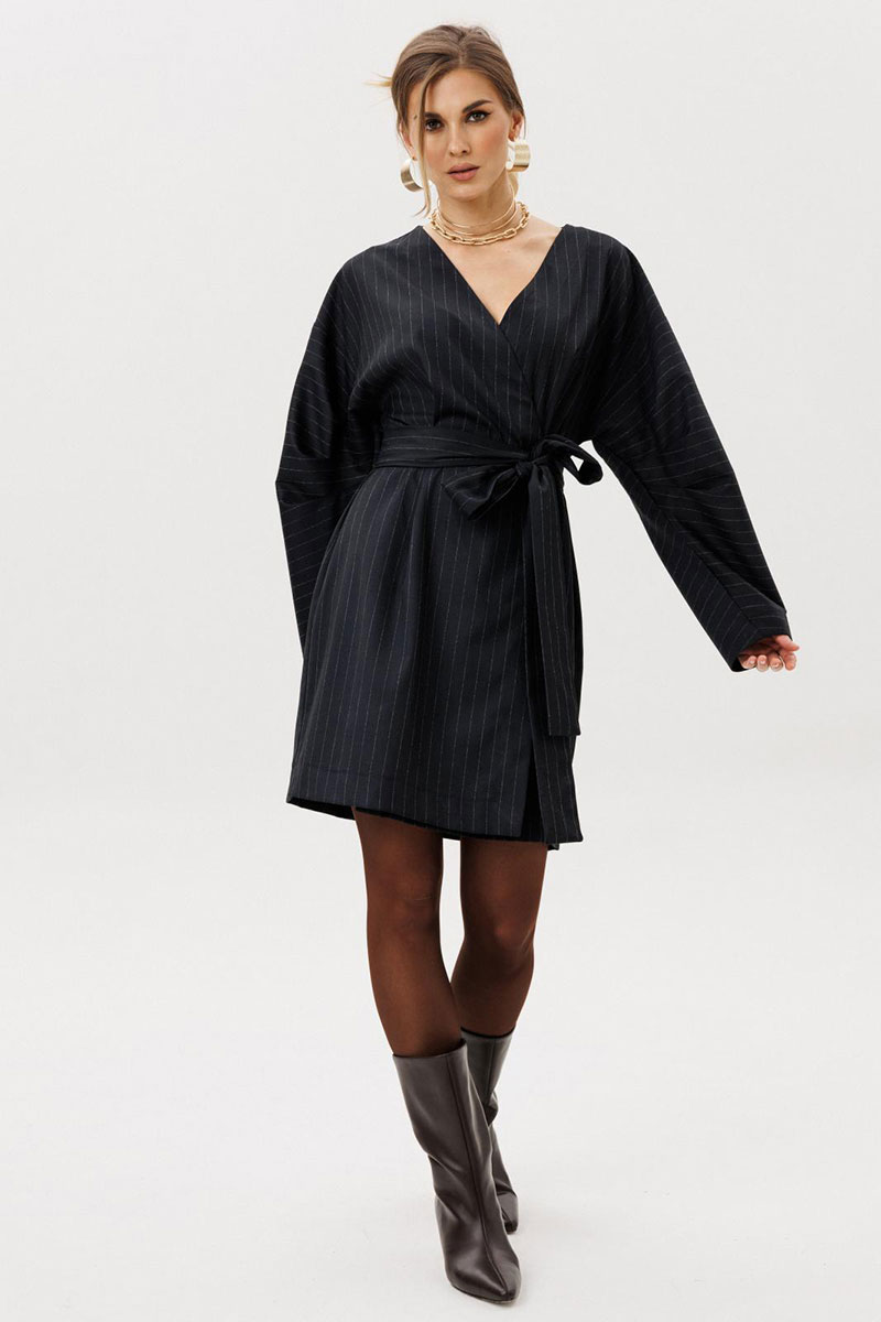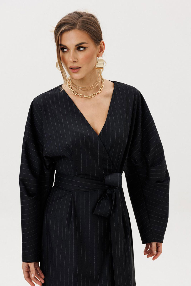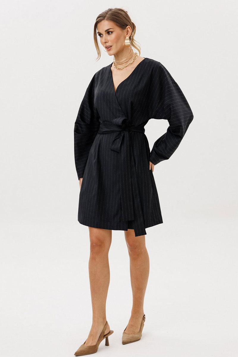 Платье - женское, прилегающего силуэта, “на запах”, застегивающееся на 2 петли и пуговицы. Перед - отрезной по линии талии, со складками. Спинка со складками. Рукава отрезные на основе цельнокроеного рукава, с 3-мя складками от нижнего шва. Вырез горловины-V-образный.