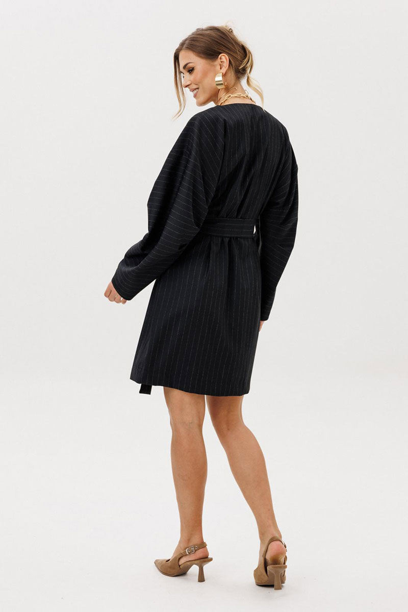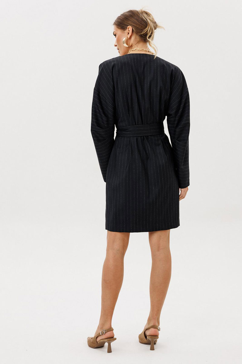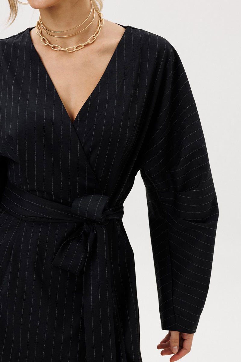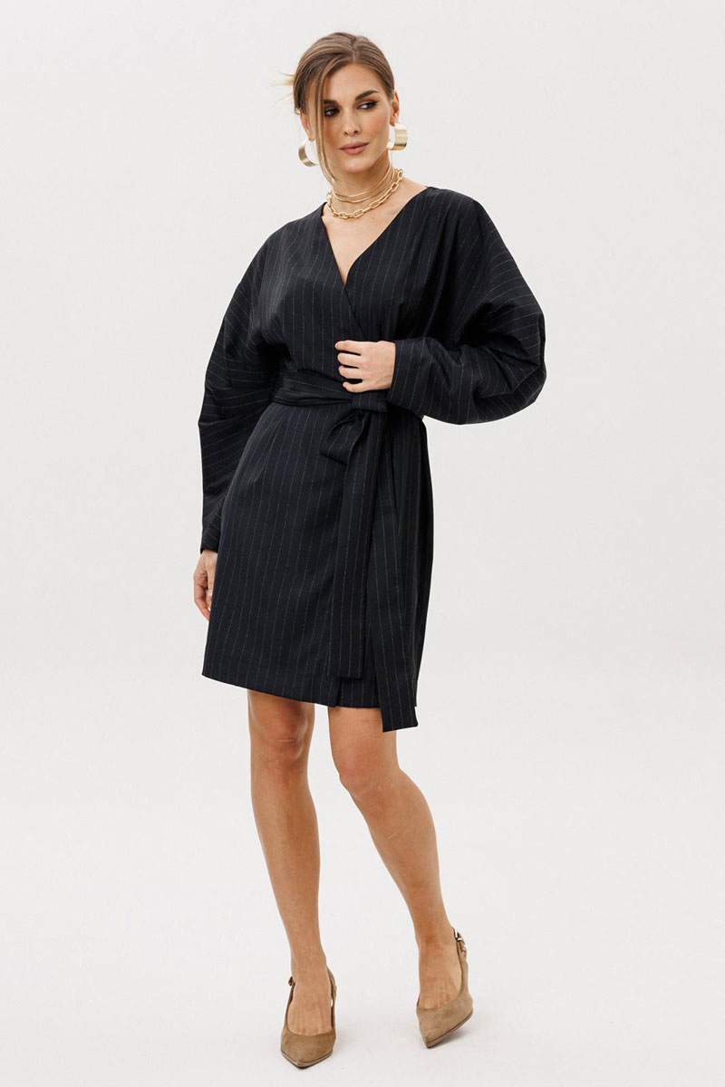 Платье - женское, прилегающего силуэта, “на запах”, застегивающееся на 2 петли и пуговицы. Перед - отрезной по линии талии, со складками. Спинка со складками. Рукава отрезные на основе цельнокроеного рукава, с 3-мя складками от нижнего шва. Вырез горловины-V-образный.