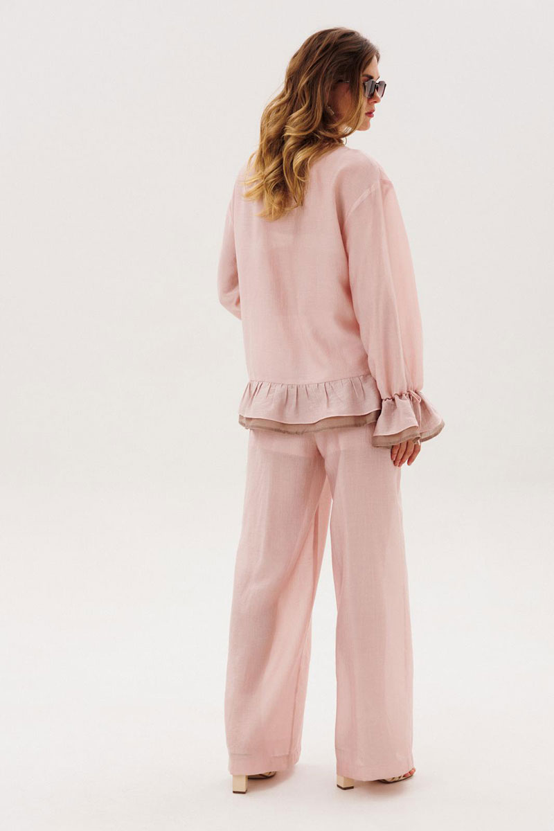 Костюм женский повседневный, состоящий из блузы и брюк. Блуза по переду с вертикальными кулисами. Спинка без конструктивных особенностей. Линия плеча спущена. Рукава втачные, длинные, одношовные, с притачной по низу манжетой. Вырез горловины V-образный. Брюки прямые широкие с притачным поясом на резинке, с боковыми карманами. Брюки на подкладке.