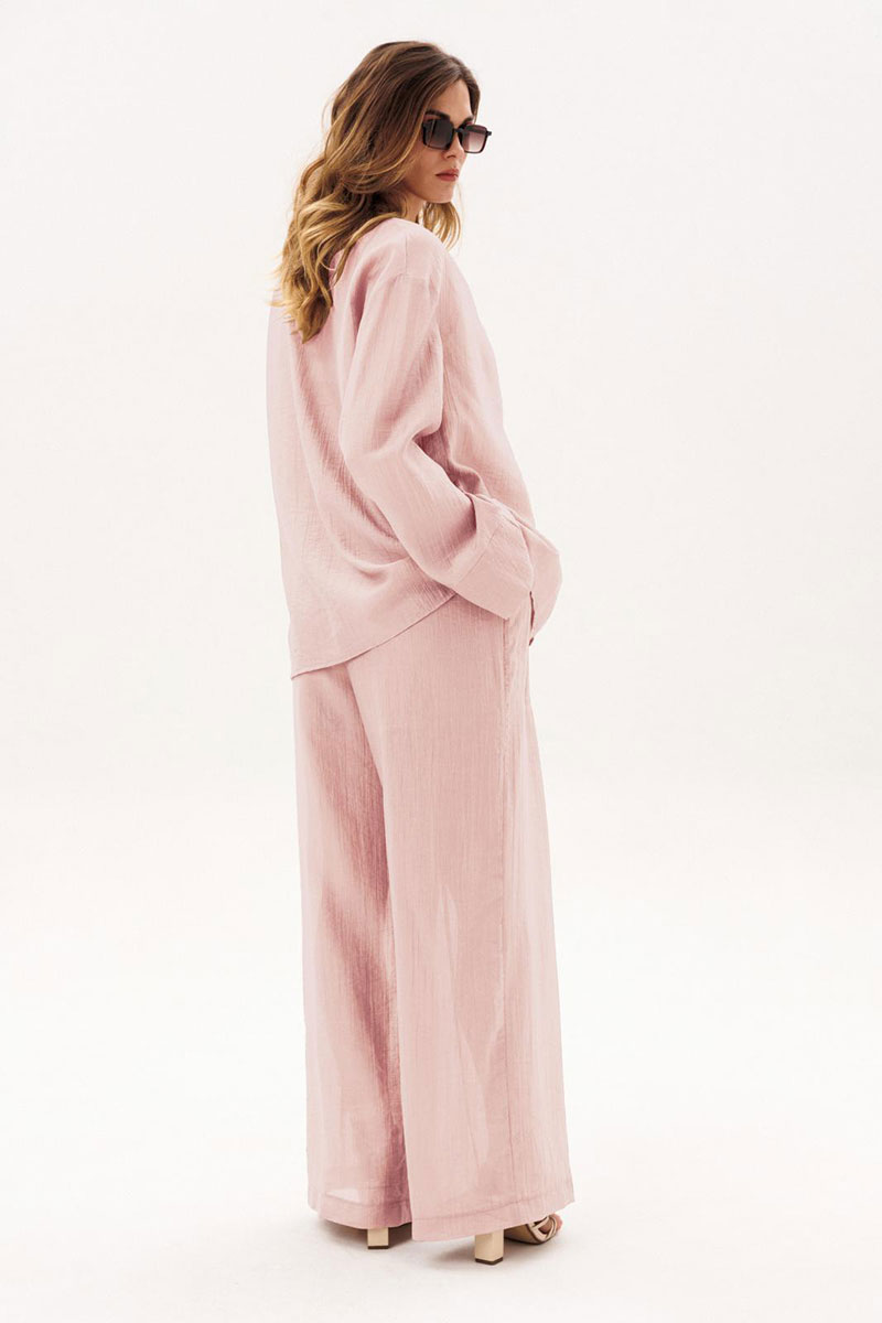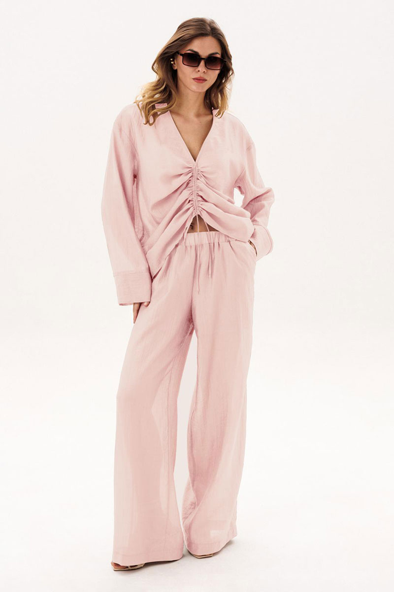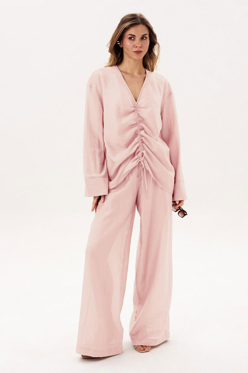 Костюм женский повседневный, состоящий из блузы и брюк. Блуза по переду с вертикальными кулисами. Спинка без конструктивных особенностей. Линия плеча спущена. Рукава втачные, длинные, одношовные, с притачной по низу манжетой. Вырез горловины V-образный. Брюки прямые широкие с притачным поясом на резинке, с боковыми карманами. Брюки на подкладке.