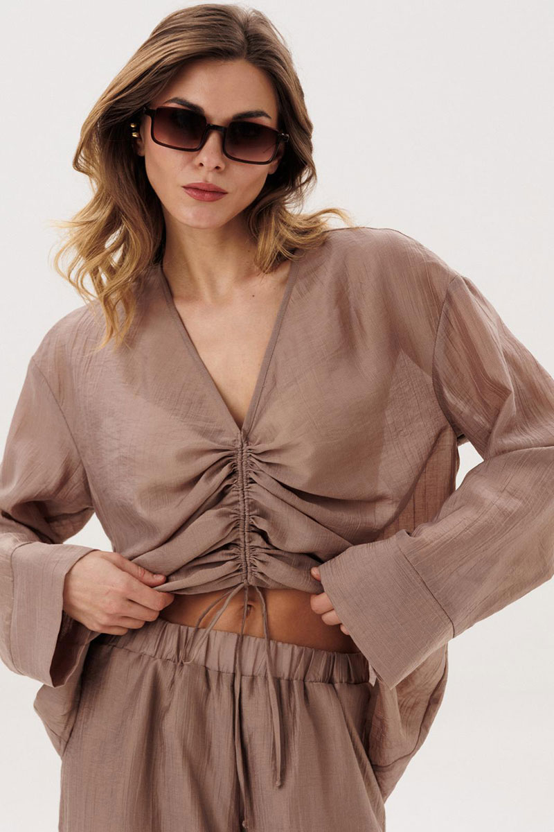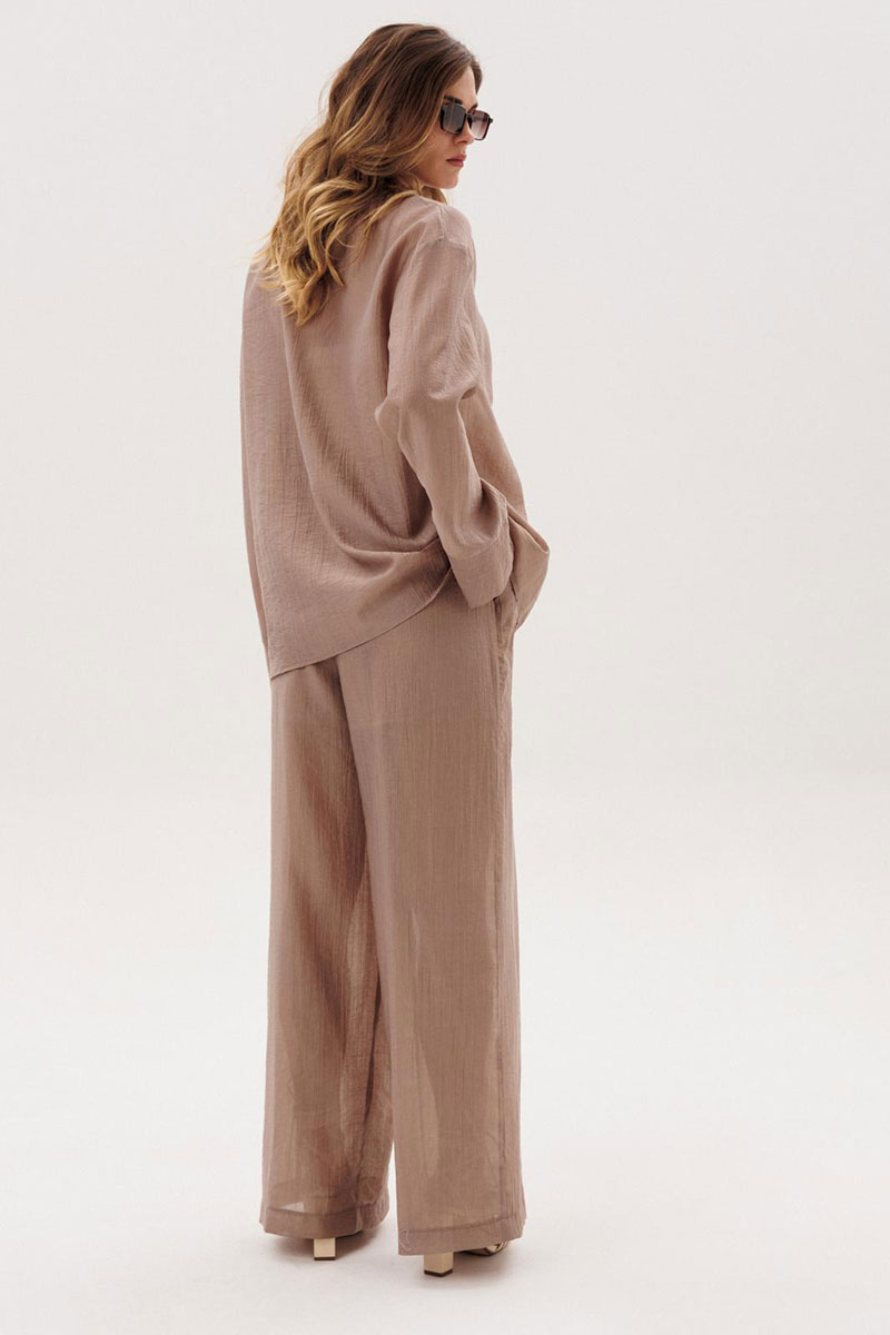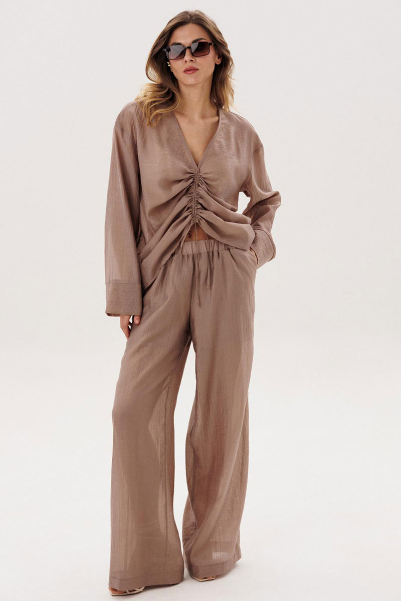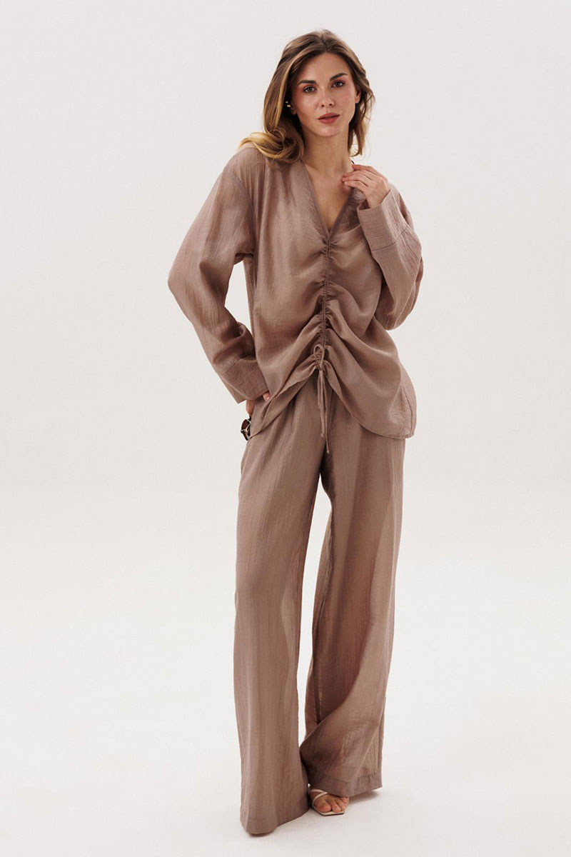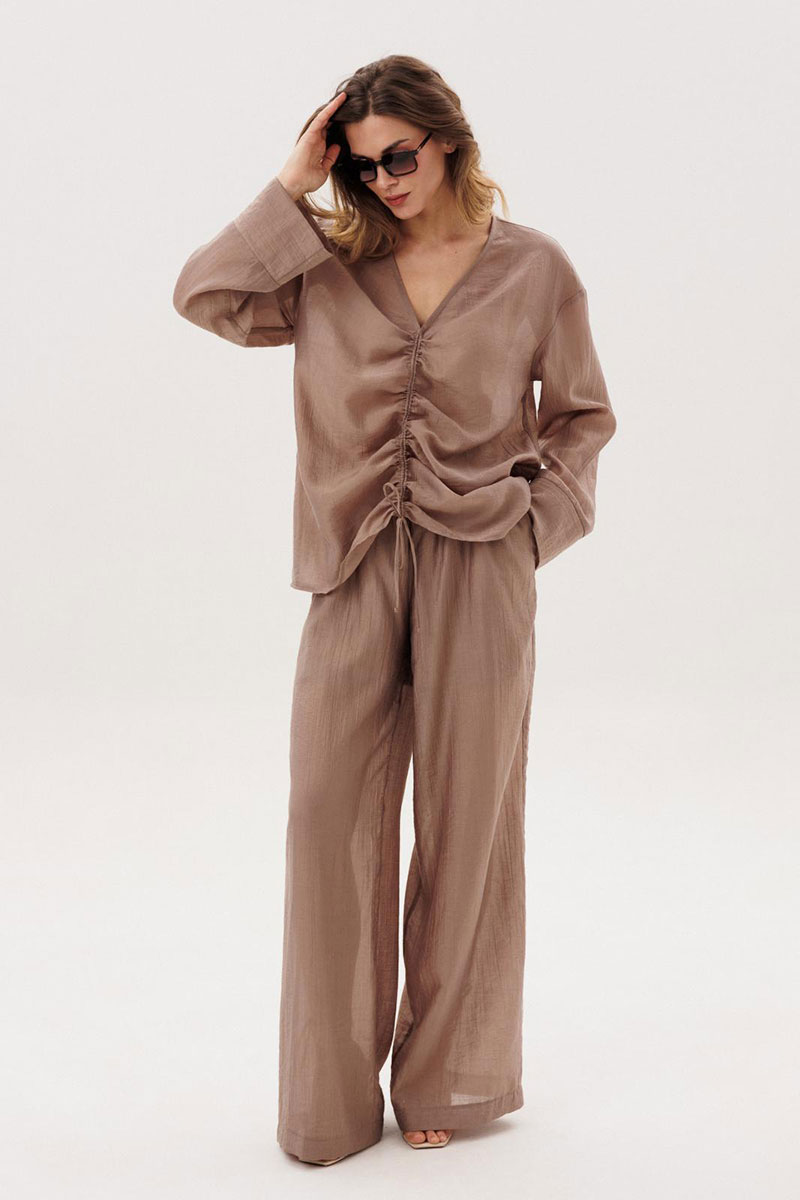 Костюм женский повседневный, состоящий из блузы и брюк. Блуза по переду с вертикальными кулисами. Спинка без конструктивных особенностей. Линия плеча спущена. Рукава втачные, длинные, одношовные, с притачной по низу манжетой. Вырез горловины V-образный. Брюки прямые широкие с притачным поясом на резинке, с боковыми карманами. Брюки на подкладке.