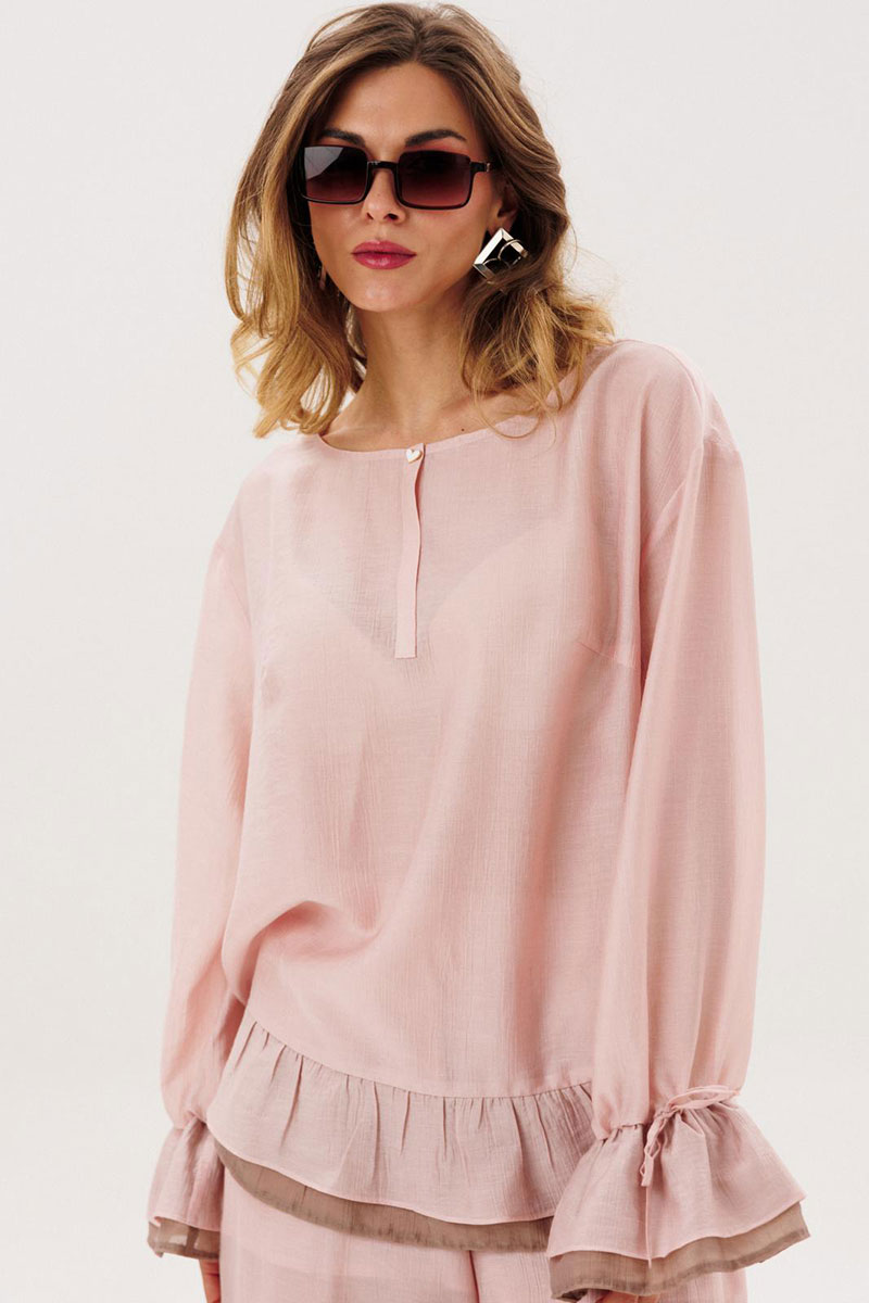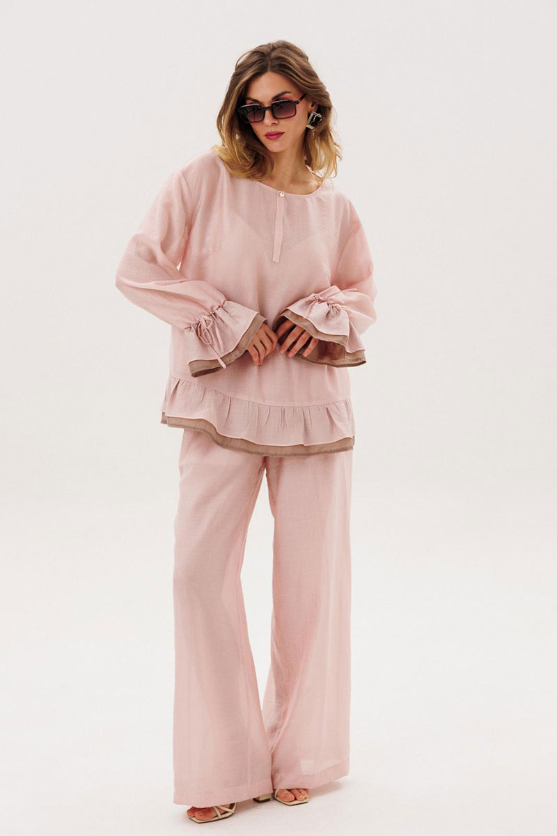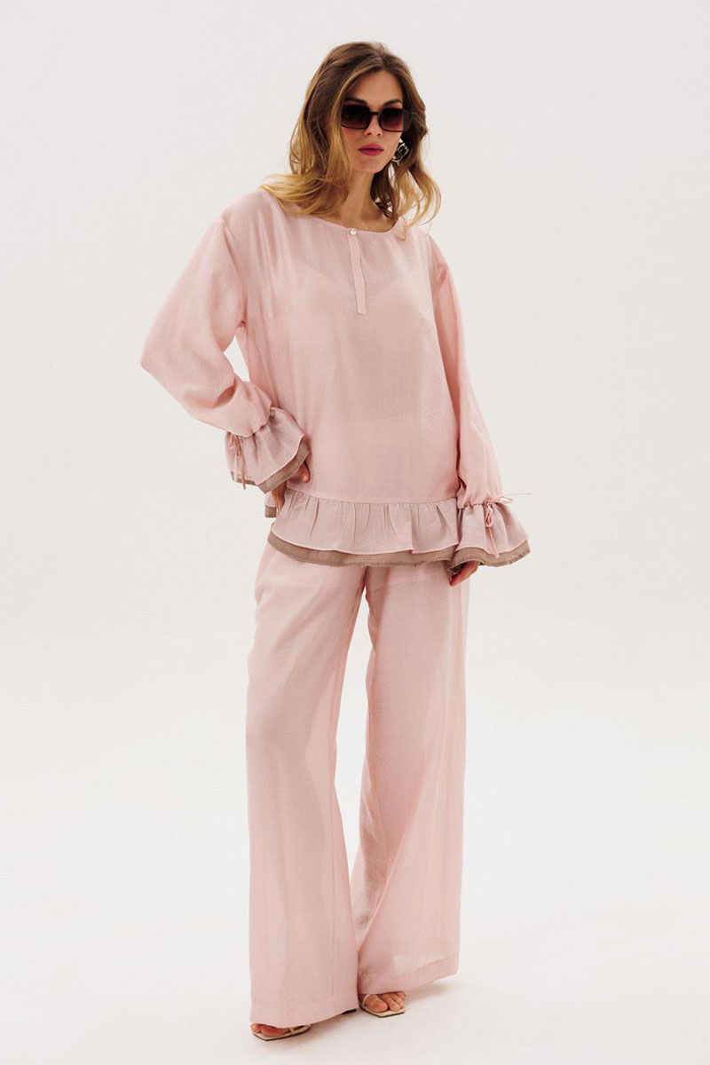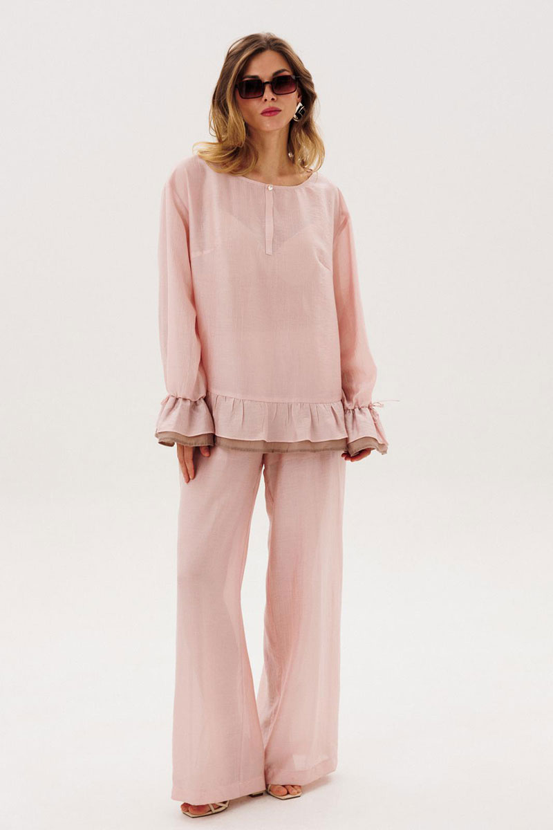 Костюм женский повседневный, состоящий из блузы и брюк. Блуза прямого силуэта с 2-мя рюшами по низу (нижняя рюша контрастного цвета). Перед с нагрудными вытачками и настрочной планкой. На планке расположена декоративная пуговица. Вырез горловины-“лодочка”. Рукава втачные на спущенной пройме, одношовные длинные с 2-мя притачными рюшами (нижняя контрастного цвета). Рукава книзу расширены и присобраны на резинку. Сверху настрочен шнур, завязывающийся на бантик. Брюки прямые широкие с притачным поясом на резинке, с боковыми карманами. Брюки на подкладке.