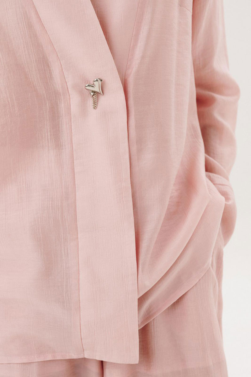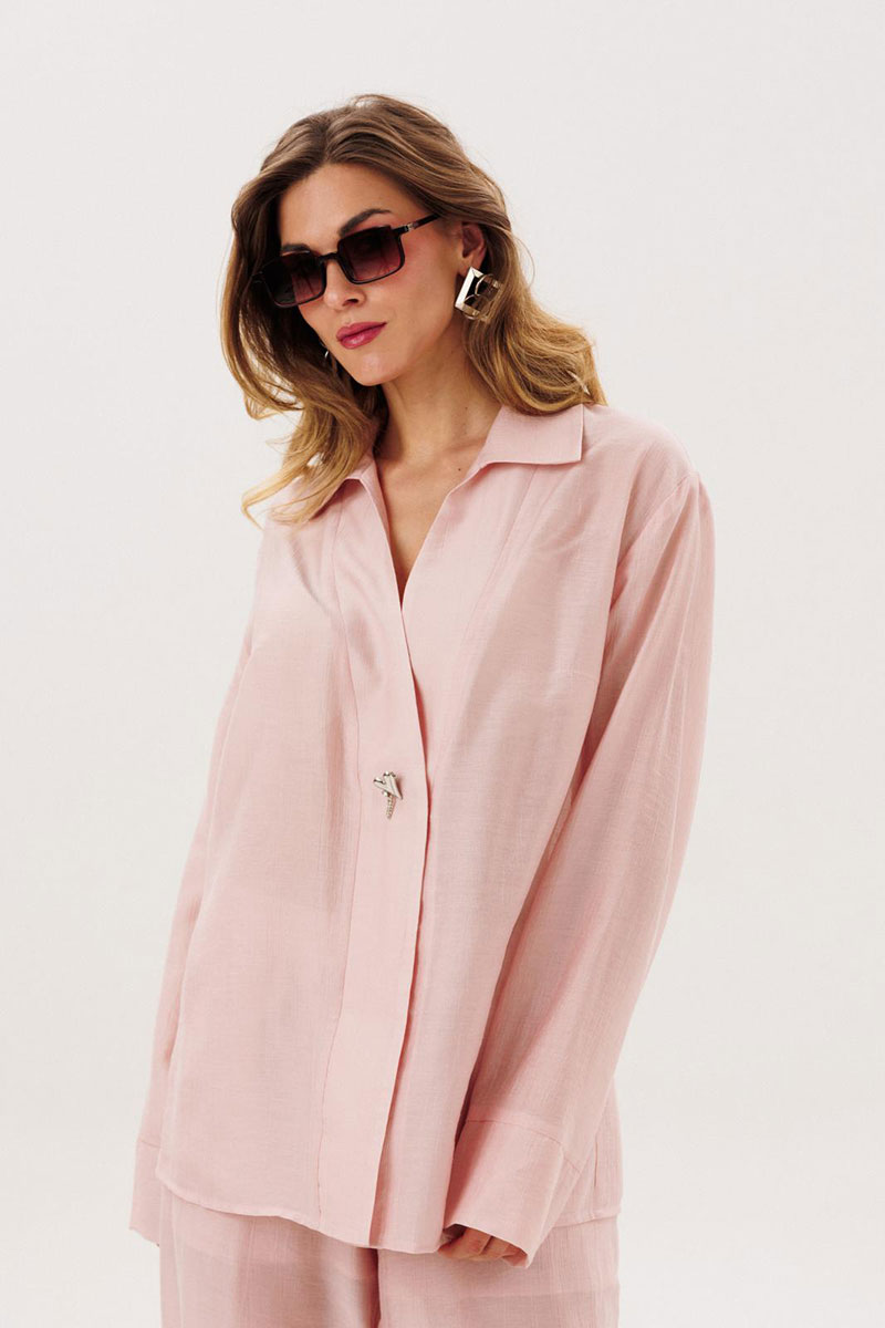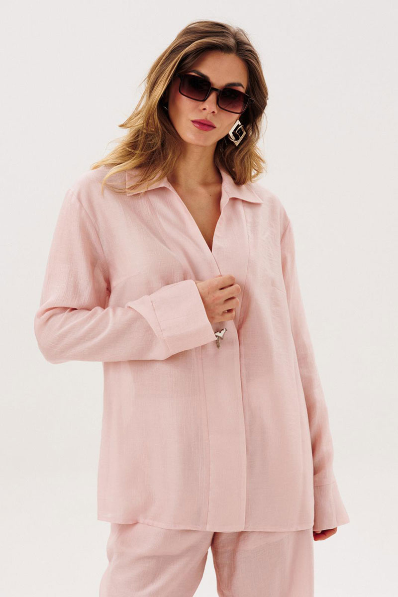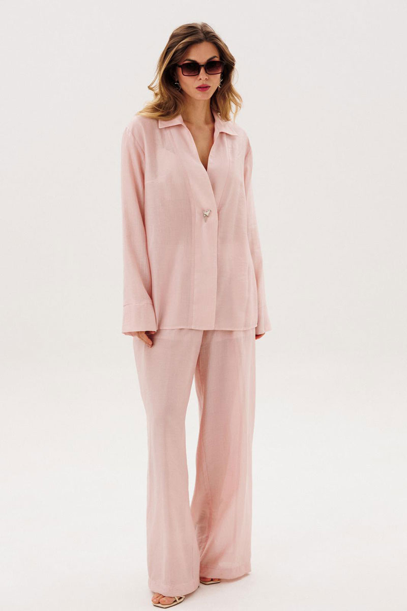 Костюм женский повседневный, состоящий из блузы и брюк. Блуза по переду с нагрудными вытачками, с широкими планками, не распашная. На планках расположена декоративная пуговица. Спинка без конструктивных особенностей. Линия плеча спущена. Рукава втачные, длинные, одношовные, с притачной по низу манжетой. Вырез горловины V-образный. Воротник – стояче-отложной с цельнокроеной стойкой. Брюки прямые широкие с притачным поясом на резинке, с боковыми карманами. Брюки на подкладке.