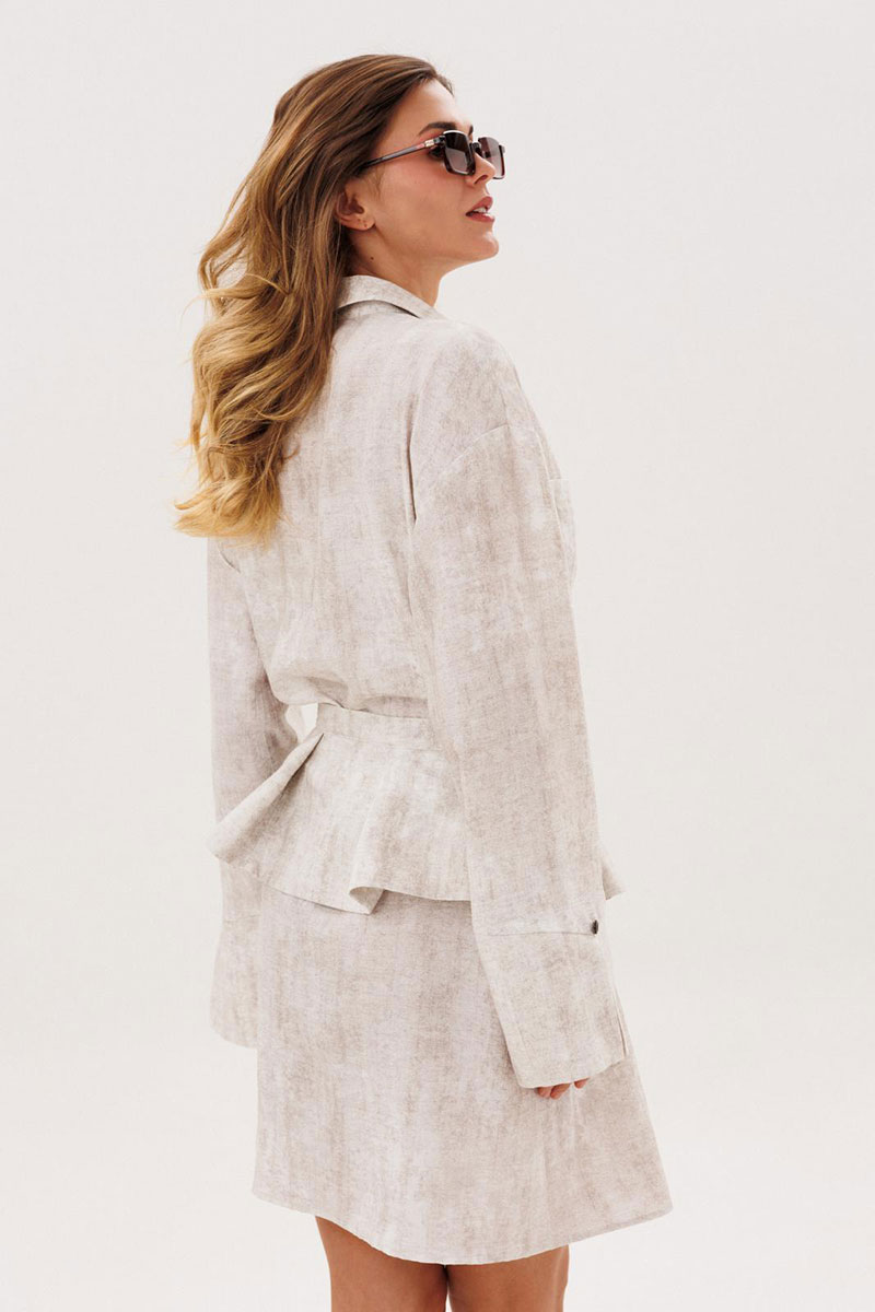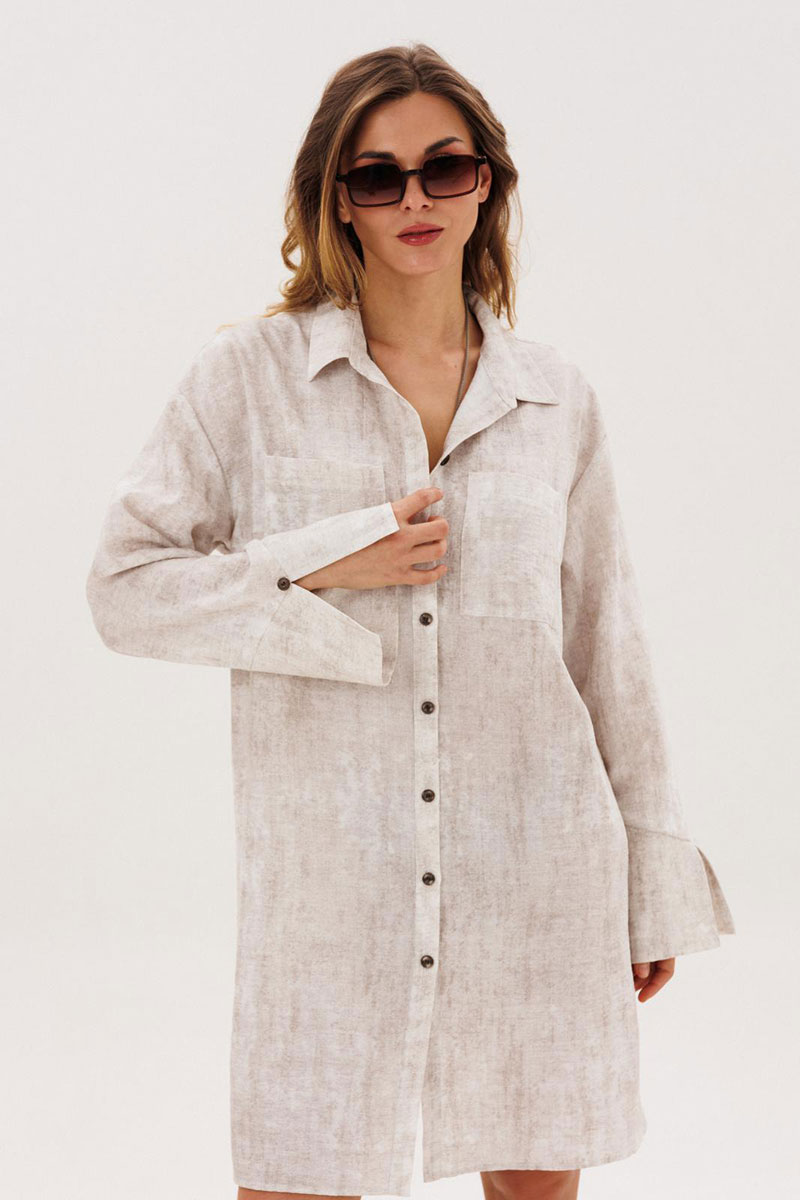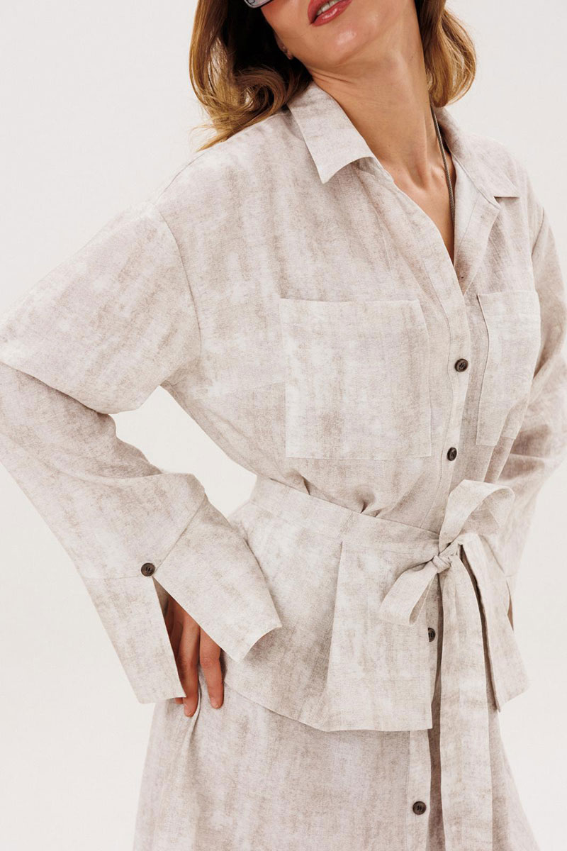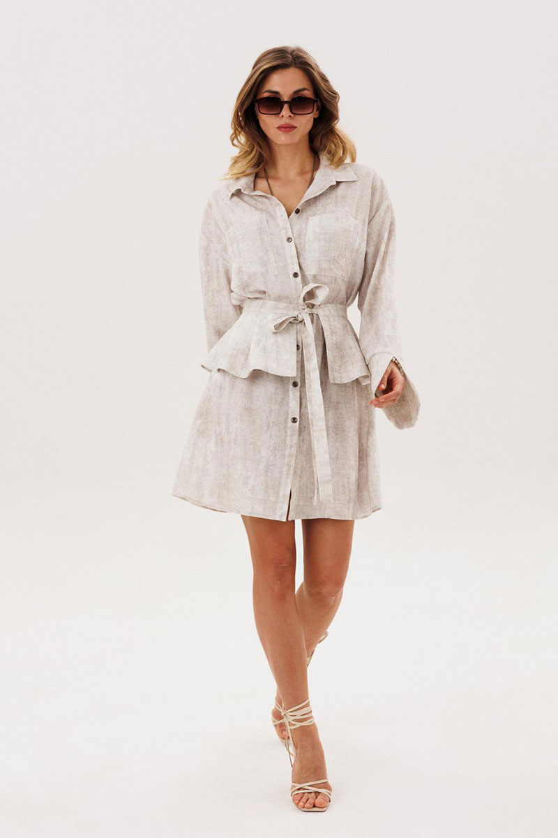 Комплект женский повседневный, состоящий из платья и баски. Платье прямого силуэта с застежкой с планками, застегивающимис на 8 прорезных петель и пуговиц. Перед с нагрудными вытачками и накладными карманами. Спинка без конструктивных особенностей. Рукава рубашечного типа с притачными по низу манжетами. Манжета фигурная, с разрезом по центру и пуговицей над ним. Воротник стояче-отложной с отрезной стойкой. Баска с 3-мя парами складок, завязывается по переду на завязки.
