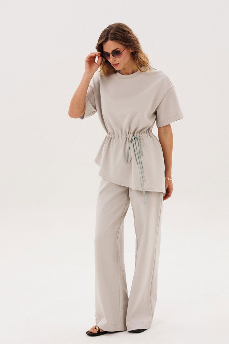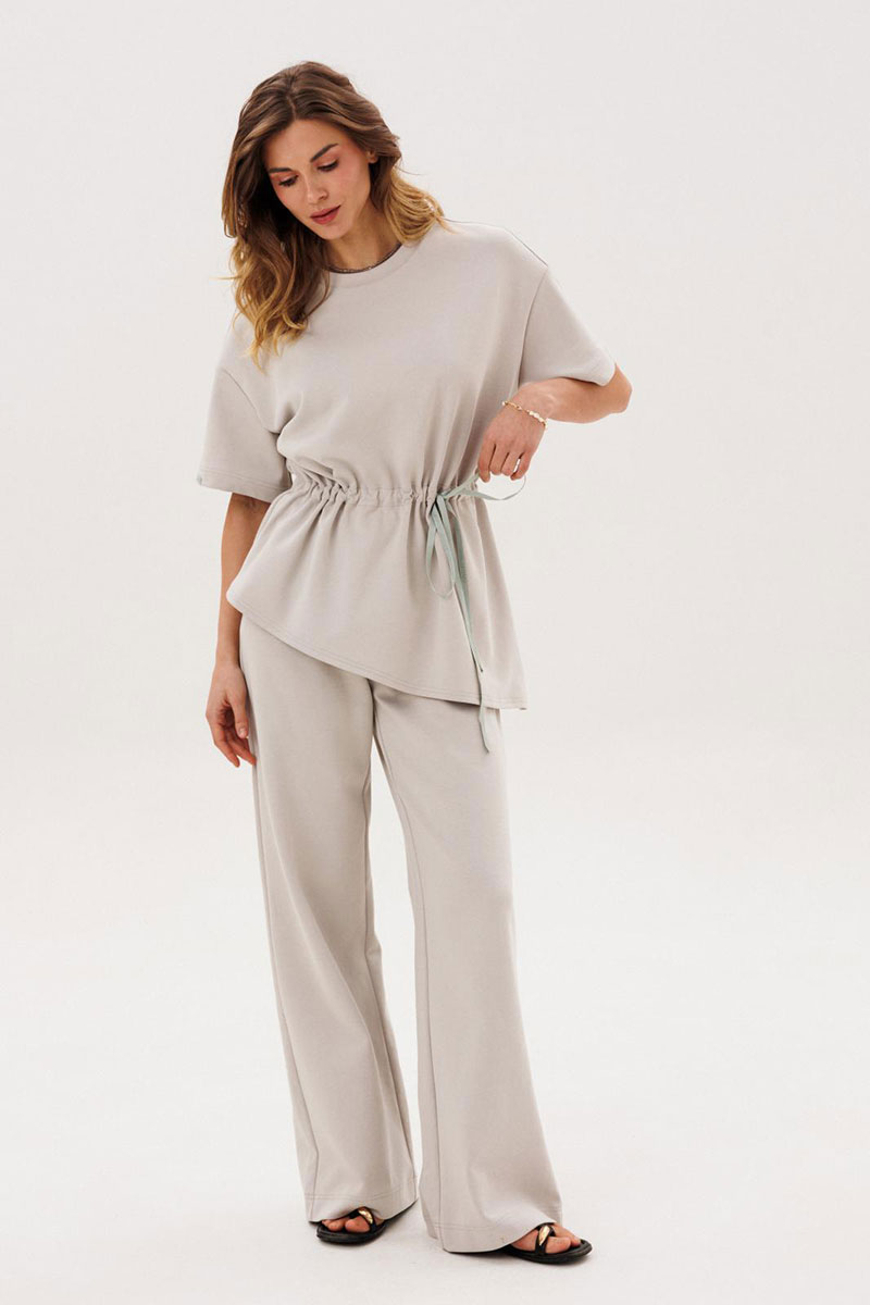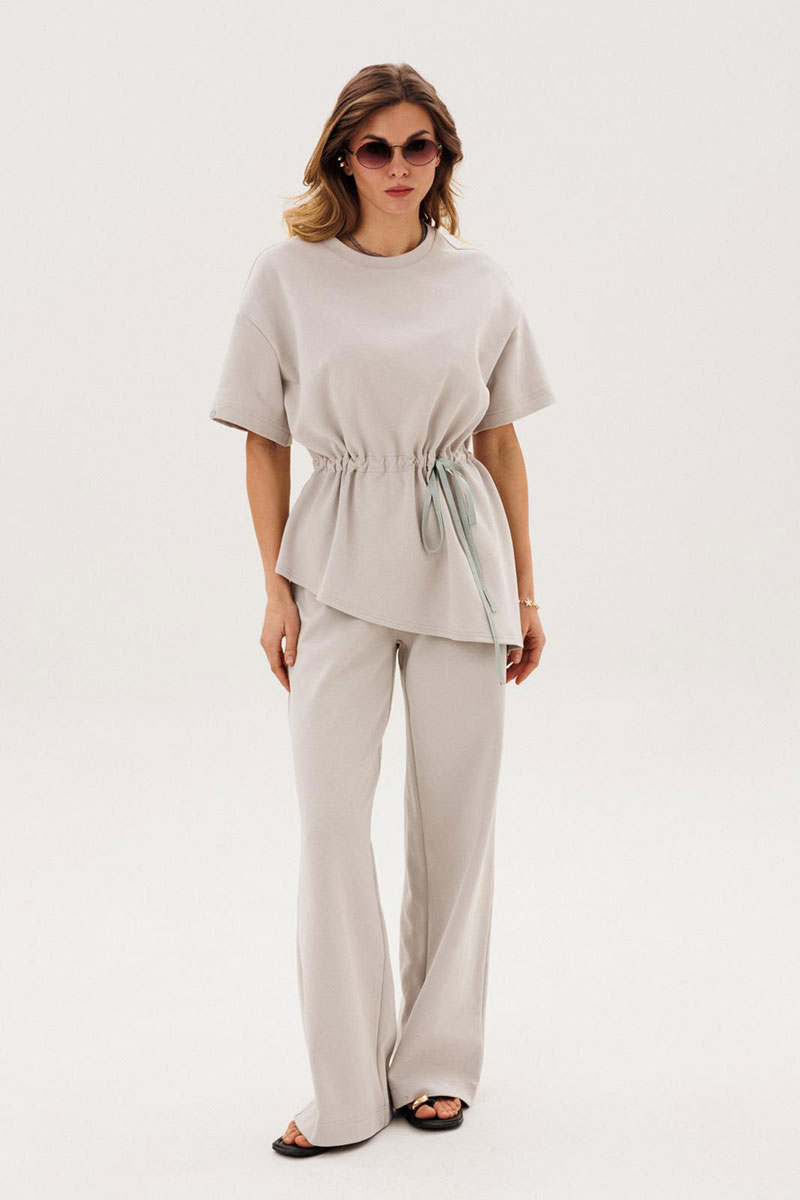 Костюм женский повседневный, состоящий из джемпера и брюк. Костюм выполнен из трикотажа. Джемпер прямого силуэта, с кулисой по талии, с асимметричной линией низа. Сквозь кулису протягивается контрастная тесьма. Рукава на спущенной пройме втачные одношовные короткие. Вырез горловины округлый, обработан планками. Брюки прямые, с притачным поясом, на резинке. На передних половинках брюк обработаны боковые карманы.