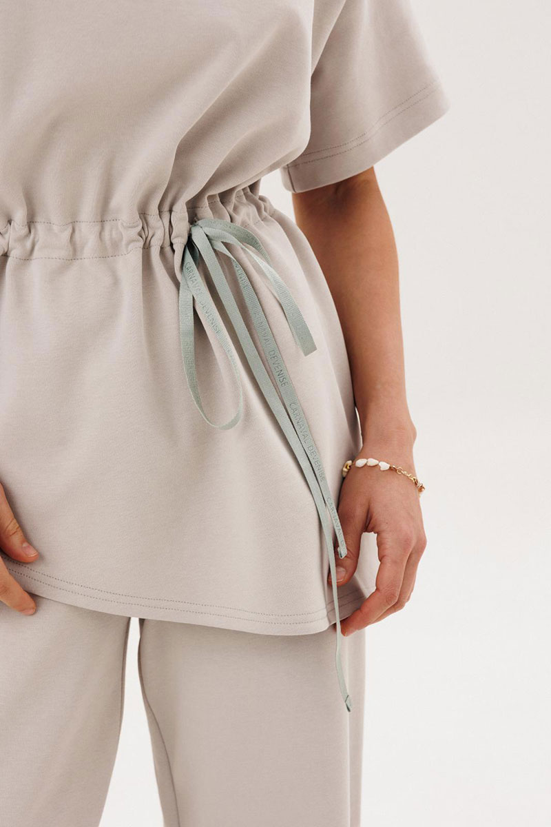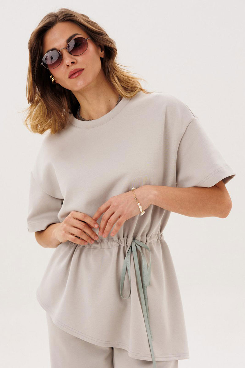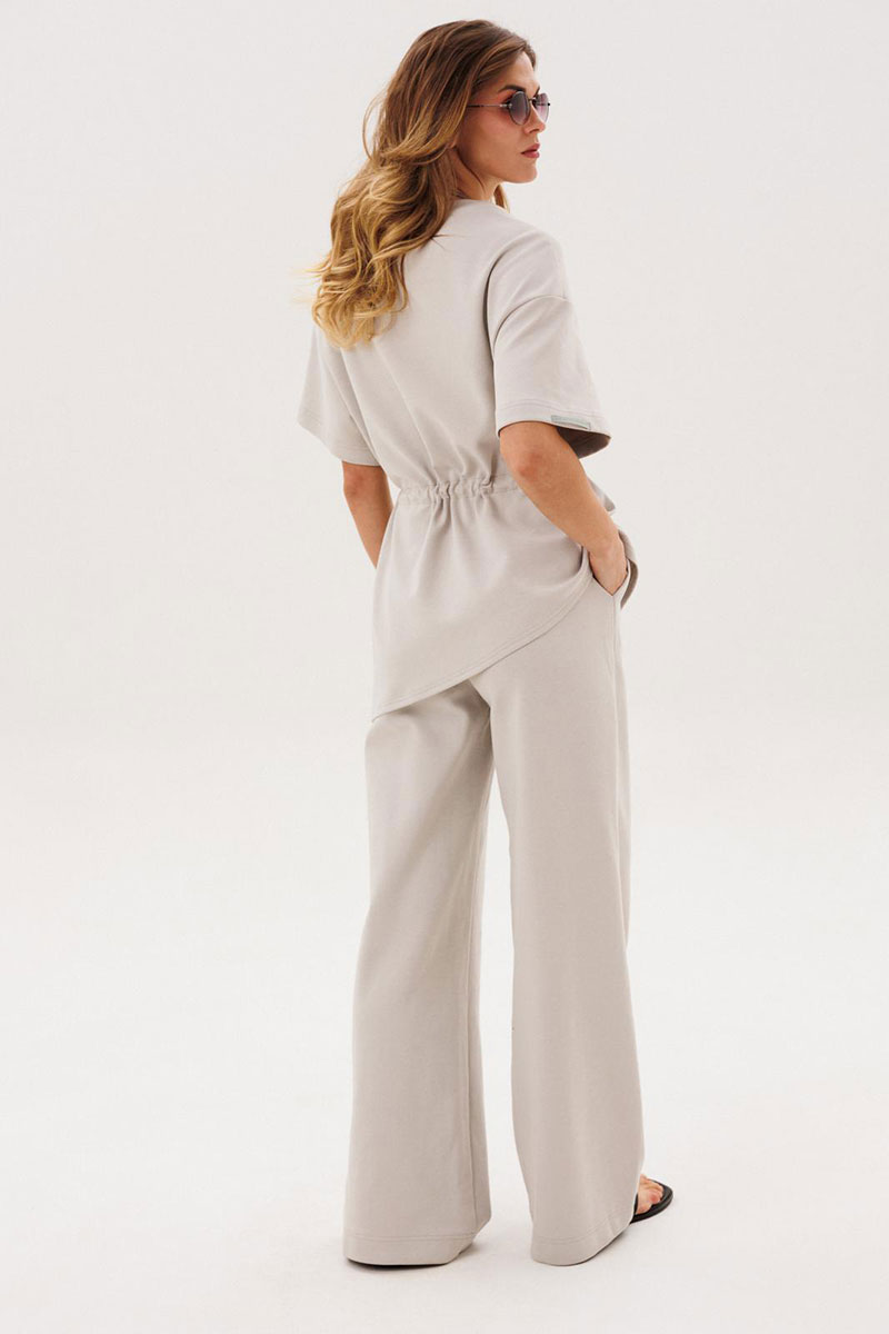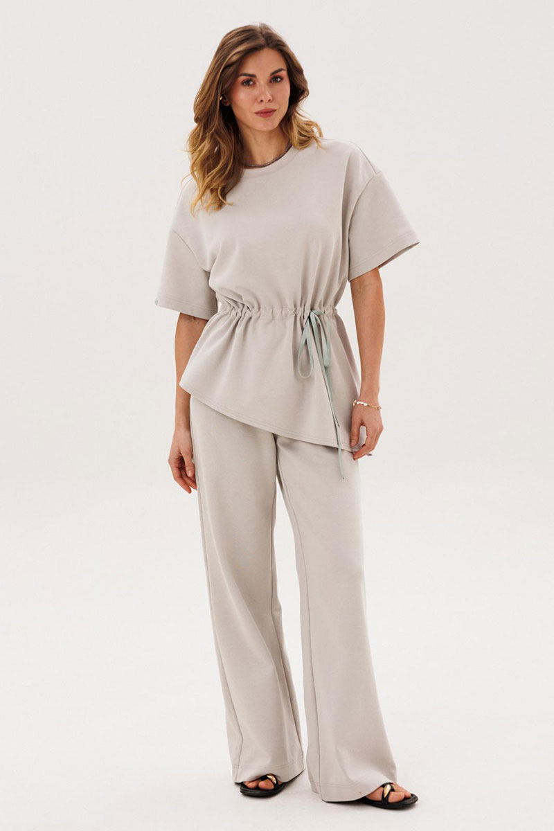Костюм женский повседневный, состоящий из джемпера и брюк. Костюм выполнен из трикотажа. Джемпер прямого силуэта, с кулисой по талии, с асимметричной линией низа. Сквозь кулису протягивается контрастная тесьма. Рукава на спущенной пройме втачные одношовные короткие. Вырез горловины округлый, обработан планками. Брюки прямые, с притачным поясом, на резинке. На передних половинках брюк обработаны боковые карманы.