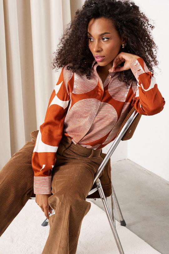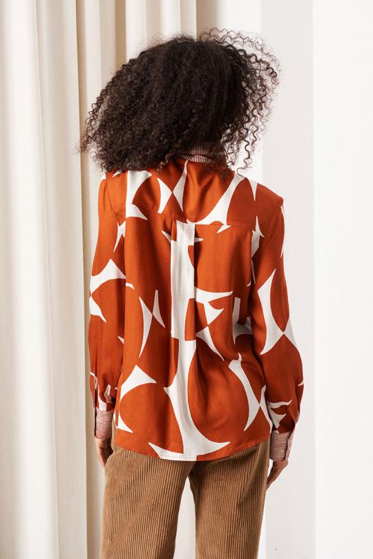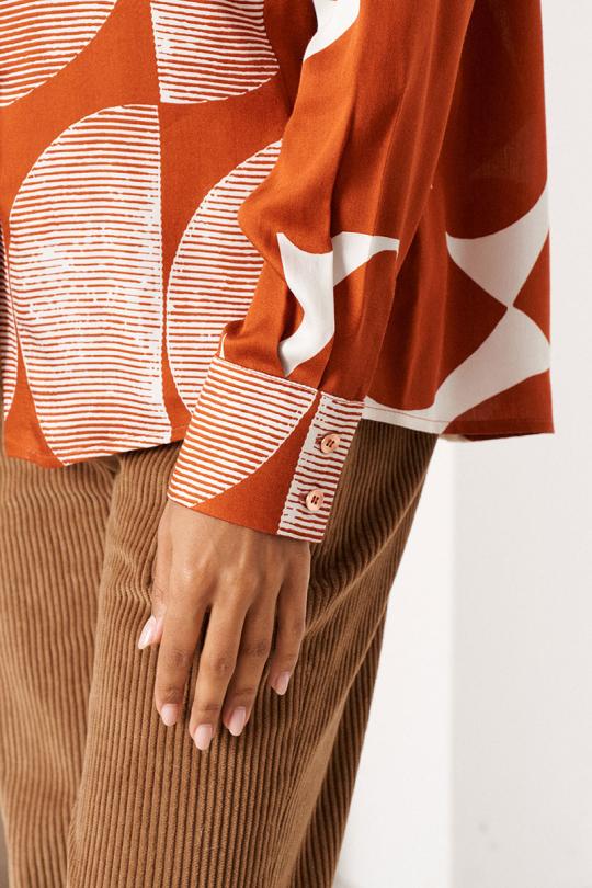 Блузка прямого силуэта. Рукав со спущенным плечевым швом, с манжетой и застежкой на петлю и пуговицу. Застежка центральная на петли и пуговицы. Спинка с отрезной кокеткой и складкой. Низ блузки закругленной формы.