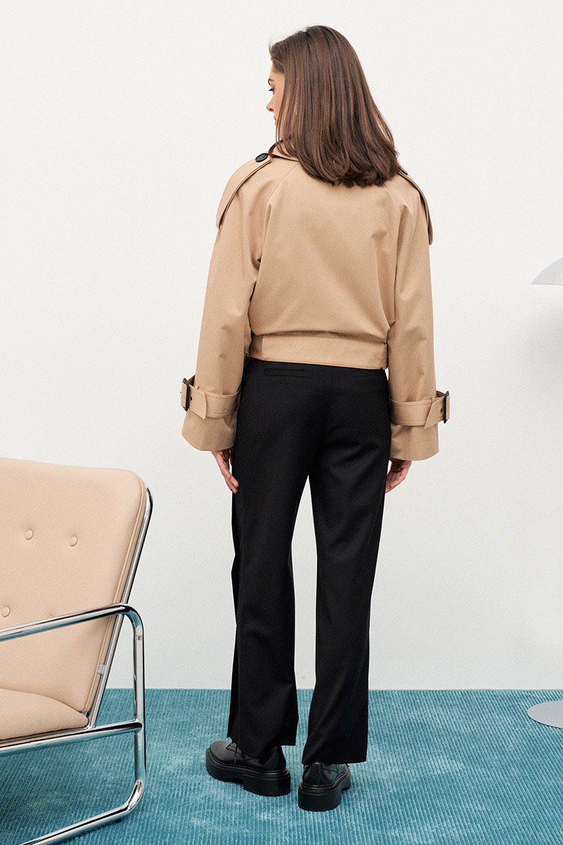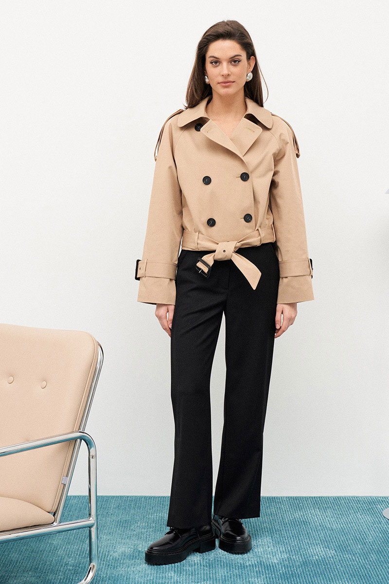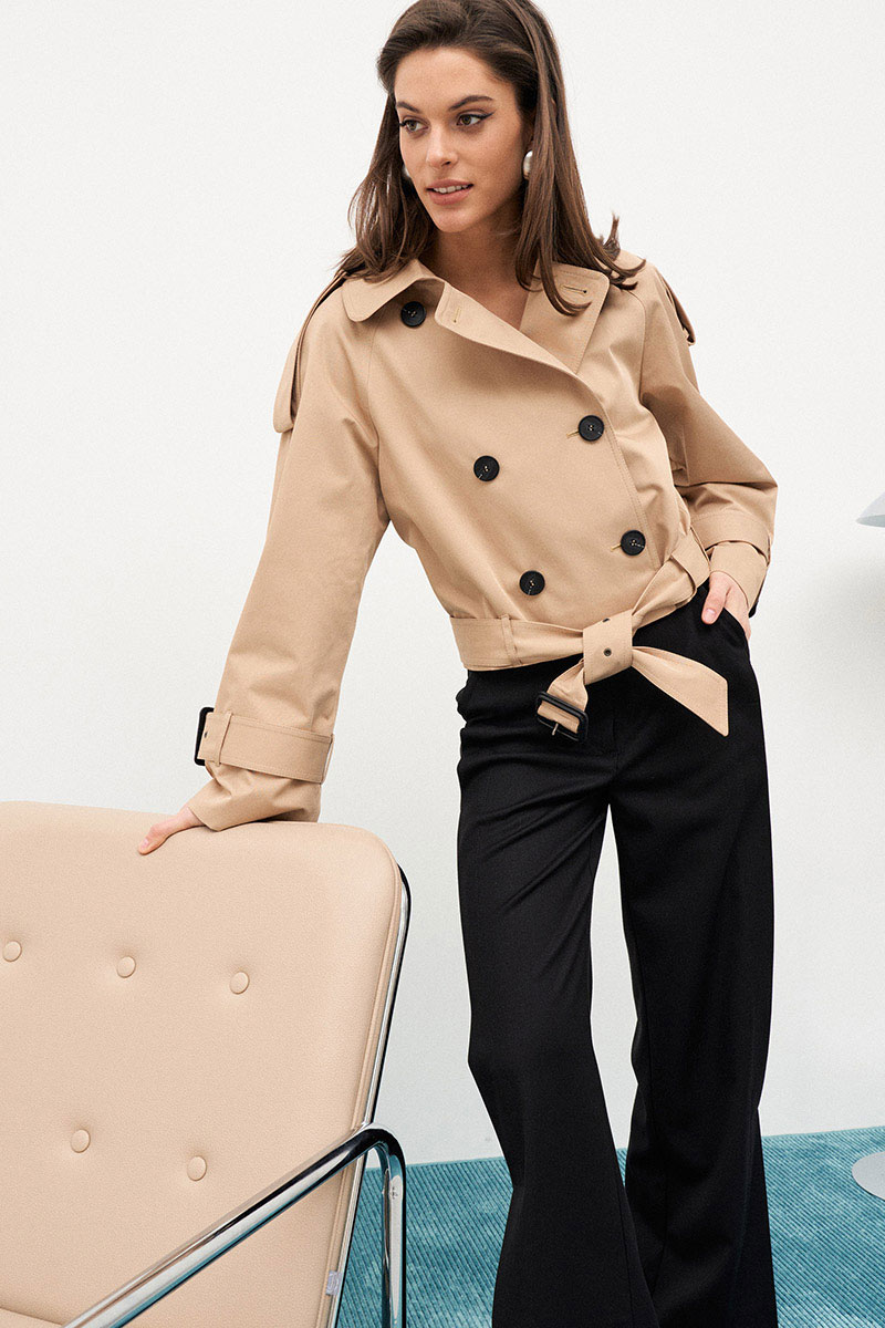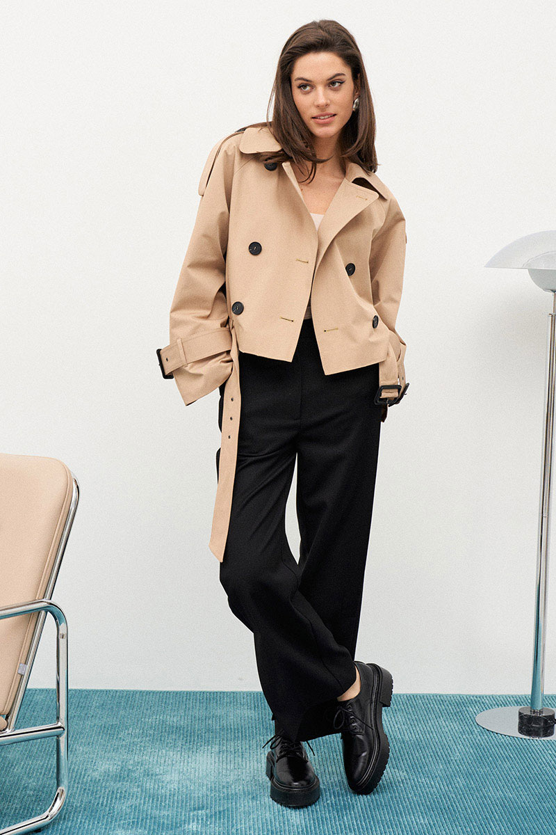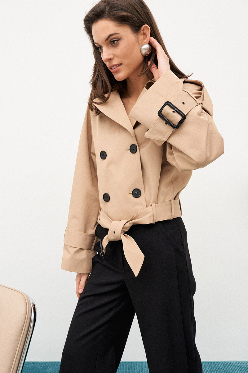 Укороченная куртка-тренчкот. Рукав покроя реглан. Двубортная застежка на пуговицы. Воротник пиджачного типа. Погоны по плечевым швам, пояс с пряжкой по талии, паты с пряжками на рукавах. Куртка на подкладке.