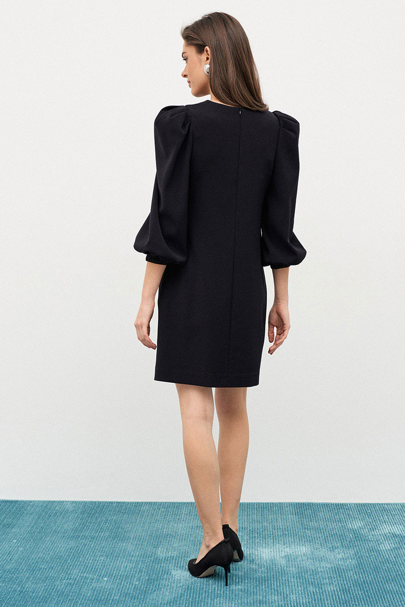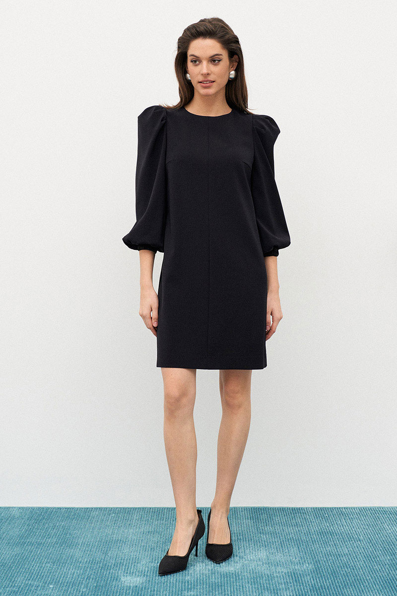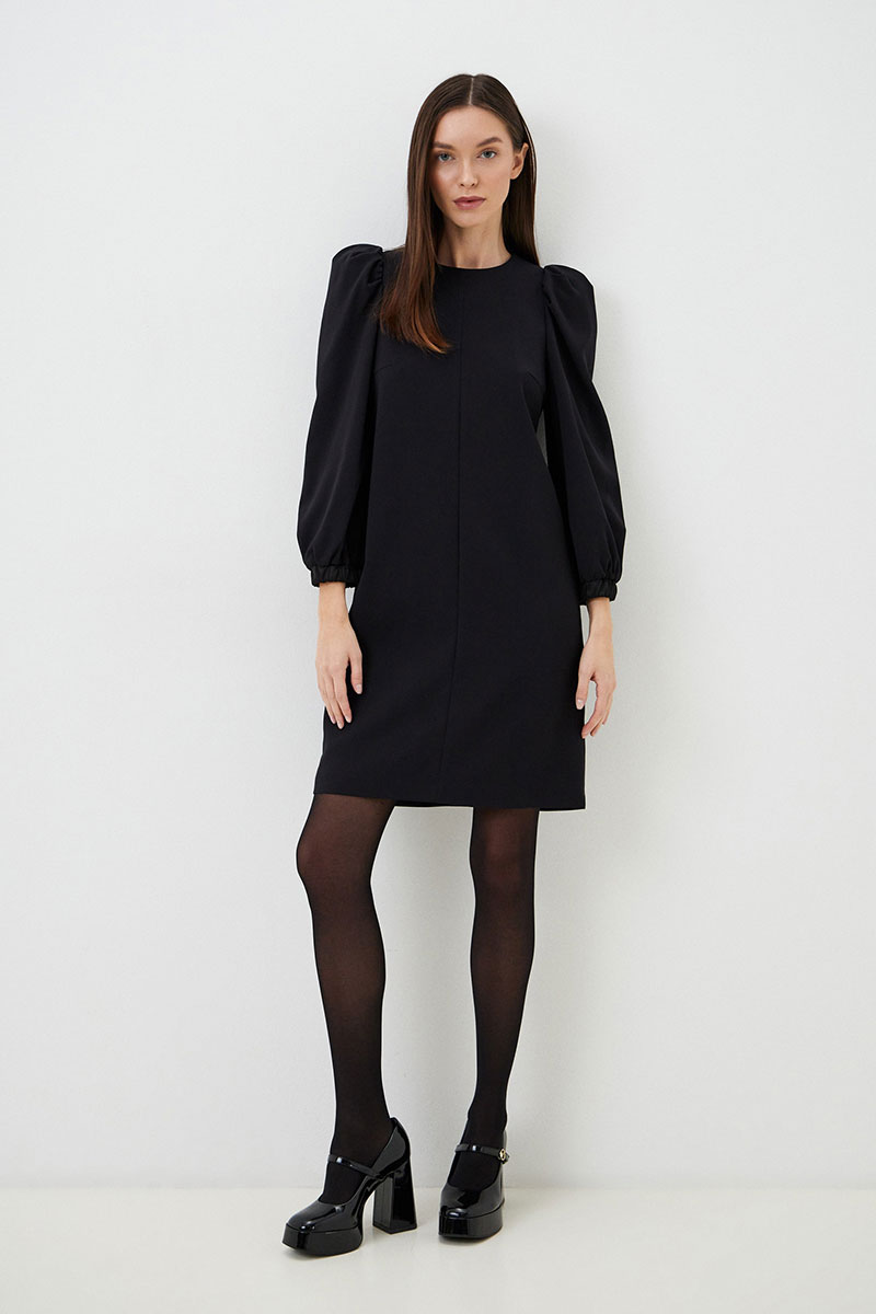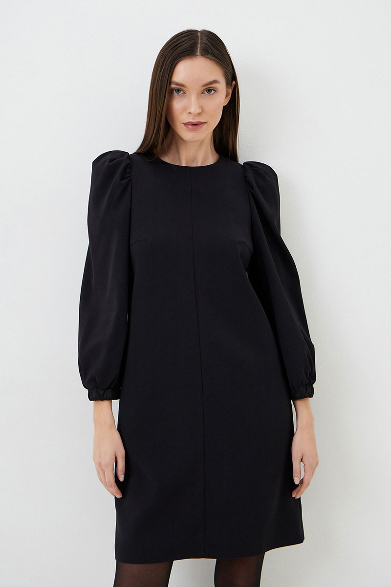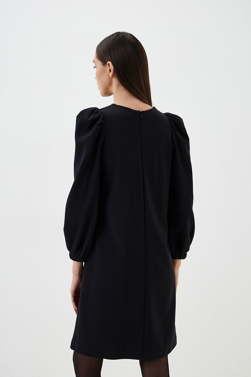 Нарядное платье из итальянского кади прямого силуэта с объемными рукавами. Перед и спинка с центральными швами. Рукав втачной со сборкой и эластичной манжетой по низу из атласа. Застежка в среднем шве спинки на потайную тесьму-молнию. Платье без подкладки.
