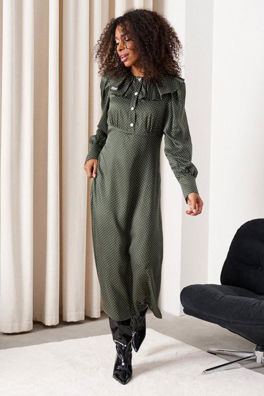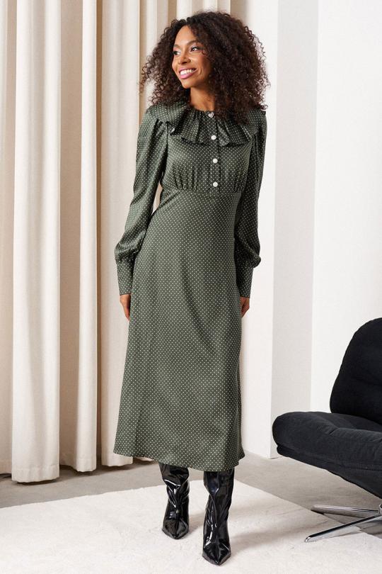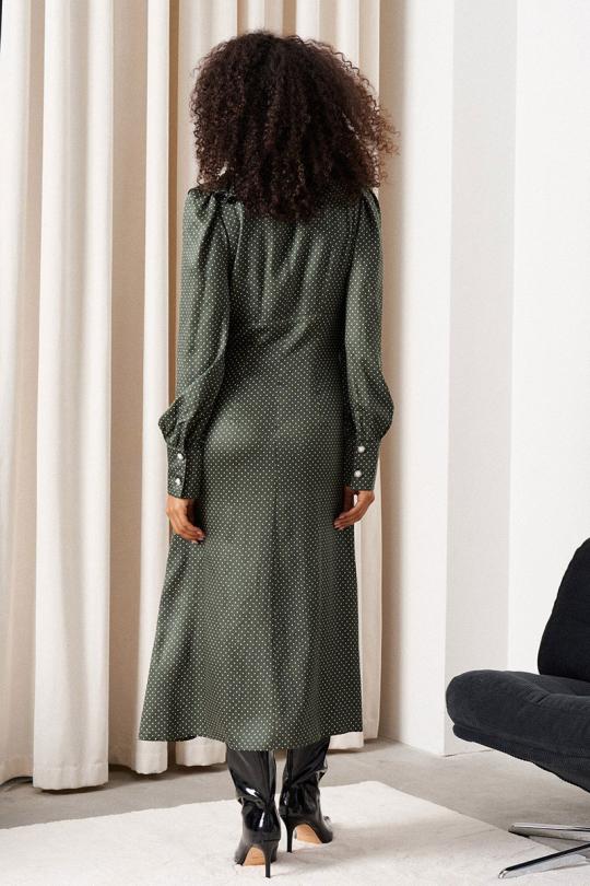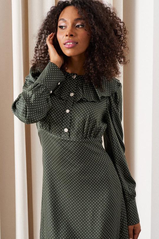 Платье-миди. Рукав втачной со сборкой по окату. Покрой - отрезной по линии талии. Низ рукава с манжетой и застежкой на петли и пуговицы. Горловина платья с рюшей со сборкой. Застежка центральная по планке на петли и пуговицы. Застежка в боковом шве на потайную тесьму-молнию. Юбка платья на подкладке.