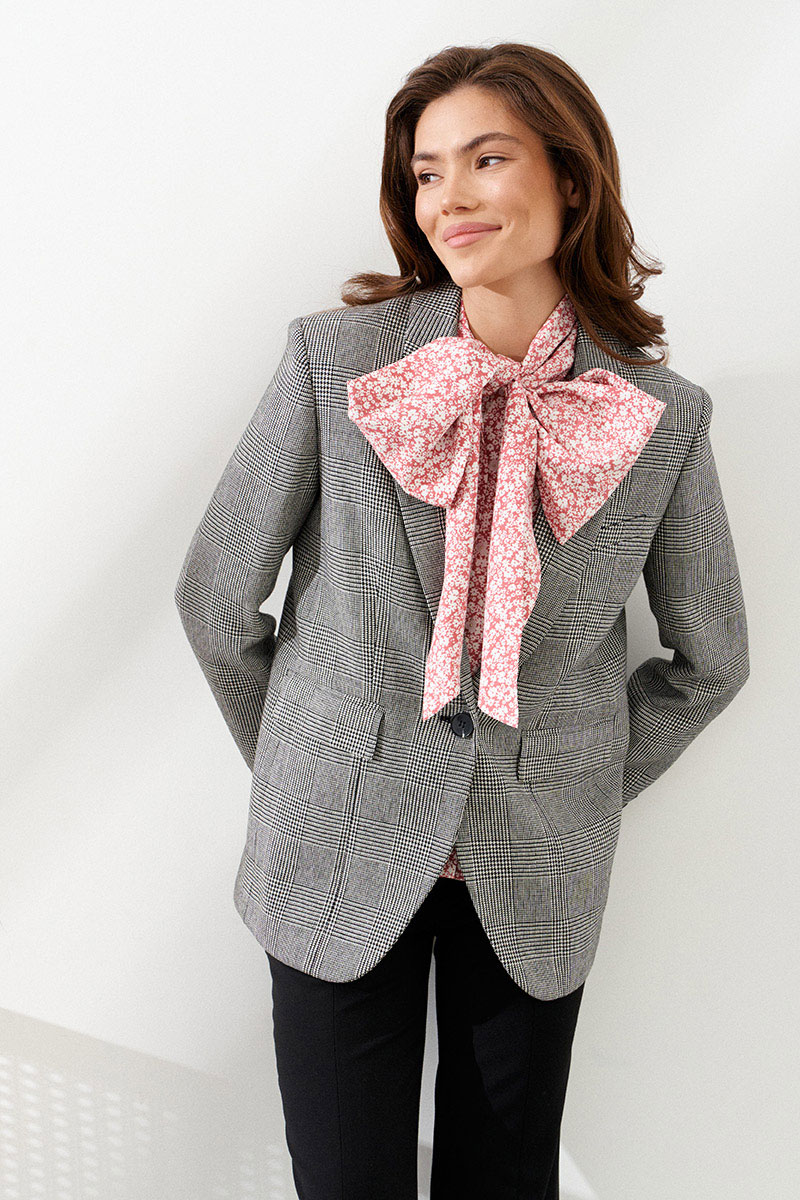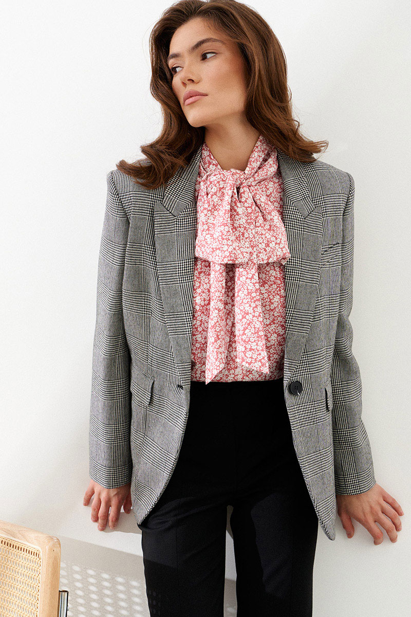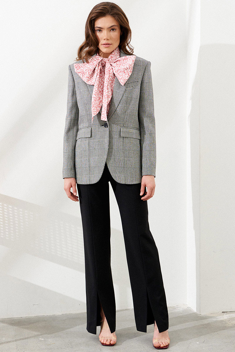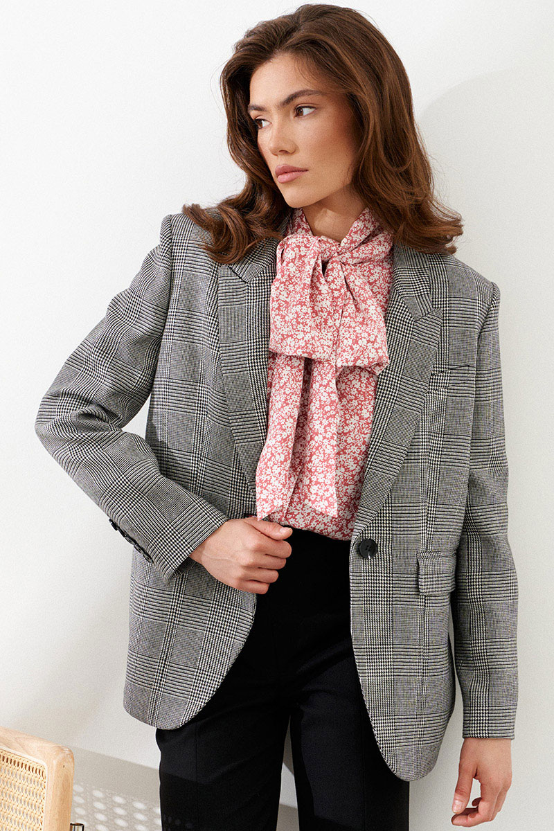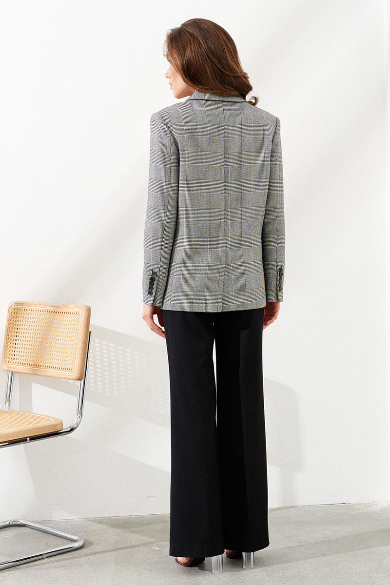 Жакет из шерсти в клетку. Рукав втачной со шлицами. По переду прорезные карманы с клапанами. Застежка центральная на петлю и пуговицу. Воротник пиджачный, спинка со средним швом и шлицей. Жакет на подкладке.