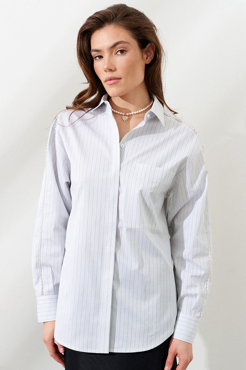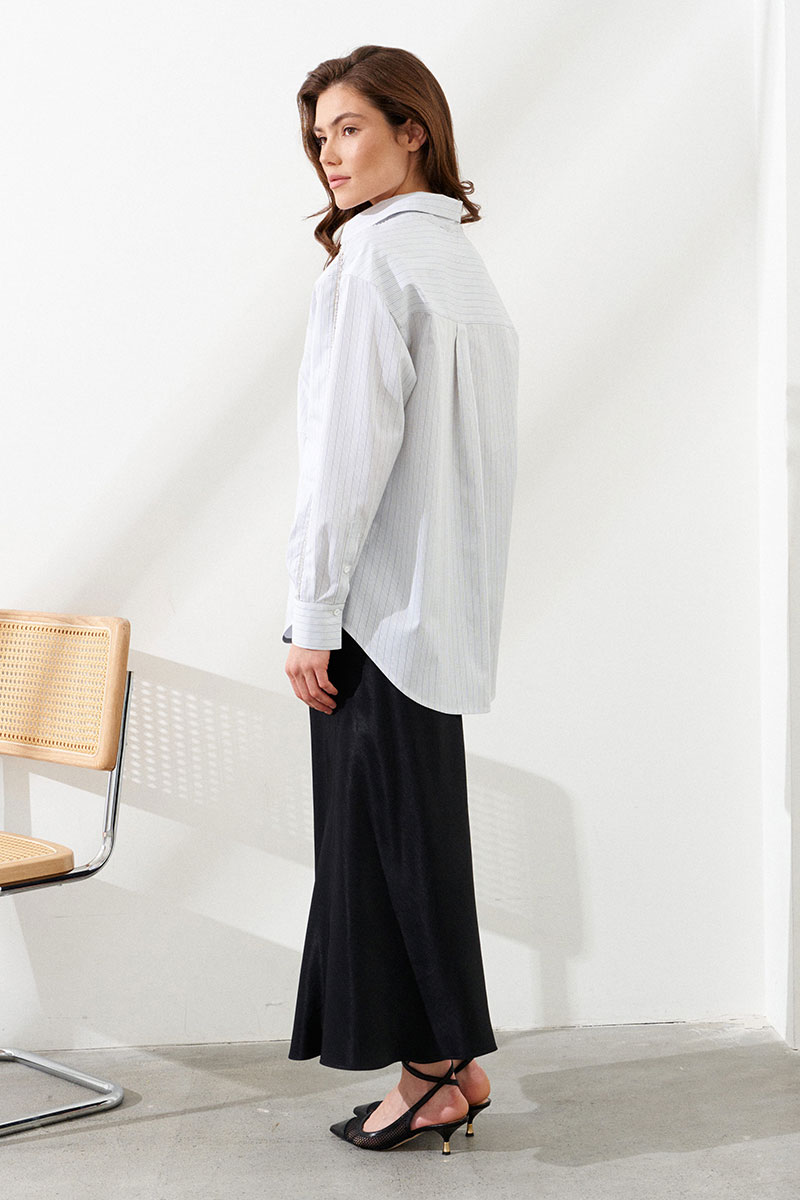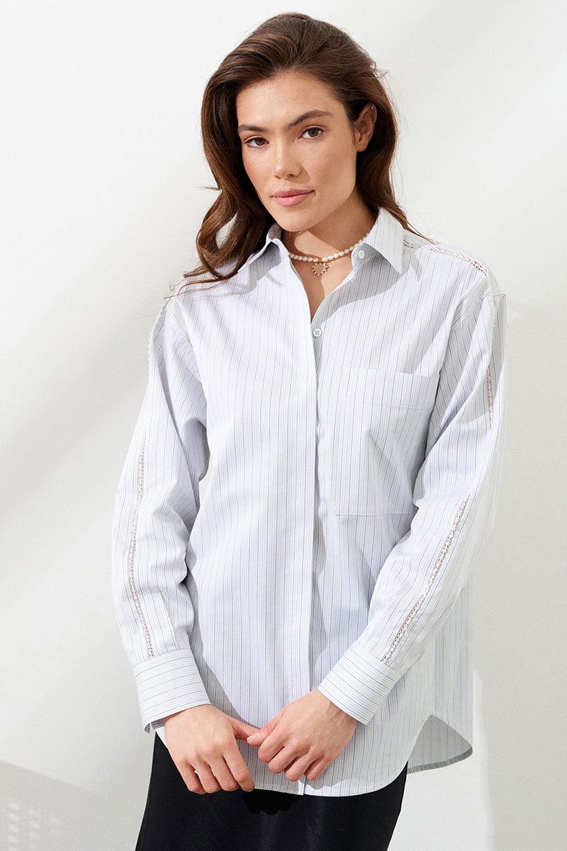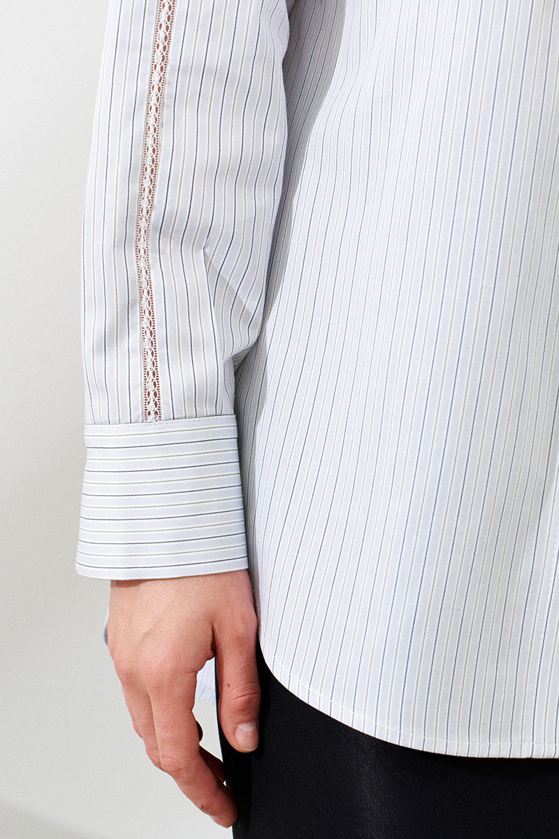 Объемная блузка. Рубашечный покрой рукава с тесьмой, украшенной бисером. Застежка потайная на петли и пуговицы. Левая половина переда с накладным карманом. Спинка с отрезной кокеткой и складкой. Воротник рубашечный. Манжета рукава с планкой и застежкой на пуговицы.