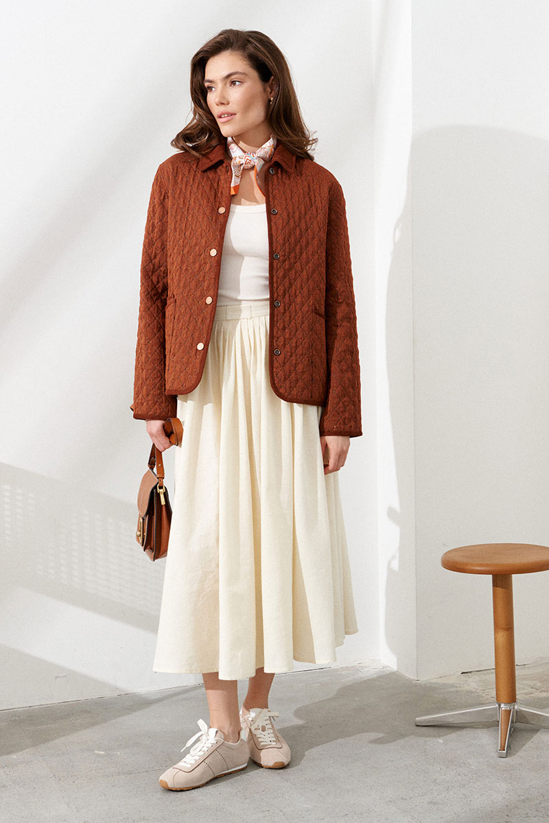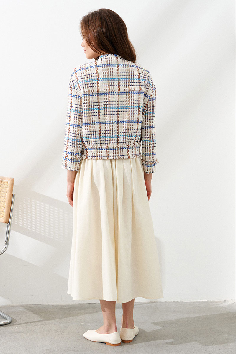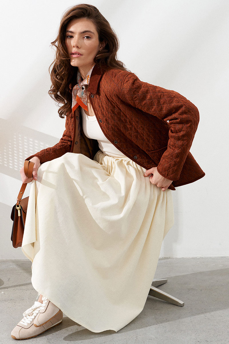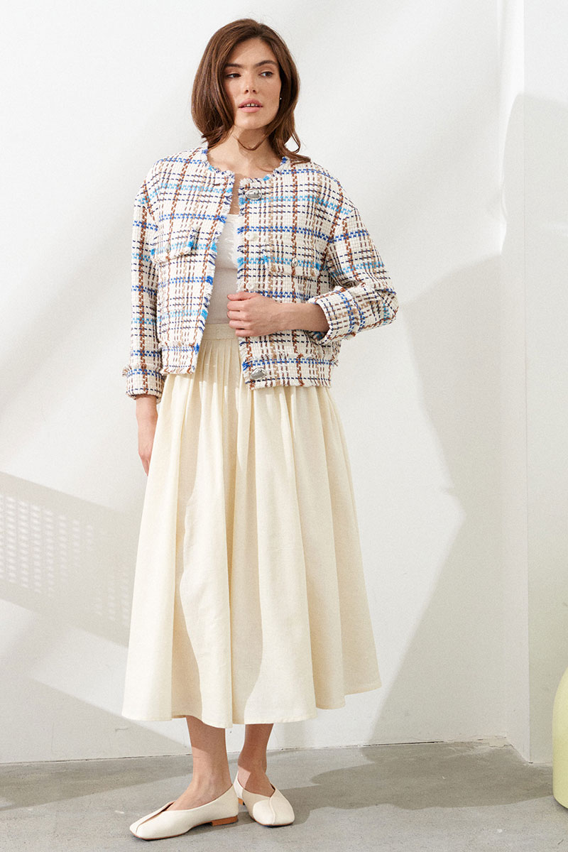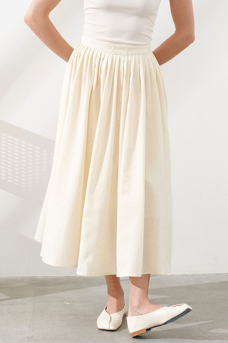 Юбка изо льна с притачным поясом. По верхнему срезу юбки заложены равномерные складки. Застежка на потайную тесьму-молнию.
