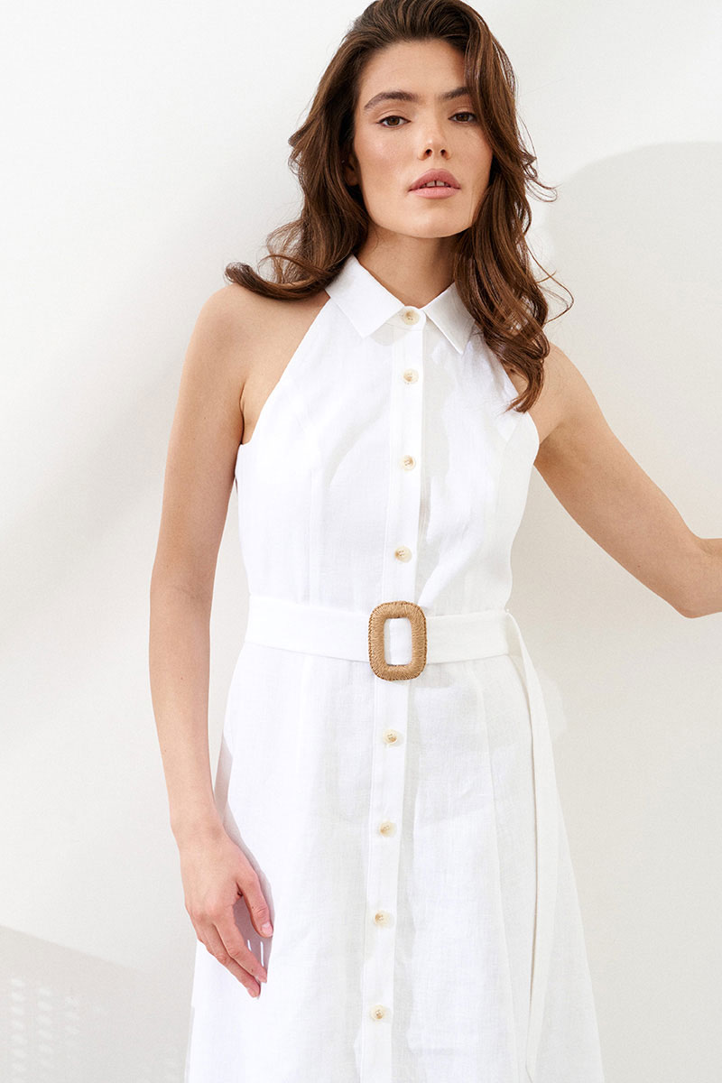 Льняное платье, отрезное по линии талии. Перед с центральной застежкой по планке на петли/пуговицы. Воротник со стойкой. Платье на подкладке. Съемный пояс с пряжкой в комплекте.