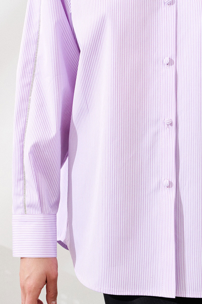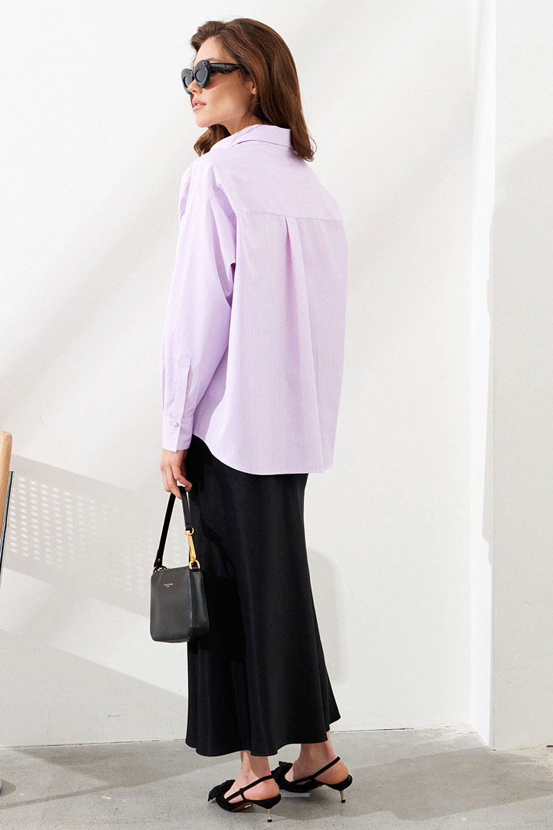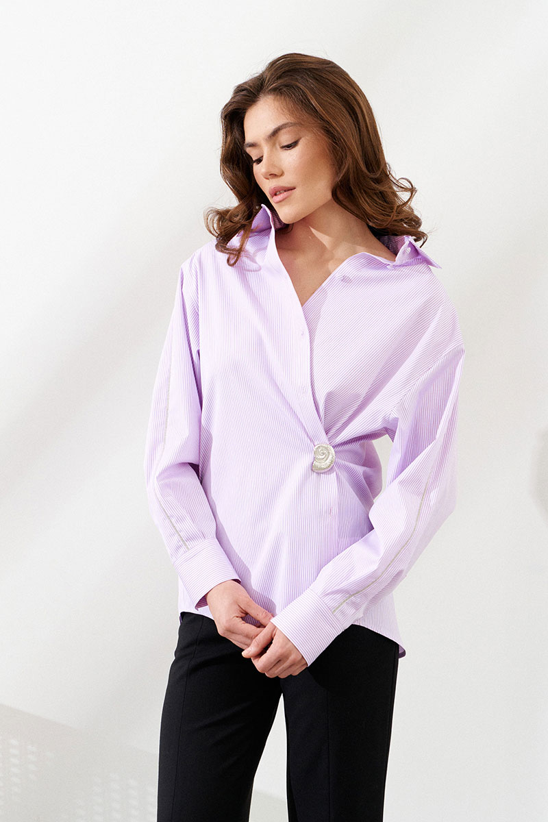 Объемная блузка. Рубашечный покрой рукава с тесьмой «мониль». Застежка центральная на петли и пуговицы. Спинка с отрезной кокеткой и складкой. Воротник рубашечный. Манжета рукава с планкой и застежкой на пуговицу. В боковом шве дополнительная пуговица, позволяющая застегивать блузку ассиметрично. Брошь в комплекте.