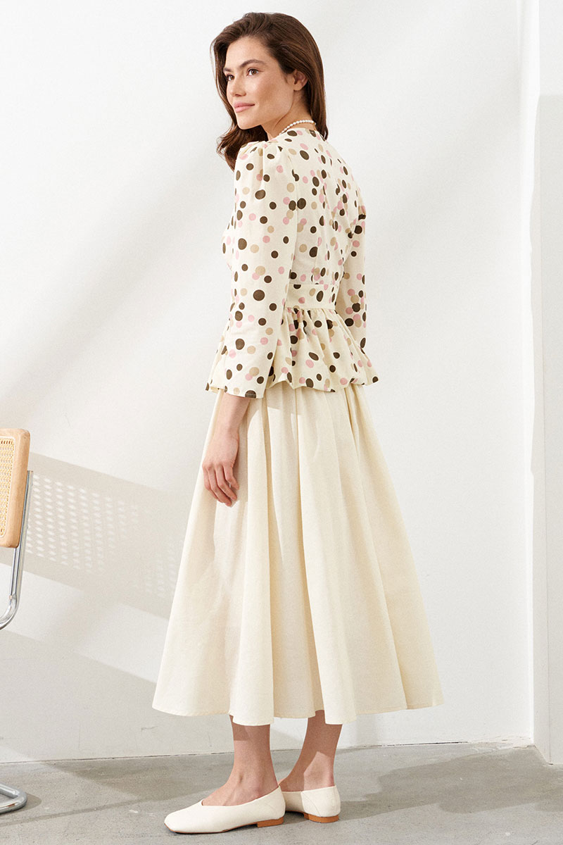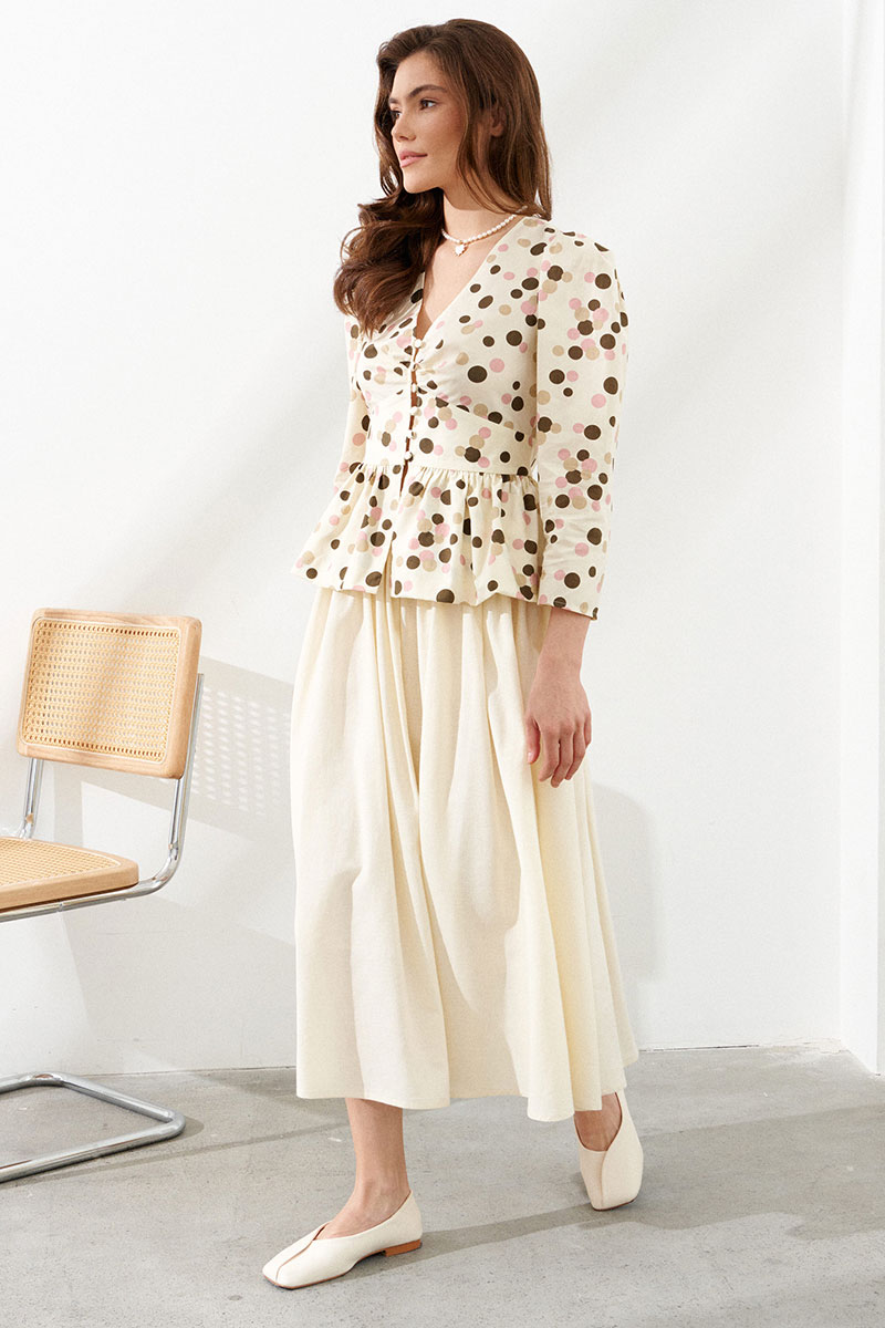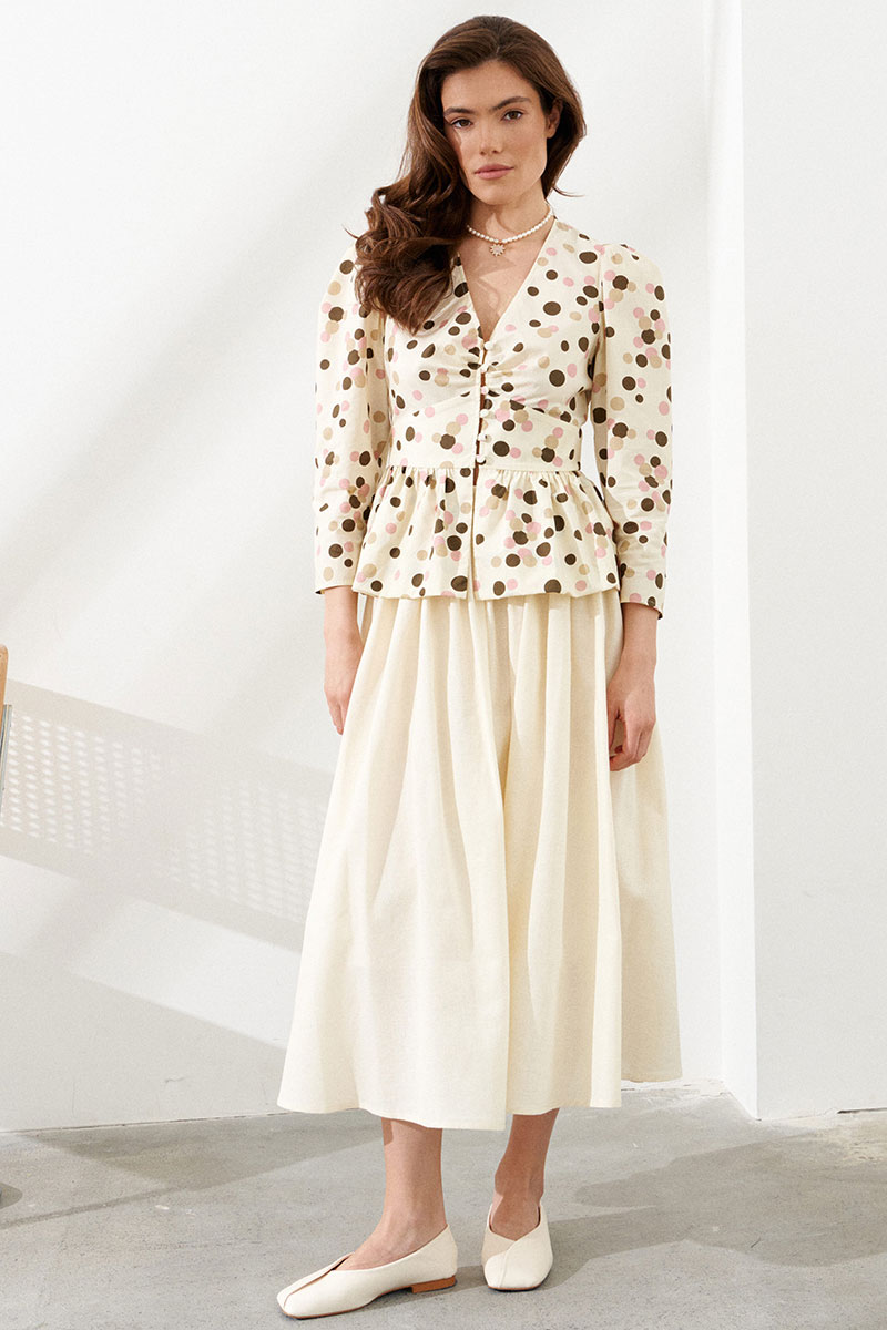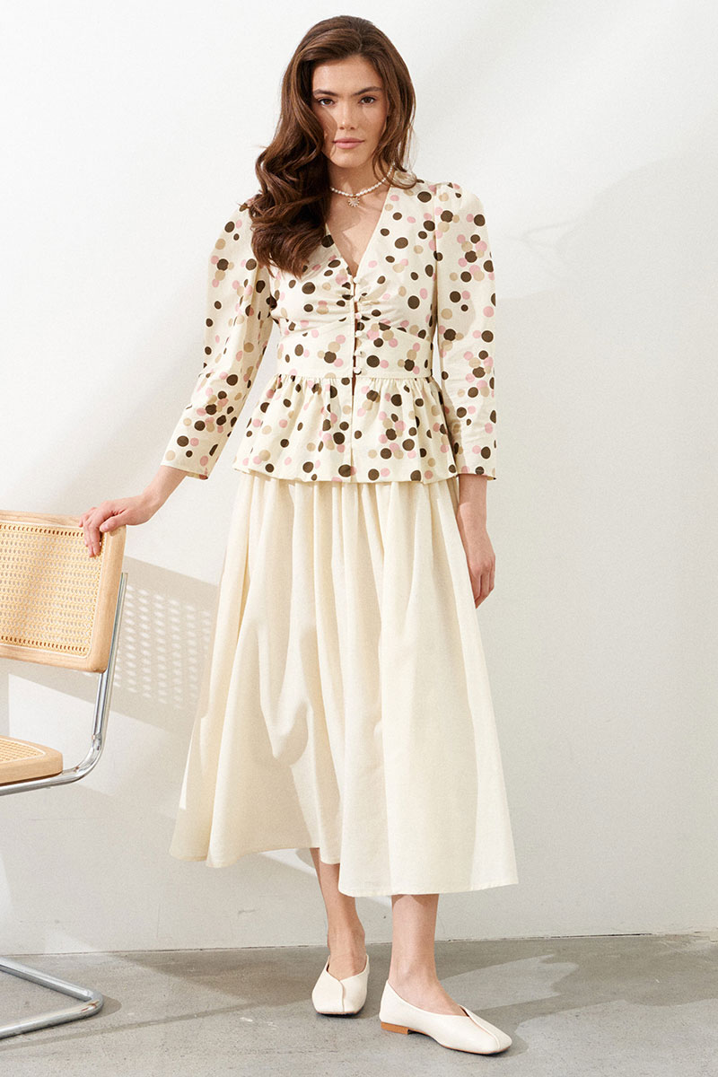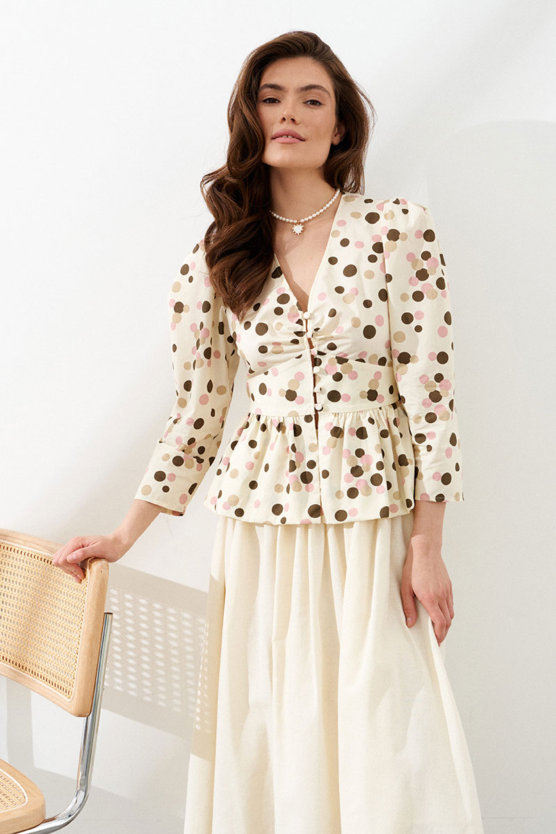Блузка прилегающего силуэта из поплина с отрезной кокеткой под грудью. Застежка центральная на навесные петли и пуговицы. Рукав втачной со складками по окату и зауженный к низу. Вырез горловины треугольный. Низ блузки с двойной баской.