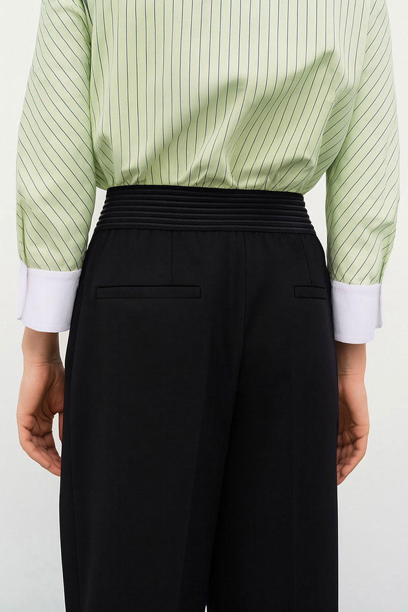 Передние половинки брюк с односторонними складками и наклонными карманами. Декоративный эластичный пояс. Имитация карманов с листочками по заднему полотнищу брюк. Имитация застежки-гульфик.