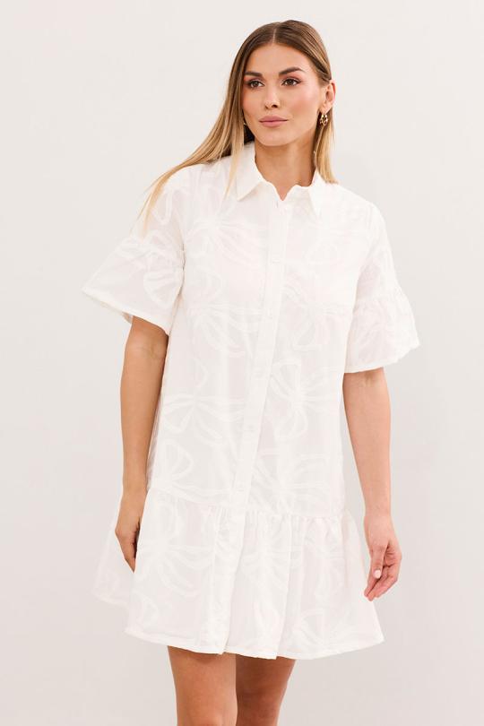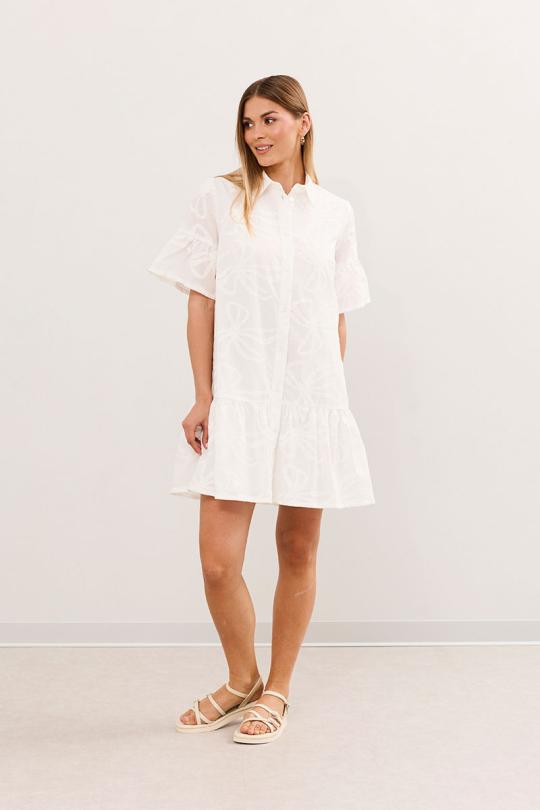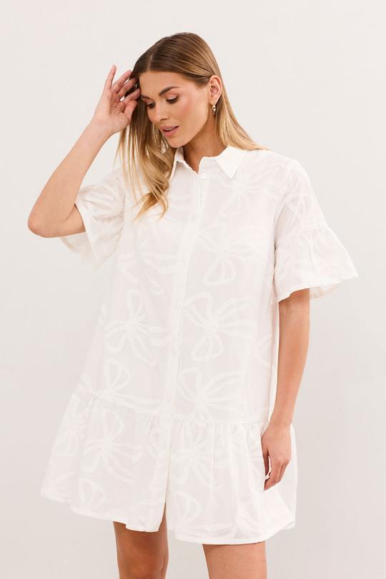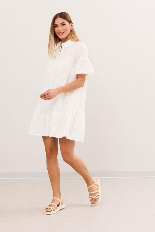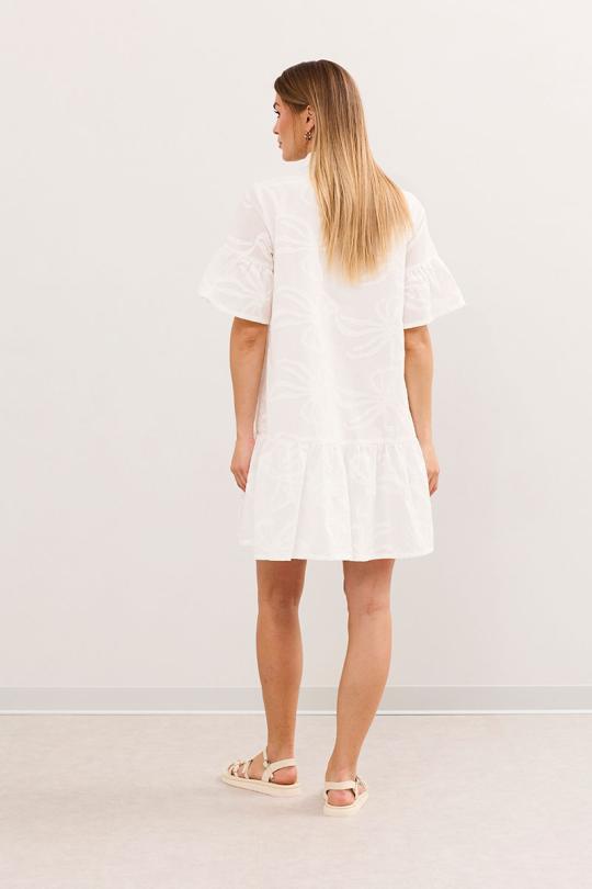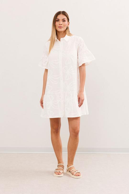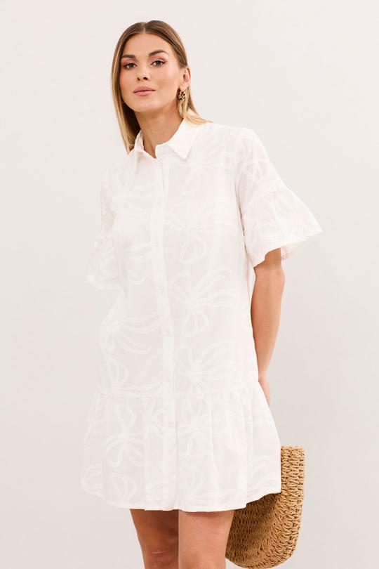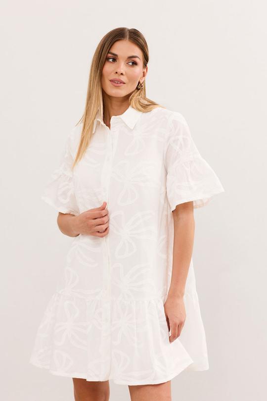 Платье женское А-образного силуэта на подкладке. Выполнено из хлопкового ришелье. Платье распашное с центральной застежкой в виде планки на петли и пуговицы. Горловина оформлена рубашечным воротником. Рукав втачной одношовный с оборкой. По линии бедер подрез, куда притачена оборка.