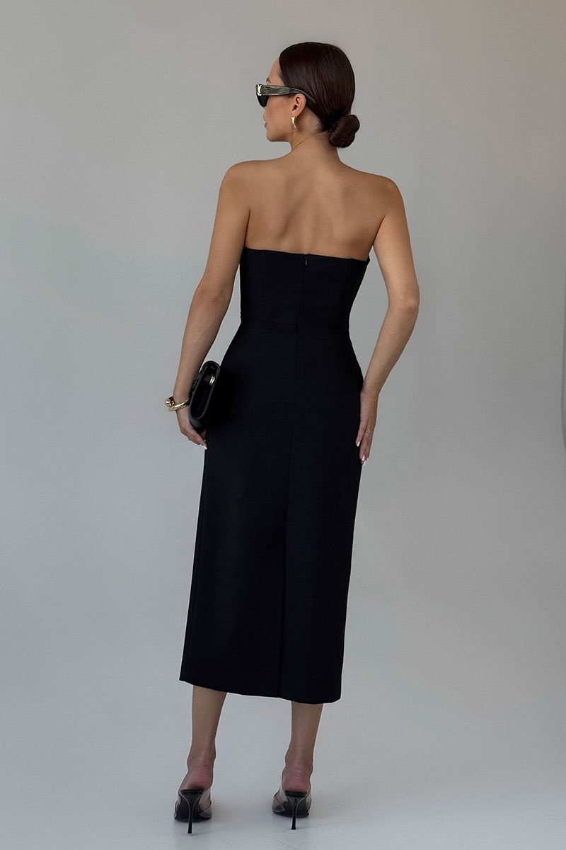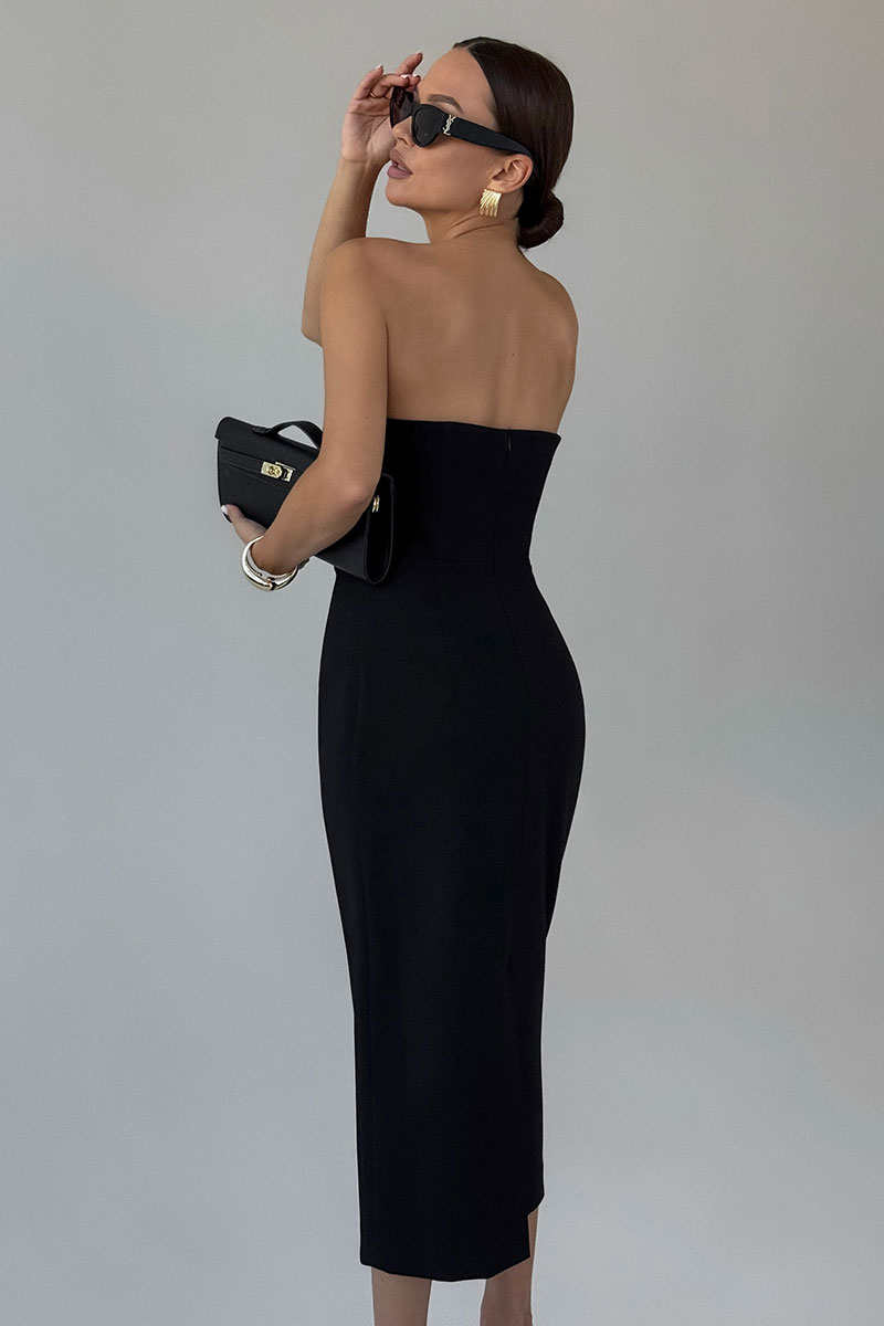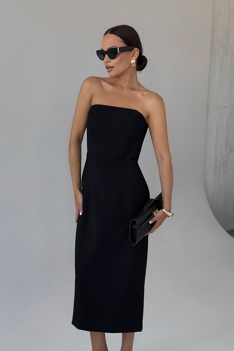 Платье женское, приталенного силуэта, на подкладке. Верхняя часть платья в виде корсета. Застежка в виде молнии по средней линии спинки. Сзади платья шлица.