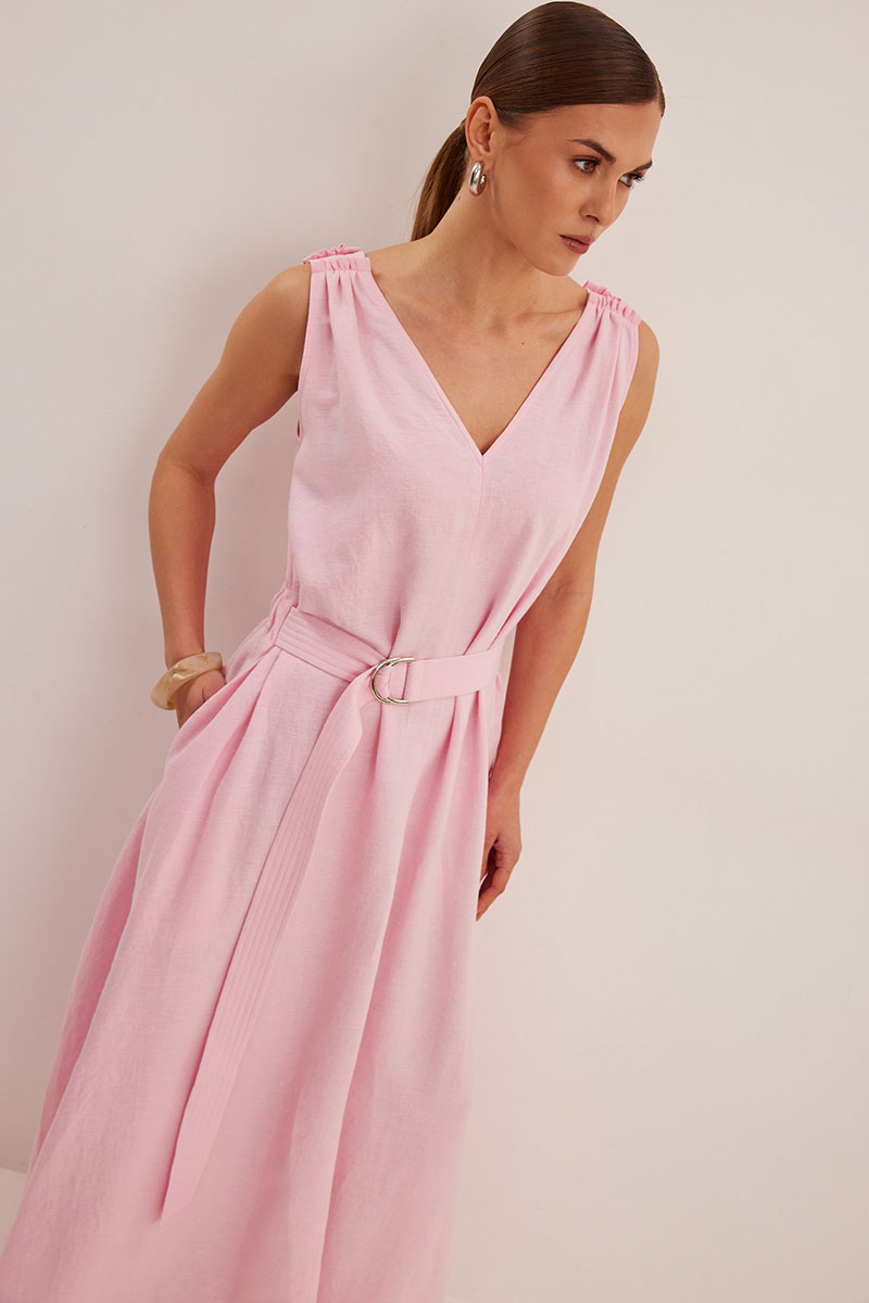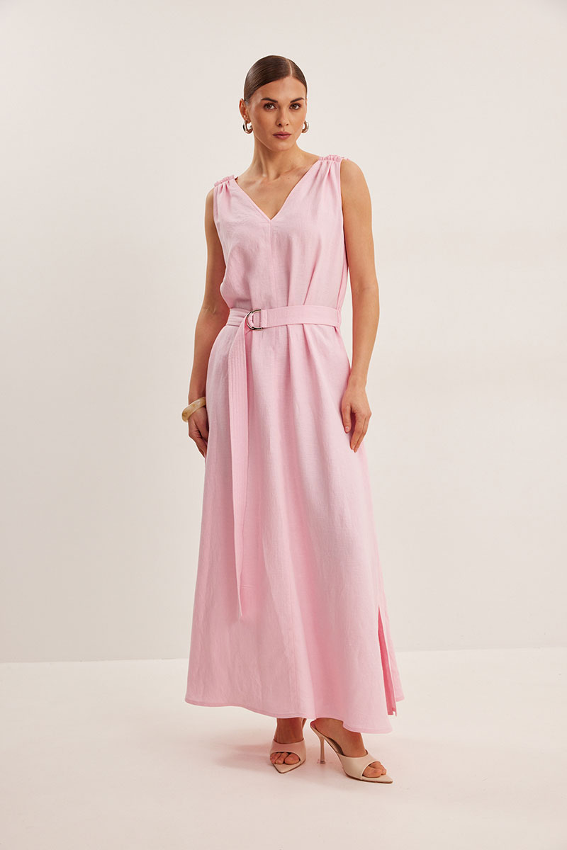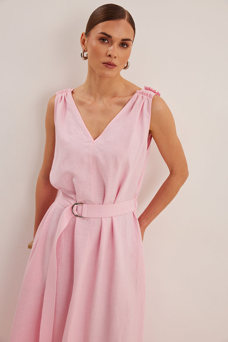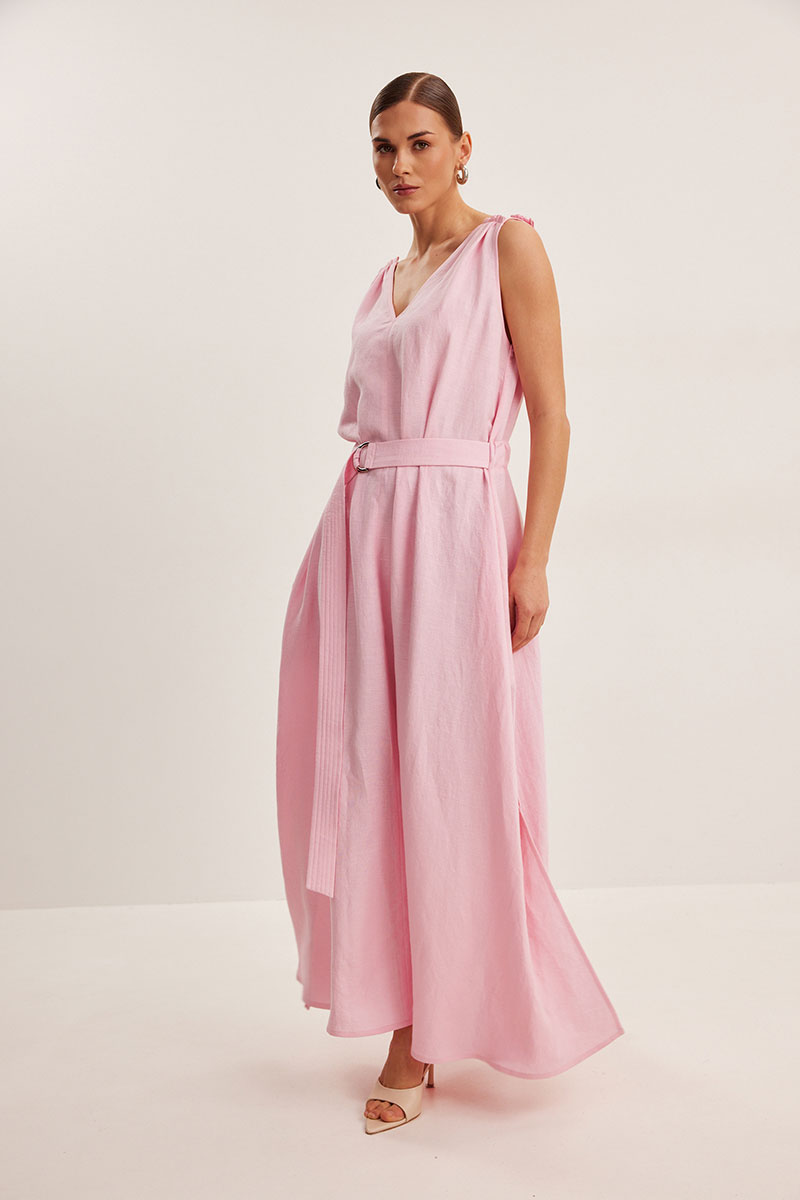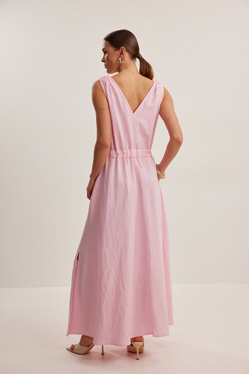 Платье женское, свободного А -силуэта. Выполнено из смесового льна. Горловина оформлена Y-образным вырезом с отделкой в области плеча. По боковым швам функциональные карманы, сзади по талии кулиса с резинкой. В боковые швы пришит пояс с полукольцами, снизу разрезы.