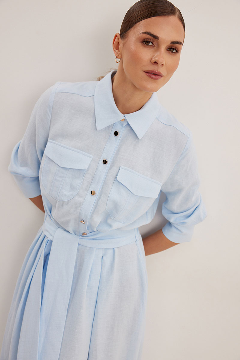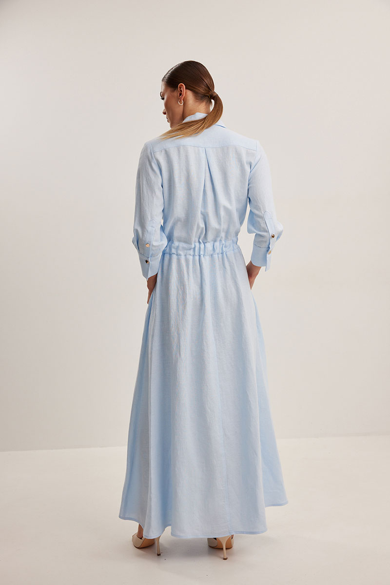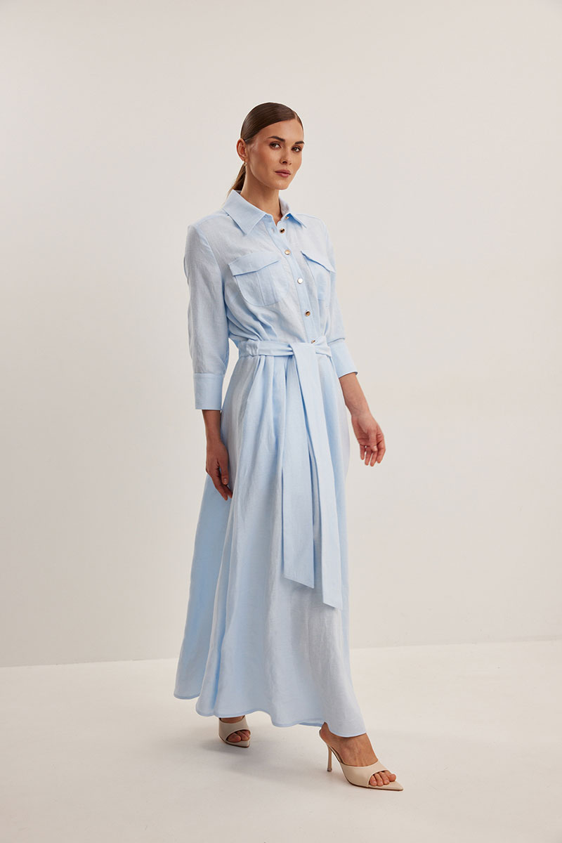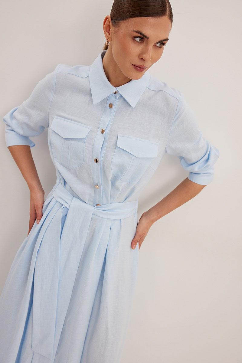 Платье женское, приталенного силуэта. Выполнено из смесового льна. Рукав втачной одношовный с манжетой и шлицей. Застежка центральная в виде планки на петли и пуговицы. Сзади по талии кулиса с резинкой, в боковые швы пришит пояс. Платье расширено к низу, отрезное по линии талии. В боковых швах функциональные карманы.