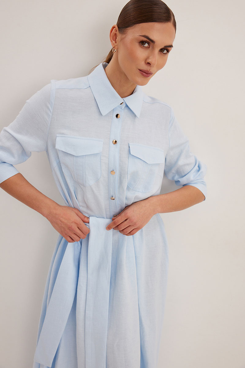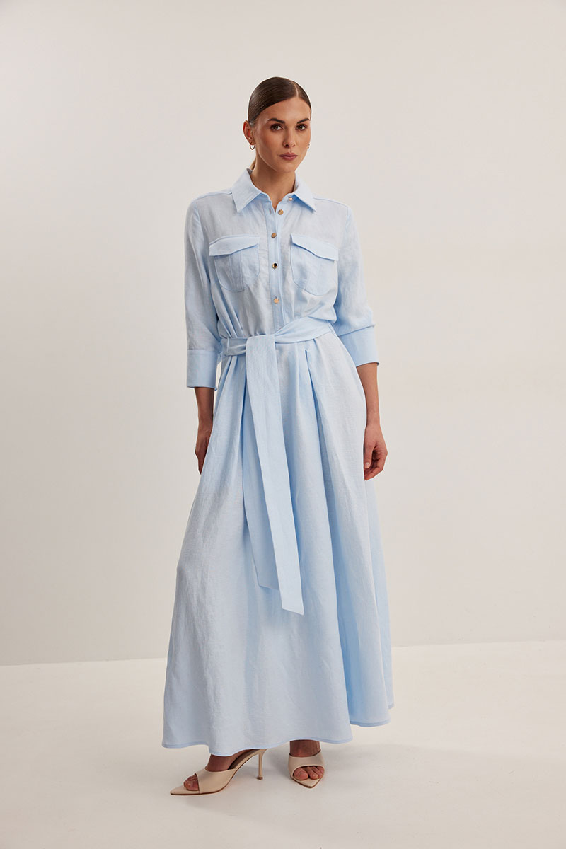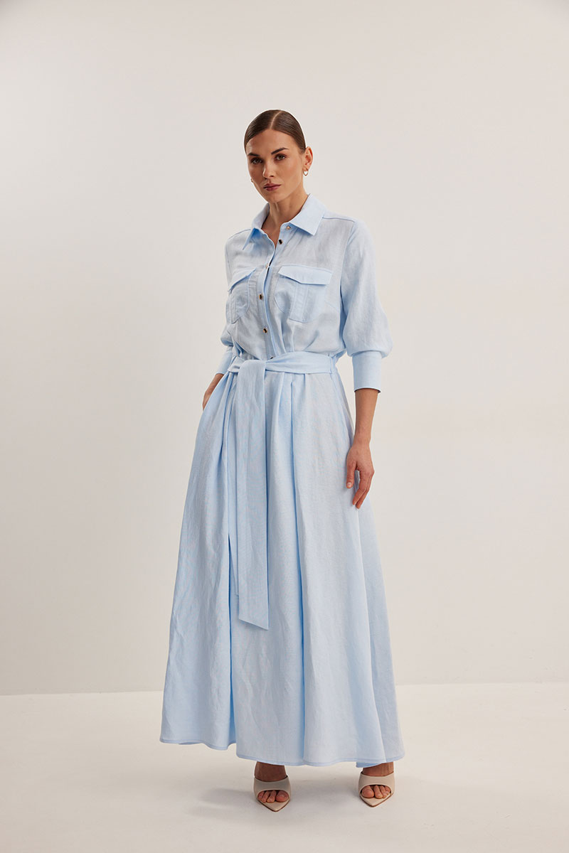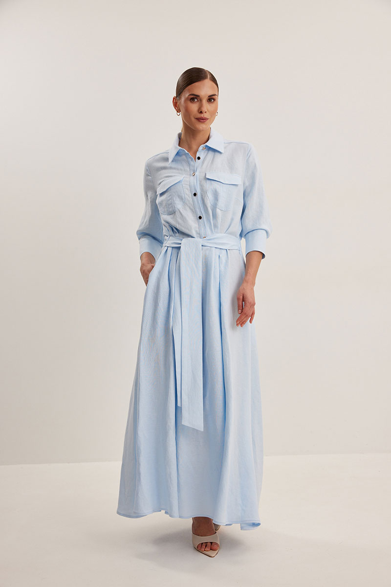Платье женское, приталенного силуэта. Выполнено из смесового льна. Рукав втачной одношовный с манжетой и шлицей. Застежка центральная в виде планки на петли и пуговицы. Сзади по талии кулиса с резинкой, в боковые швы пришит пояс. Платье расширено к низу, отрезное по линии талии. В боковых швах функциональные карманы.
