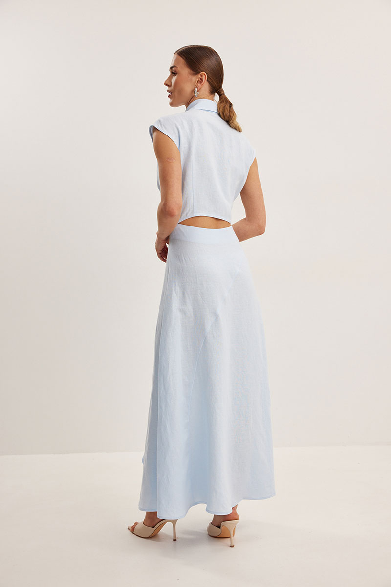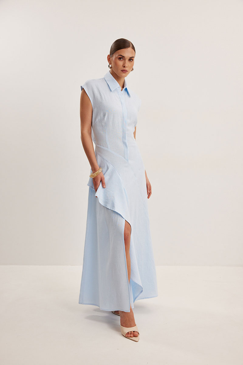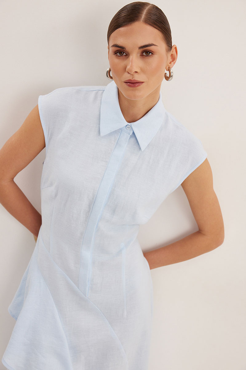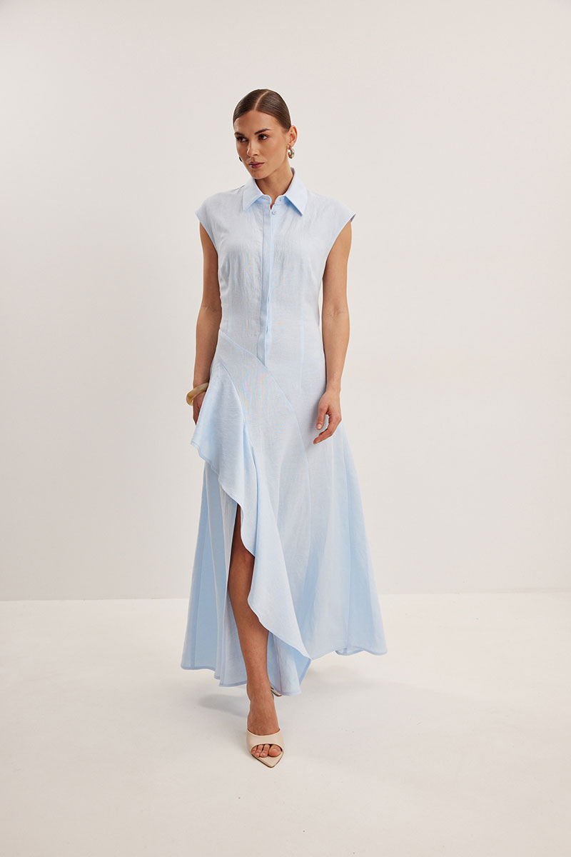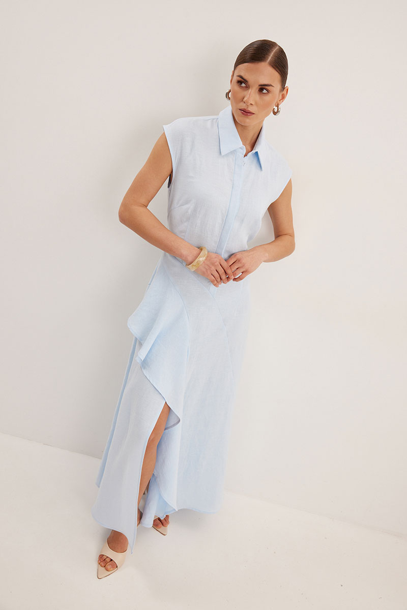 Платье женское, приталенного силуэта. Выполнено из смесового льна. Линия плеча слегка спущена. Застежка центральная в виде потайной планки. Воротник рубашечного типа с отрезной стойкой. Спереди платья асимметричный подрез с воланом. По спинке в области талии вырез оригинальной формы.