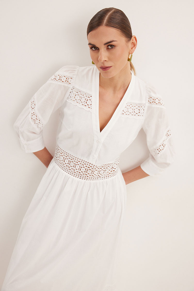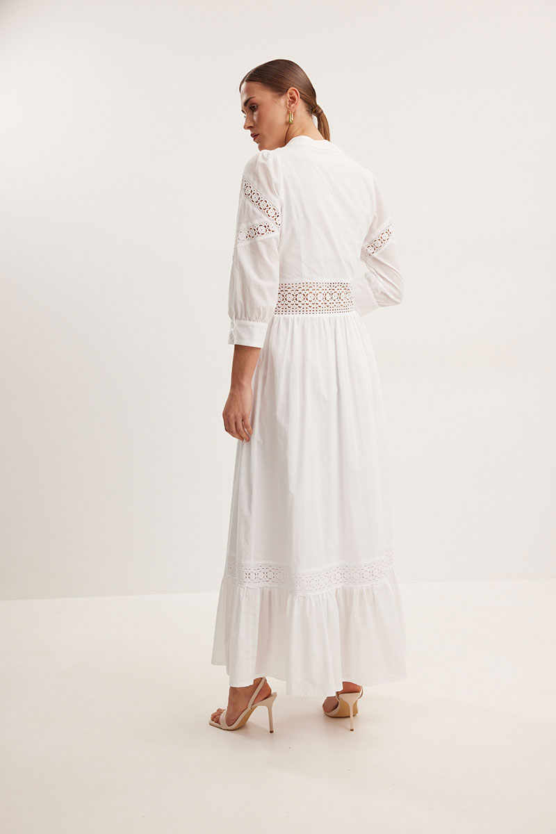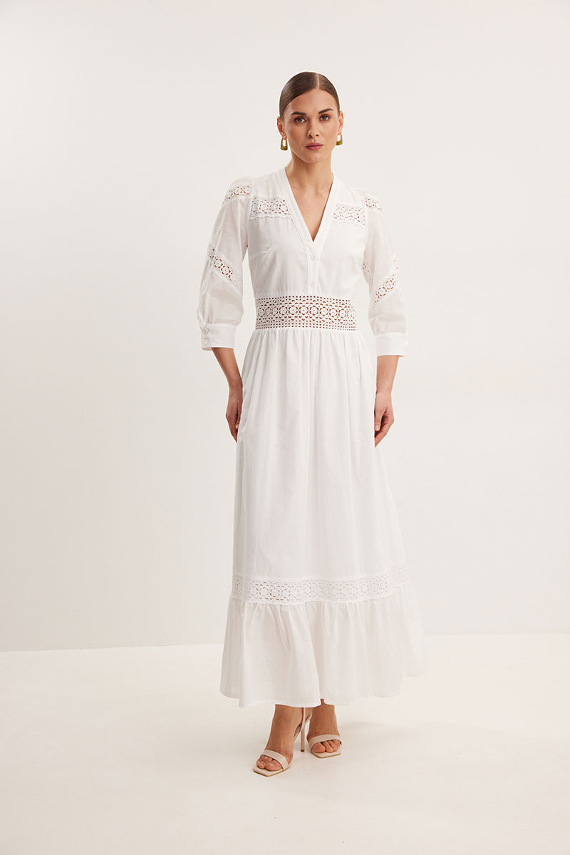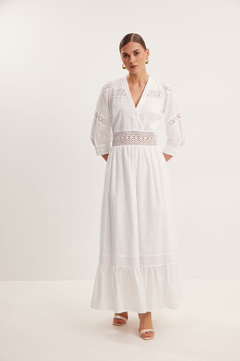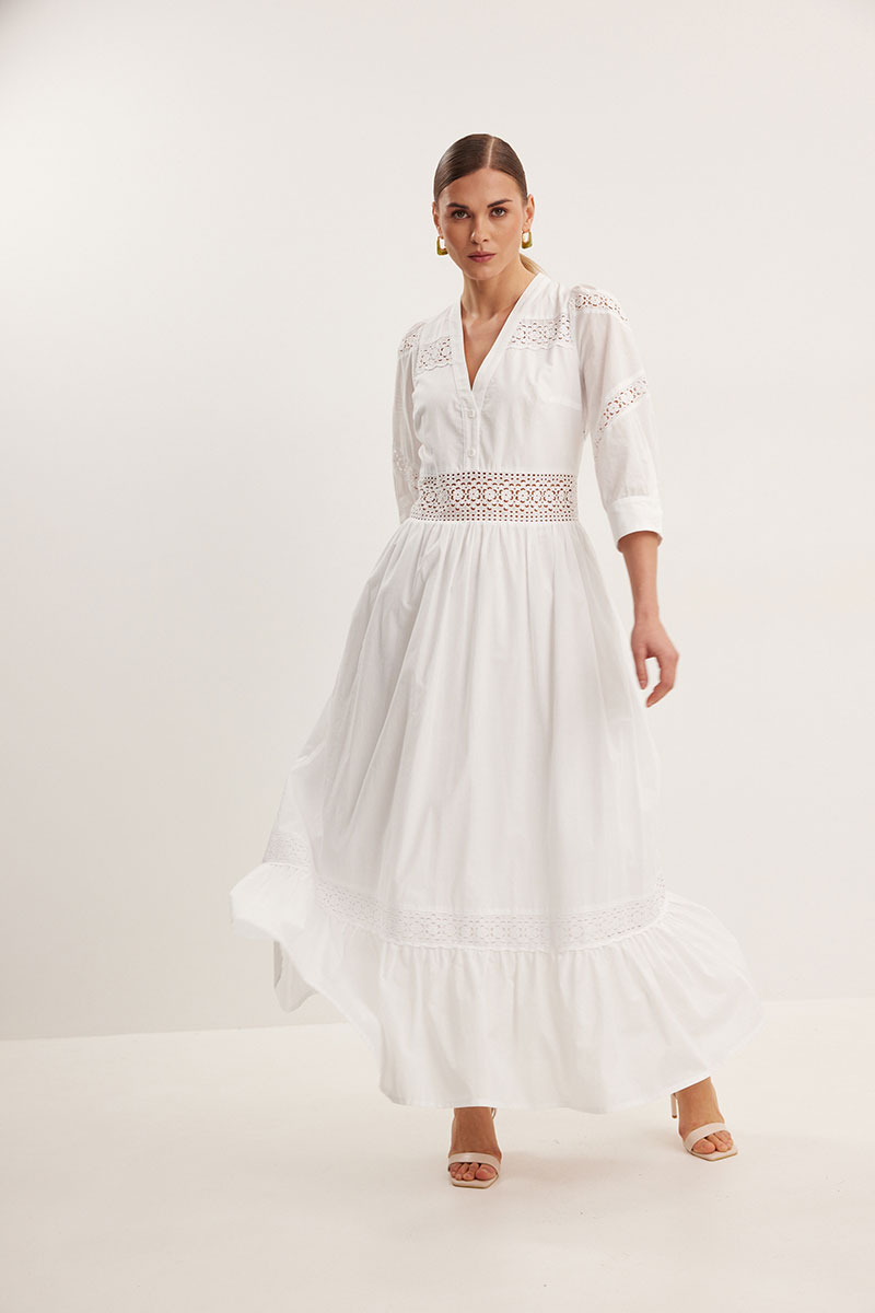 Платье женское, приталенного силуэта. Выполнено из двух типов ткани: однотонного хлопка и ришелье, очень приятных на ощупь. Горловина оформлена Y-образным вырезом с отделкой из ришелье. Платье отрезное под грудью. Нижняя часть платья также с отделкой и оборкой. По боковым швам функциональные карманы, платье на хлопковой подкладке. Рукав втачной одношовный с вставками из ришелье. Низ рукава обработан притачной манжетой с пуговицами. Застежка боковом шве на потайную молнию.