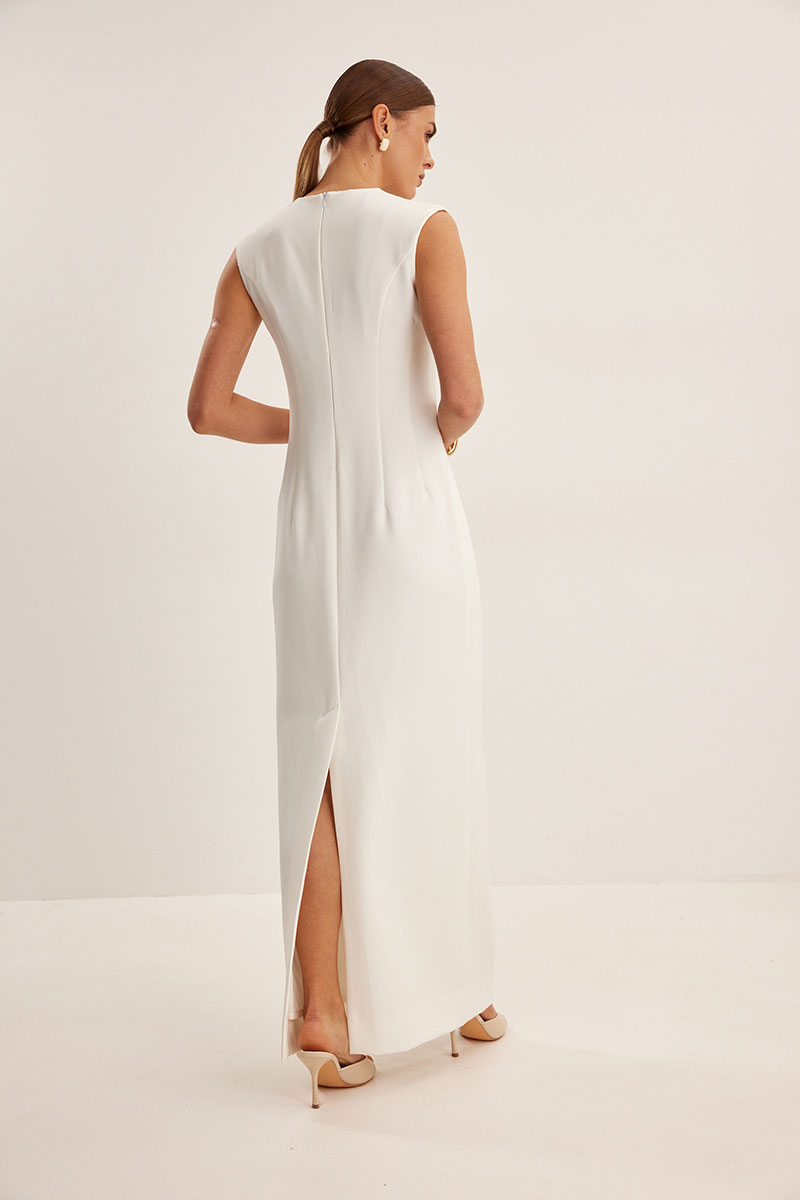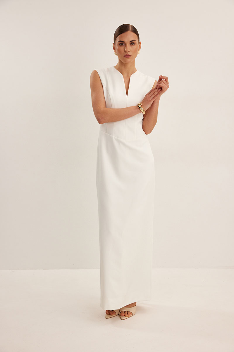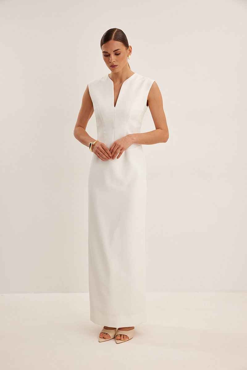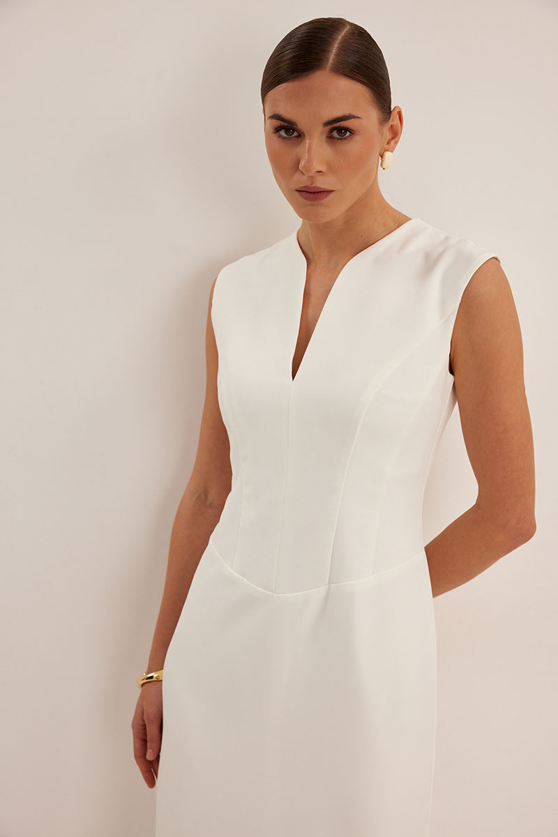 Платье женское, приталенного силуэта. Выполнено из плательно-костюмной ткани, платье на подкладк. Горловина платья оформлена оригинальным вырезом, застежка в виде потайной молнии в боковом шве. По спинке шлица в среднем шве, а также талиевые вытачки.