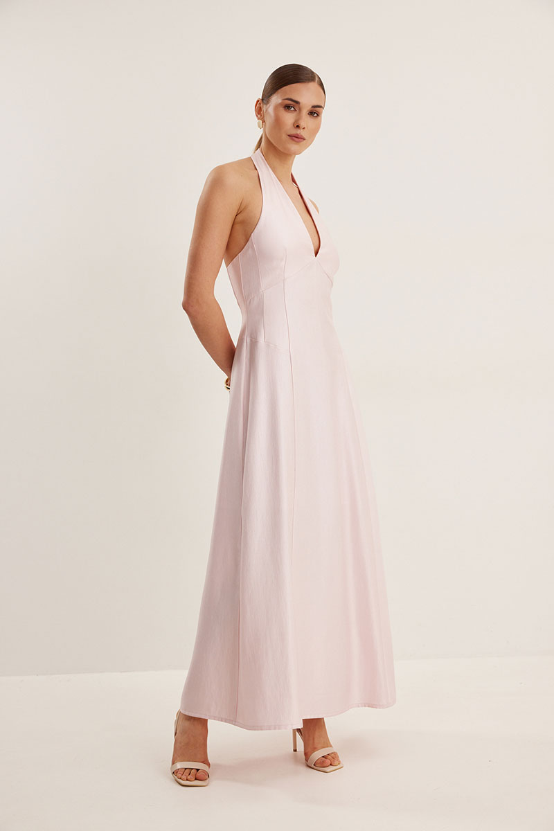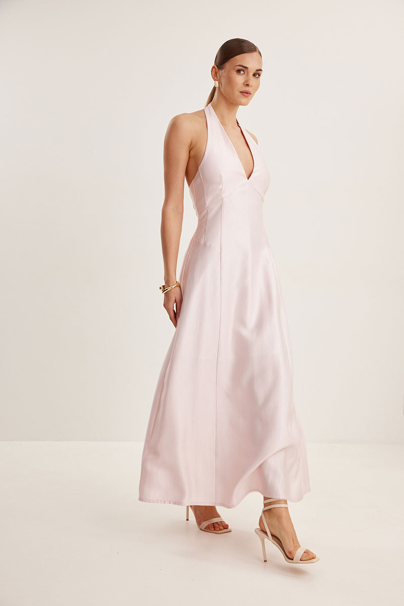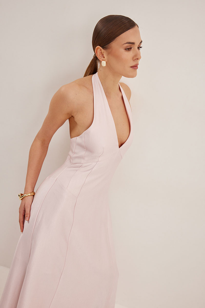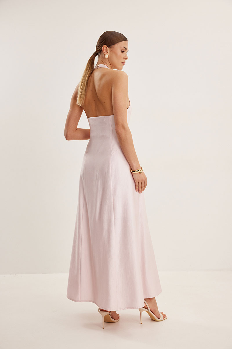 Платье женское, приталенного силуэта, на хлопковой подкладке. Горловина оформлена Y-образным вырезом, спина открыта. Застежка в виде потайной молнии в боковом шве и навесные петли с пуговицами сзади на шее. Платье расширено к низу , подрезы в области талии.