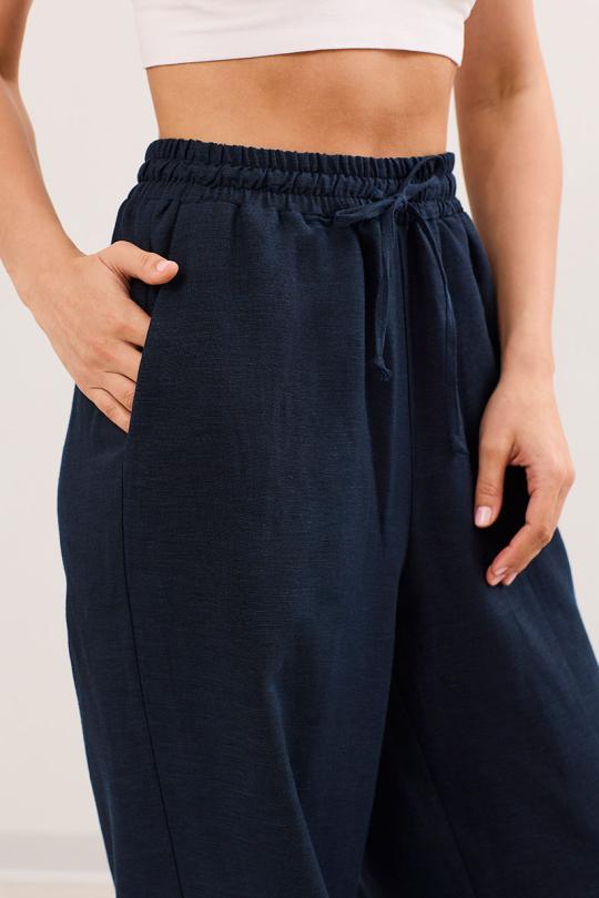 Брюки прямого свободного силуэта, верх брюк обработан притачным пясом с резинкой и кулисой. В верхней части брюк расположены карманы.