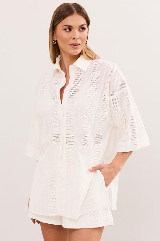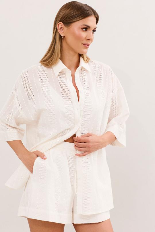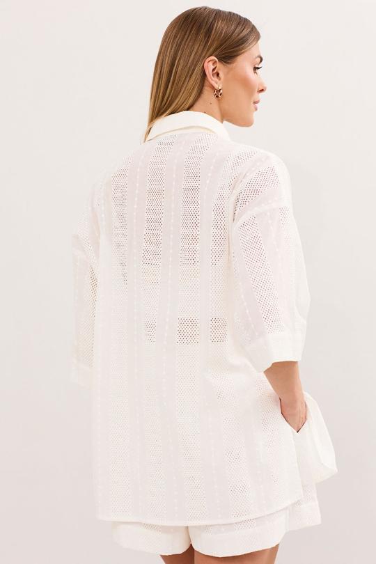 Комплект, состоящий из блузки и шорт свободного силуэта. Выполнен из ришелье.