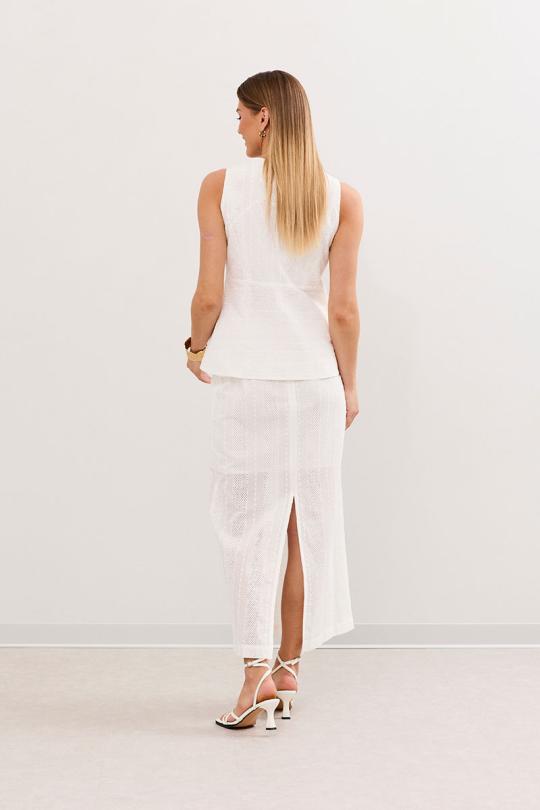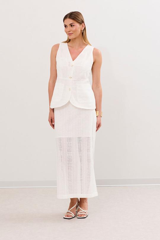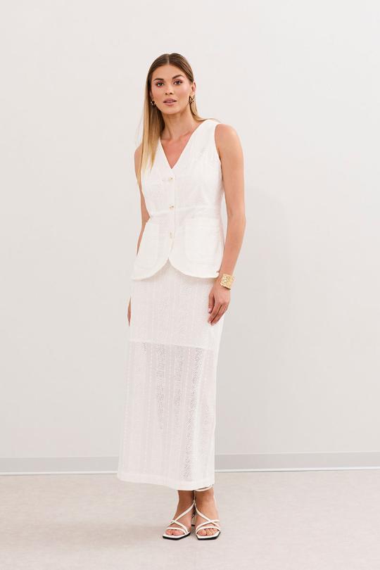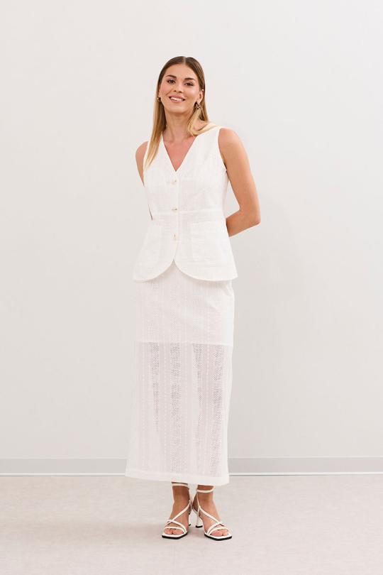 Комплект женский, состоящий из жилета и юбки. Комплект выполнен из ришелье.