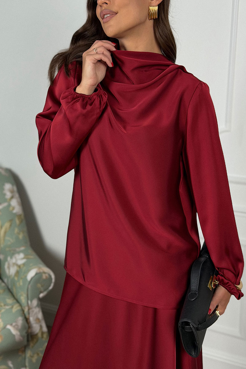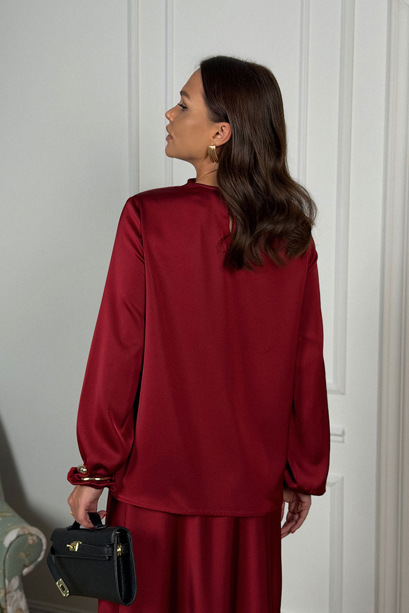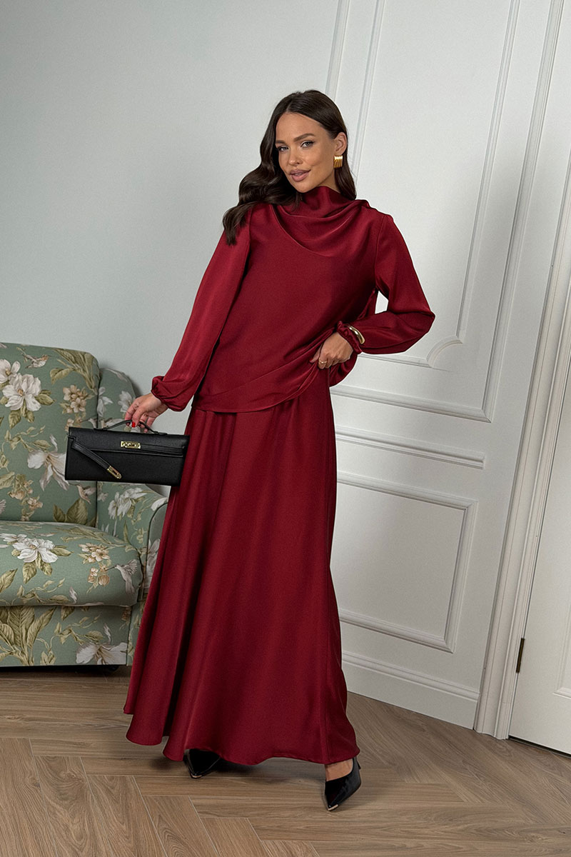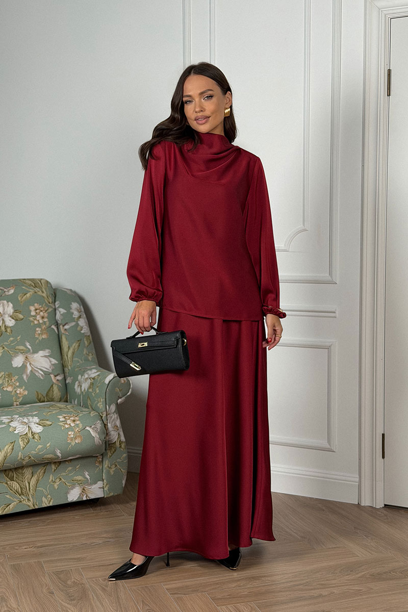 Комплект женский полуприлегающего силуэта, выполненный из исусственного шелка. орловина в виде драпировки, рукав втачной одношовный со сборкой внизу рукава. В верхней части спинки разрез с пуговицей.