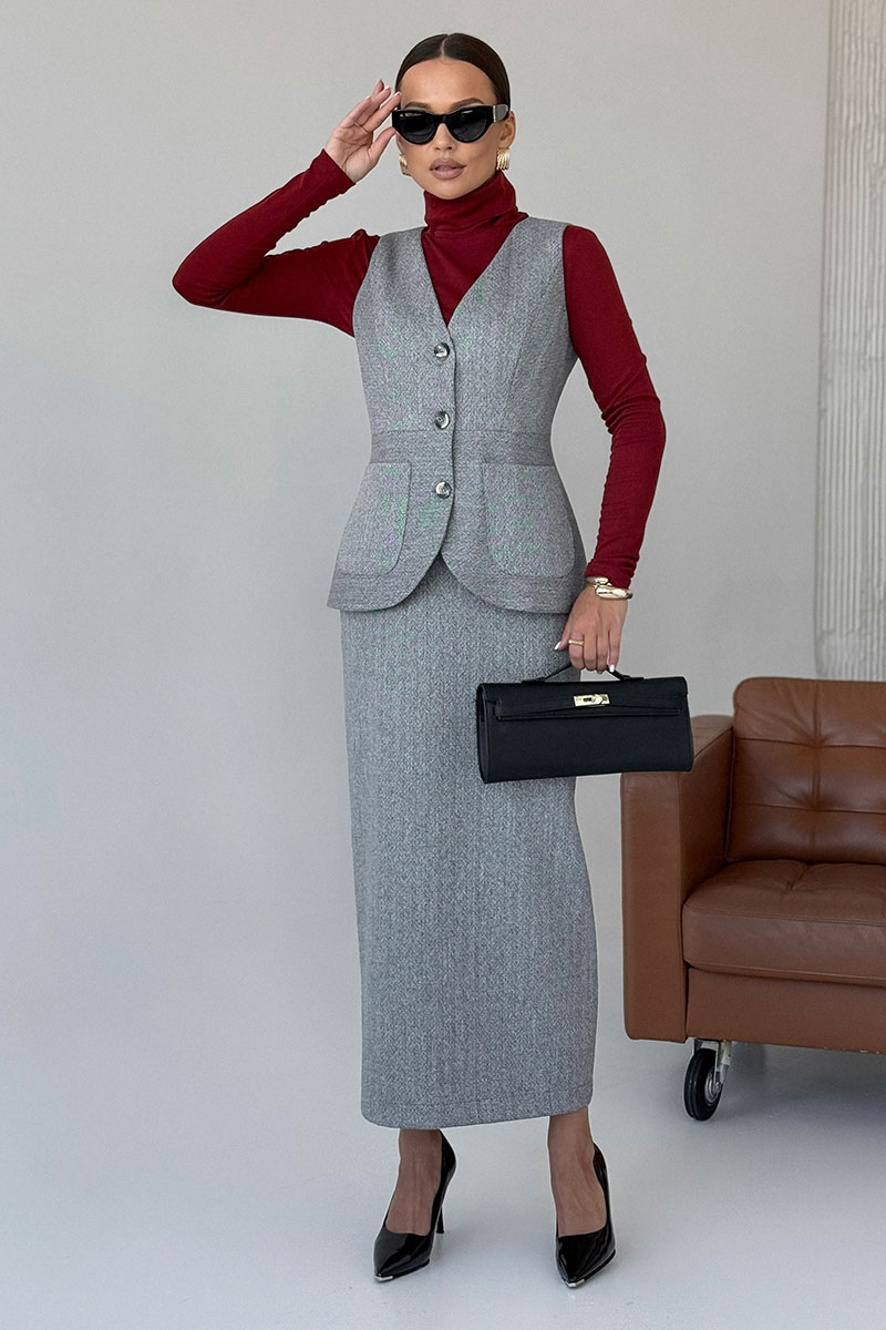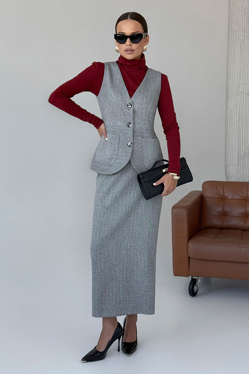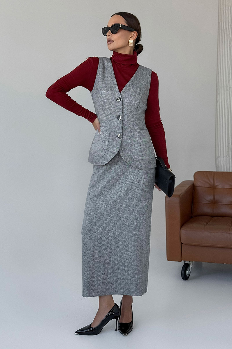 Костюм женский,состоящий из жилета и юбки. Костюм выполнен из плательно-костюмной ткани, жилет и юбка на подкладке.