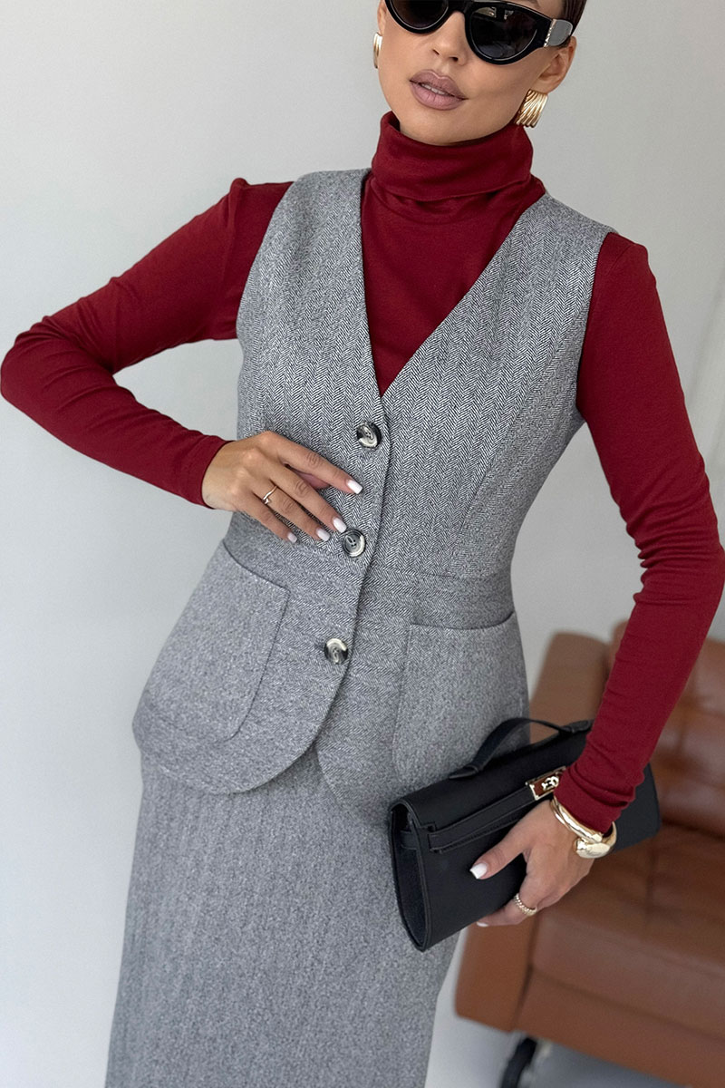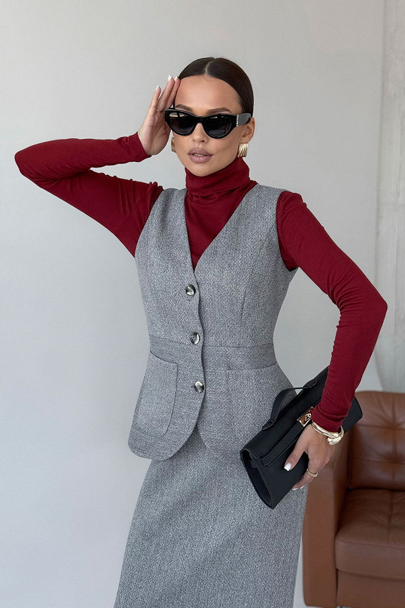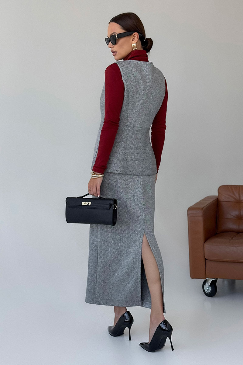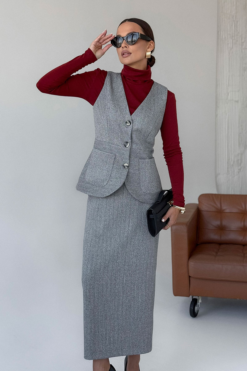 Костюм женский,состоящий из жилета и юбки. Костюм выполнен из плательно-костюмной ткани, жилет и юбка на подкладке.