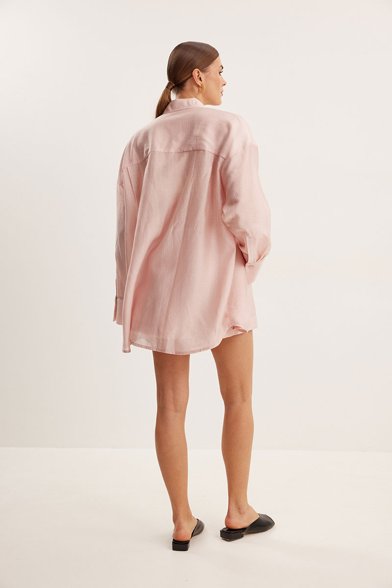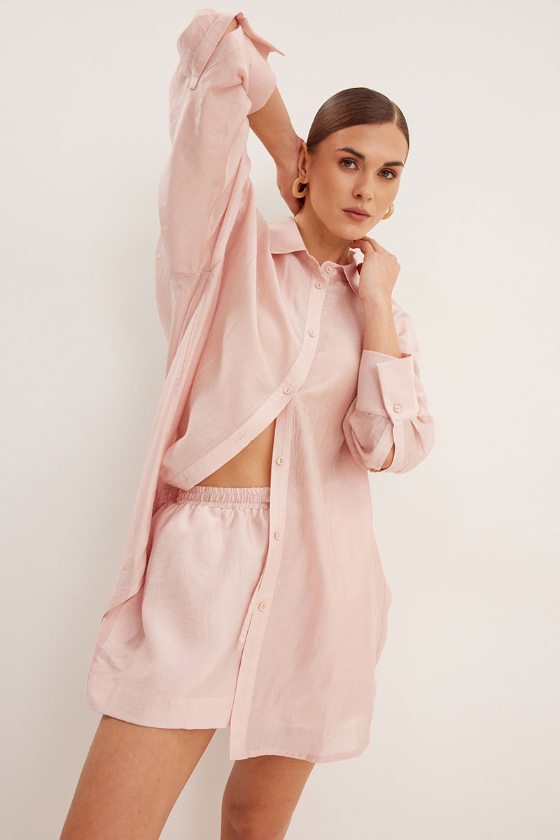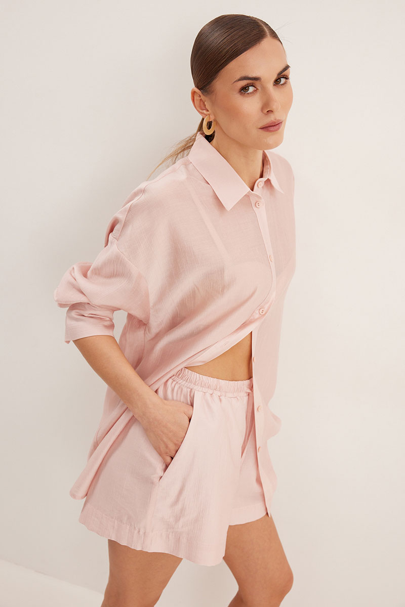 Комплект, состоящий из блузки и шорт свободного силуэта. Выполнен из полупрозрачной вуали. Воротник рубашечного типа, застежка центральная в виде планки на петли и пуговицы. Линия плеча спущена. Рукав с притачной манжетой и шлицей. Шорты свободного силуэта с функциональными карманами и хлопковой подкладкой. Верх шорт обработан притачным поясом с резинкой.